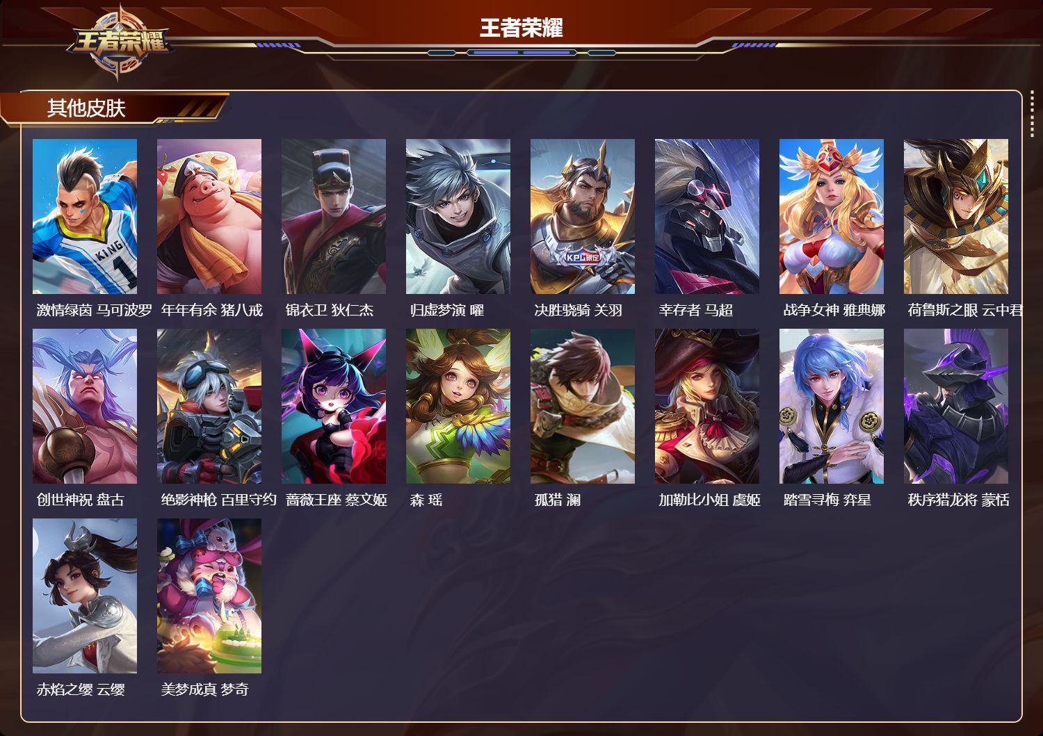【43,其他皮肤】沧流箭,伽罗,前尘,金蝉,三太子,哪吒,极冰防御线,盾山,龙域领主,铠,生化警戒,钟无艳,超能战警,曹操,未来旅行,孙膑,灼热之刃,李信,海之征途,孙策,木偶奇遇记,鲁班七号,帝国元帅,项羽,精灵王,后羿,绯红之刃,露娜,冰刃幻境,镜,海军大将,周瑜,魇语军师,司马懿,午夜歌剧院,元歌,启蛰,司空震,隐刃,兰陵王,花间舞,公孙离,街头旋风,裴擒虎,修竹墨客,上官婉儿,维京掠夺者,苍,归虚梦演,蒙犽,激情绿茵,马可波罗,年年有余,猪八戒,锦衣卫,狄仁杰,归虚梦演,曜,决胜骁骑,关羽,幸存者,马超,战争女神,雅典娜,荷鲁斯之眼,云中君,创世神祝,盘古,绝影神枪,百里守约,蔷薇王座,蔡文姬,森,瑶,孤猎,澜,加勒比小姐,虞姬,踏雪寻梅,弈星,秩序猎龙将,蒙恬,赤焰之缨,云缨,美梦成真,梦奇,