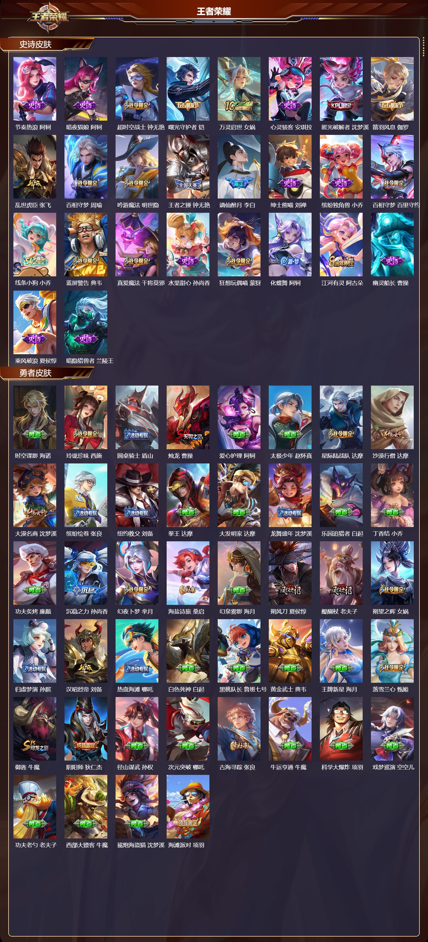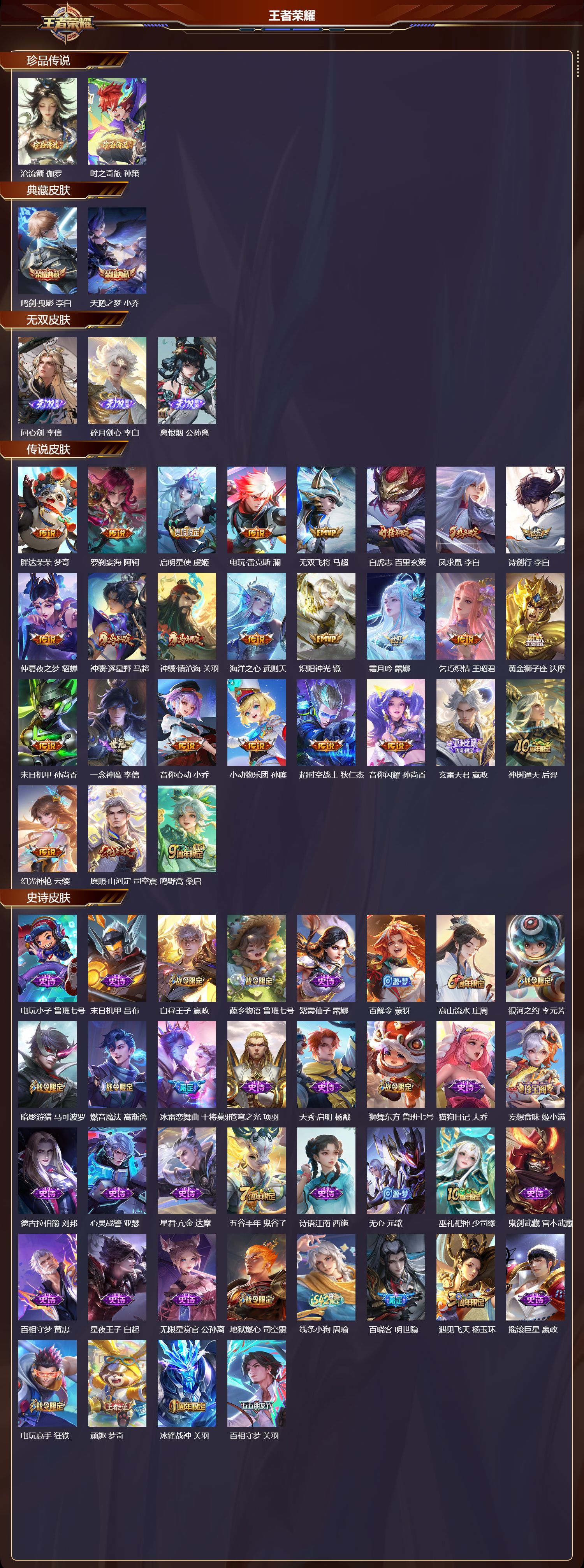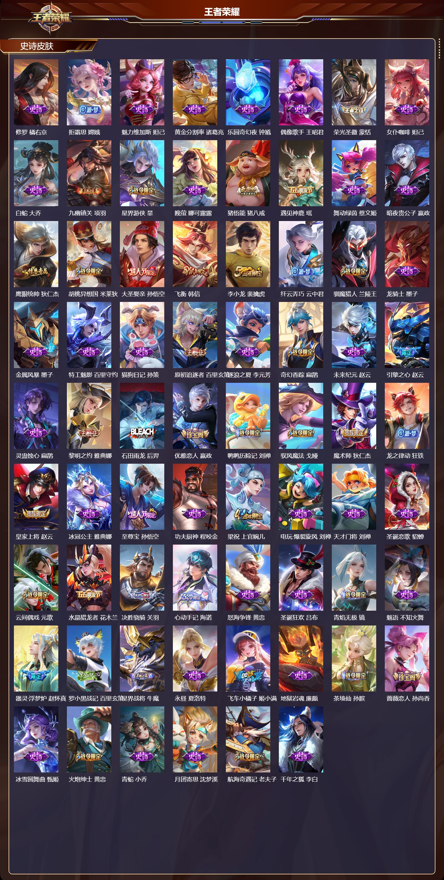 【132,史诗皮肤】电玩小子,鲁班七号,末日机甲,吕布,白昼王子,嬴政,蔬乡物语,鲁班七号,紫霞仙子,露娜,百解令,蒙犽,高山流水,庄周,银河之约,李元芳,暗影游猎,马可波罗,燃音魔法,高渐离,冰霜恋舞曲,干将莫邪,苍穹之光,项羽,天秀·启明,杨戬,狮舞东方,鲁班七号,猫狗日记,大乔,妄想食味,姬小满,德古拉伯爵,刘邦,心灵战警,亚瑟,星君·亢金,达摩,五谷丰年,鬼谷子,诗语江南,西施,无心,元歌,巫礼祀神,少司缘,鬼剑武藏,宫本武藏,百相守梦,黄忠,星夜王子,白起,无限星赏官,公孙离,地狱燃心,司空震,线条小狗,周瑜,百晓客,明世隐,遇见飞天,杨玉环,摇滚巨星,嬴政,电玩高手,狂铁,顽趣,梦奇,冰锋战神,关羽,百相守梦,关羽,修罗,橘右京,拒霜思,嫦娥,魅力维加斯,妲己,黄金分割率,诸葛亮,乐园奇幻夜,钟馗,偶像歌手,王昭君,荣光圣徽,蒙恬,女仆咖啡,妲己,白蛇,大乔,九幽镇关,项羽,星界游侠,暃,晚萤,娜可露露,猪悟能,猪八戒,遇见神鹿,瑶,舞动绿茵,蔡文姬,暗夜贵公子,嬴政,鹰眼统帅,狄仁杰,胡桃异想国,米莱狄,大圣娶亲,孙悟空,飞衡,韩信,李小龙,裴擒虎,纤云弄巧,云中君,驯魔猎人,兰陵王,龙骑士,墨子,金属风暴,墨子,特工魅影,百里守约,猫狗日记,孙策,原初追逐者,百里玄策,逐浪之夏,李元芳,奇幻香踪,扁鹊,未来纪元,赵云,引擎之心,赵云,灵蛊蚀心,扁鹊,黎明之约,雅典娜,石田雨龙,后羿,优雅恋人,嬴政,鸭鸭历险记,刘禅,驭风魔法,戈娅,魔术师,狄仁杰,龙之律动,狂铁,皇家上将,赵云,冰冠公主,雅典娜,至尊宝,孙悟空,功夫厨神,程咬金,梁祝,上官婉儿,电玩·爆裂旋风,刘禅,天才门将,刘禅,圣诞恋歌,貂蝉,云间偶戏,元歌,水晶猎龙者,花木兰,决胜骁骑,关羽,心动手记,海诺,怒海争锋,黄忠,圣诞狂欢,吕布,青焰无极,镜,魅语,不知火舞,器灵·浮梦炉,赵怀真,罗小黑战记,百里玄策,星界战将,牛魔,永昼,夏洛特,飞车小橘子,姬小满,地狱岩魂,廉颇,茶境仙,孙膑,蔷薇恋人,孙尚香,冰雪圆舞曲,甄姬,火炮绅士,黄忠,青蛇,小乔,月团寄思,沈梦溪,航海奇遇记,老夫子,千年之狐,李白,节奏热浪,阿轲,暗夜猫娘,阿轲,超时空战士,钟无艳,曙光守护者,铠,万灵启世,女娲,心灵骇客,安琪拉,匿光破解者,沈梦溪,箭羽风息,伽罗,乱世虎臣,张飞,百相守梦,周瑜,吟游魔法,明世隐,王者之锤,钟无艳,谪仙醉月,李白,绅士熊喵,刘禅,缤纷独角兽,小乔,百相守梦,百里守约,线条小狗,小乔,蓝屏警告,典韦,真爱魔法,干将莫邪,水果甜心,孙尚香,狂想玩偶喵,蒙犽,化蝶舞,阿轲,江河有灵,阿古朵,幽灵船长,曹操,乘风破浪,夏侯惇,暗隐猎兽者,兰陵王,
