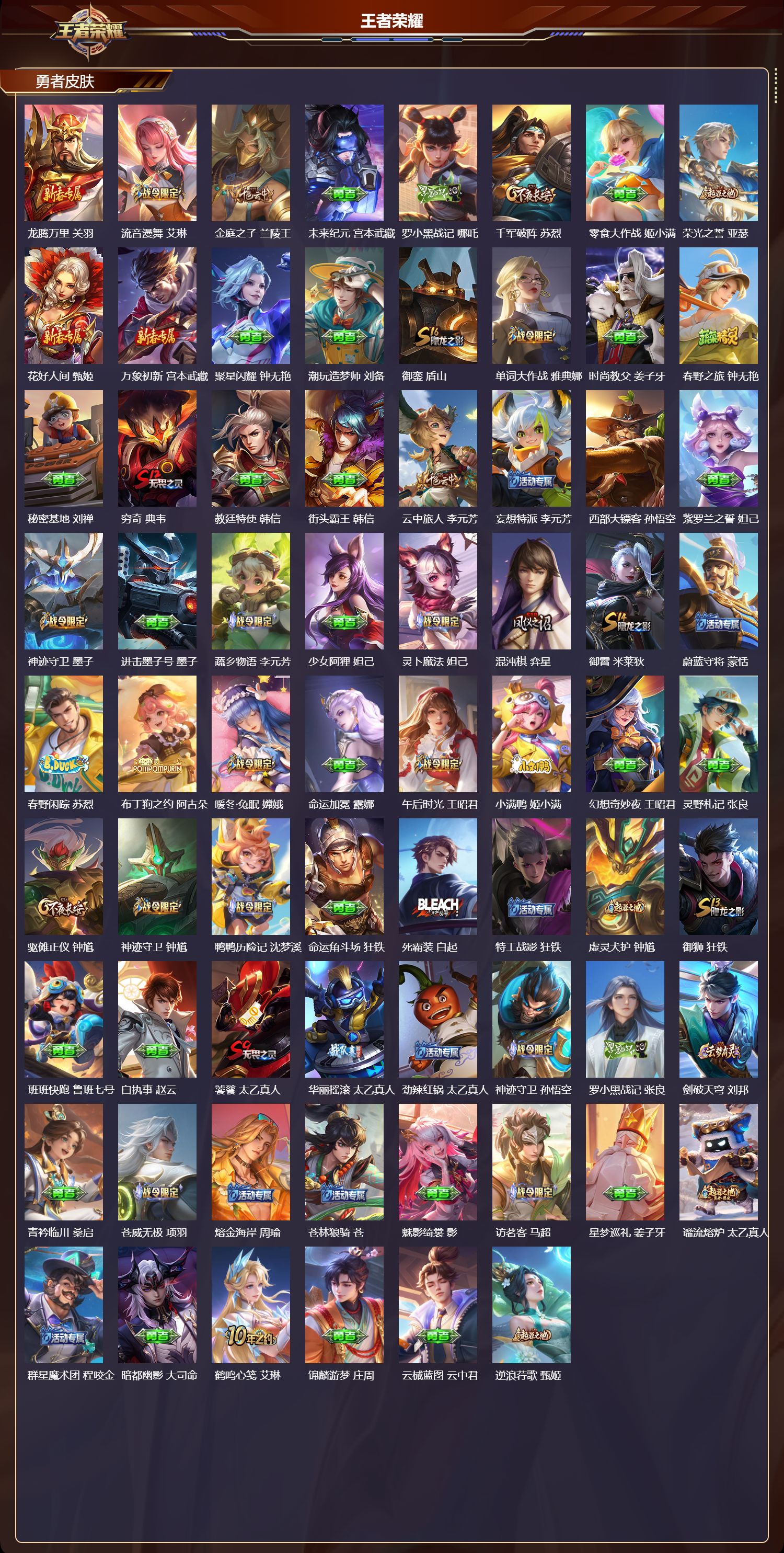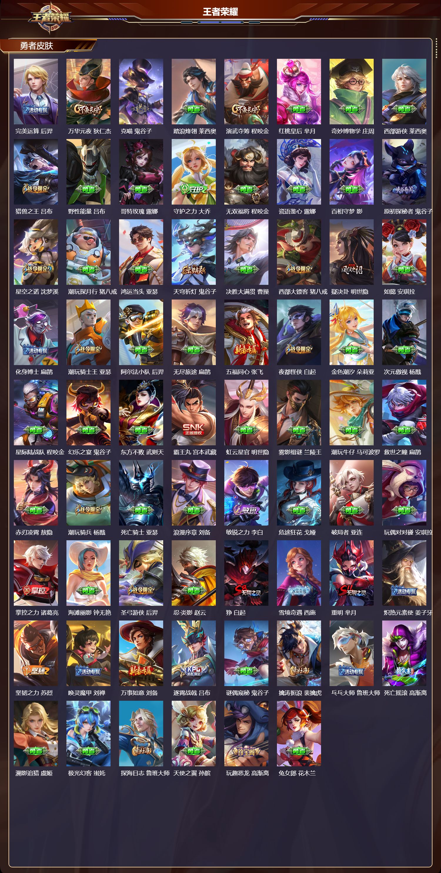 【196,勇者皮肤】时空谍影,海诺,玲珑珍味,西施,圆桌骑士,盾山,烛龙,曹操,爱心护理,阿轲,太极少年,赵怀真,星际陆战队,达摩,沙漠行僧,达摩,大漠名商,沈梦溪,缤纷绘卷,张良,纽约教父,刘备,拳王,达摩,大发明家,达摩,龙舞盛年,沈梦溪,乐园追猎者,白起,丁香结,小乔,功夫炙烤,廉颇,沉稳之力,孙尚香,幻夜卜梦,芈月,海盐诗旅,桑启,幻泉雾影,海月,朔风刀,夏侯惇,醍醐杖,老夫子,朔望之晖,女娲,归虚梦演,孙膑,汉昭烈帝,刘备,热血海滩,哪吒,白色死神,白起,黑桃队长,鲁班七号,黄金武士,典韦,王牌新星,海月,落雪兰心,甄姬,御旌,牛魔,阴阳师,狄仁杰,径山谋武,孙权,次元突破,哪吒,古海寻踪,张良,牛运亨通,牛魔,科学大爆炸,项羽,戏梦巡演,空空儿,功夫老勺,老夫子,西部大镖客,牛魔,鲨炮海盗猫,沈梦溪,海滩派对,项羽,完美运算,后羿,万华元夜,狄仁杰,克喵,鬼谷子,踏浪烽翎,莱西奥,演武夺筹,程咬金,红桃皇后,芈月,奇妙博物学,庄周,西部游侠,莱西奥,猎兽之王,吕布,野性能量,吕布,哥特玫瑰,露娜,守护之力,大乔,无双福将,程咬金,瓷语鉴心,露娜,百相守梦,影,原初探秘者,鬼谷子,星空之诺,沈梦溪,潮玩探月行,猪八戒,鸿运当头,亚瑟,天穹祈灯,鬼谷子,决胜大满贯,曹操,西部大镖客,猪八戒,疑决卦,明世隐,如懿,安琪拉,化身博士,扁鹊,潮玩骑士王,亚瑟,阿尔法小队,后羿,无尽旅途,扁鹊,五福同心,张飞,夜都怪侠,白起,金色潮汐,朵莉亚,次元傲视,杨戬,星际陆战队,程咬金,幻乐之宴,鬼谷子,东方不败,武则天,霸王丸,宫本武藏,虹云星官,明世隐,雾影缉谜,兰陵王,潮玩牛仔,马可波罗,救世之瞳,扁鹊,赤刃凌霄,敖隐,潮玩骑兵,杨戬,死亡骑士,亚瑟,浪漫序章,刘备,敏锐之力,李白,危途狂花,戈娅,破局者,亚连,玩偶对对碰,安琪拉,掌控之力,诸葛亮,海滩丽影,钟无艳,圣弓游侠,后羿,忍·炎影,赵云,狰,白起,雪境奇遇,西施,重明,芈月,炽热元素使,姜子牙,坚韧之力,苏烈,唤灵魔甲,刘禅,万事如意,刘备,逐霄战戟,吕布,谜偶窥秘,鬼谷子,擒涛扼浪,裴擒虎,乓乓大师,鲁班大师,死亡摇滚,高渐离,溯影追猎,虞姬,极光幻客,蚩奼,探海日志,鲁班大师,天使之翼,孙膑,玩趣恶龙,高渐离,兔女郎,花木兰,龙腾万里,关羽,流音漫舞,艾琳,金庭之子,兰陵王,未来纪元,宫本武藏,罗小黑战记,哪吒,千军破阵,苏烈,零食大作战,姬小满,荣光之誓,亚瑟,花好人间,甄姬,万象初新,宫本武藏,聚星闪耀,钟无艳,潮玩造梦师,刘备,御銮,盾山,单词大作战,雅典娜,时尚教父,姜子牙,春野之旅,钟无艳,秘密基地,刘禅,穷奇,典韦,教廷特使,韩信,街头霸王,韩信,云中旅人,李元芳,妄想特派,李元芳,西部大镖客,孙悟空,紫罗兰之誓,妲己,神迹守卫,墨子,进击墨子号,墨子,蔬乡物语,李元芳,少女阿狸,妲己,灵卜魔法,妲己,混沌棋,弈星,御霄,米莱狄,蔚蓝守将,蒙恬,春野闲踪,苏烈,布丁狗之约,阿古朵,暖冬·兔眠,嫦娥,命运加冕,露娜,午后时光,王昭君,小满鸭,姬小满,幻想奇妙夜,王昭君,灵野札记,张良,驱傩正仪,钟馗,神迹守卫,钟馗,鸭鸭历险记,沈梦溪,命运角斗场,狂铁,死霸装,白起,特工战影,狂铁,虚灵犬护,钟馗,御狮,狂铁,班班快跑,鲁班七号,白执事,赵云,饕餮,太乙真人,华丽摇滚,太乙真人,劲辣红锅,太乙真人,神迹守卫,孙悟空,罗小黑战记,张良,剑破天穹,刘邦,青衿临川,桑启,苍威无极,项羽,熔金海岸,周瑜,苍林狼骑,苍,魅影绮裳,影,访茗客,马超,星梦巡礼,姜子牙,谧流熔炉,太乙真人,群星魔术团,程咬金,暗都幽影,大司命,鹤鸣心笺,艾琳,锦麟游梦,庄周,云械蓝图,云中君,逆浪荇歌,甄姬,百相守梦,孙策,执弈定局,雅典娜,海之女神,海月,微风如诗,大乔,线条小狗,周瑜,线条小狗,桑启,百相守梦,老夫子,灵卦秘语,少司缘,怪诞之夜,米莱狄,爆裂喵拳,达摩,玫蓝誓约,戈娅,景韶洛都,明世隐,