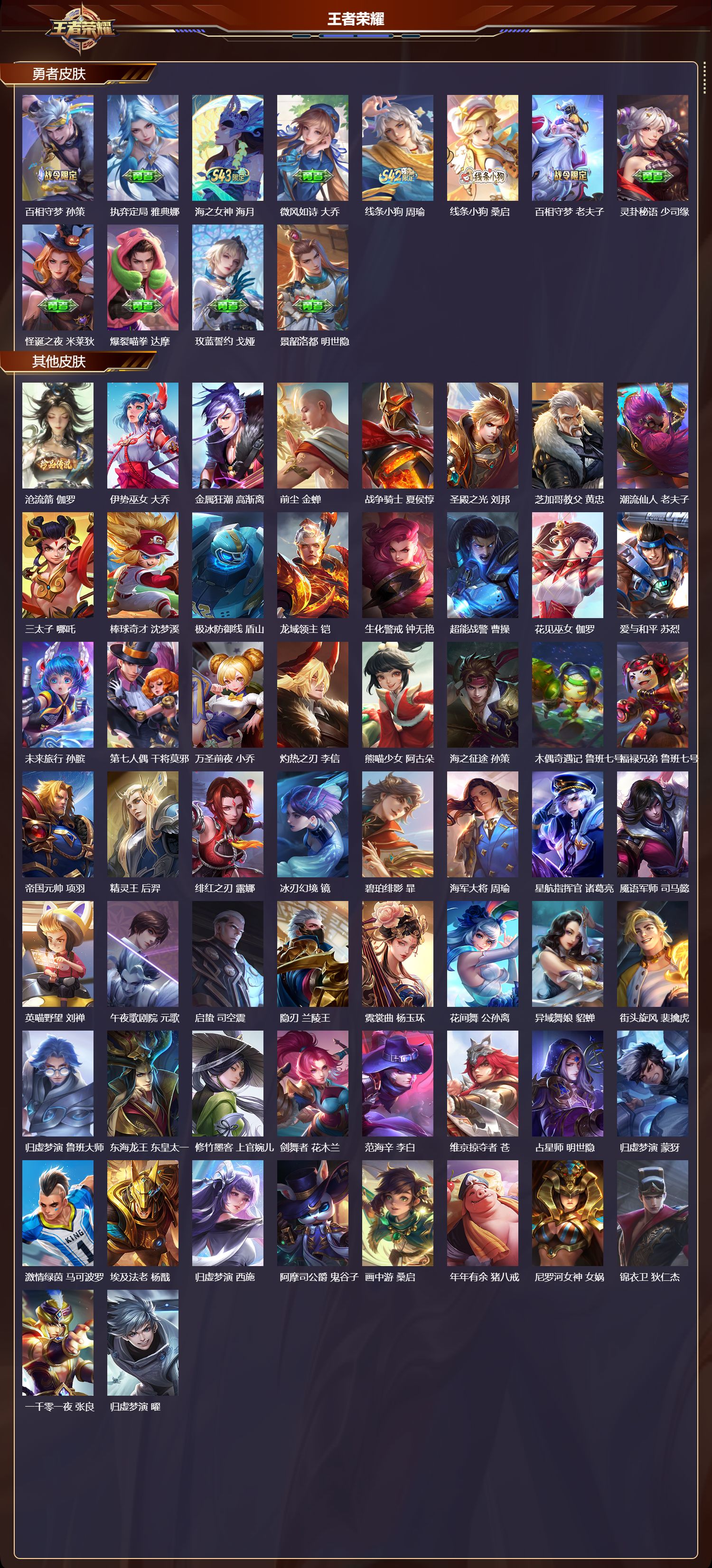 【82,其他皮肤】沧流箭,伽罗,伊势巫女,大乔,金属狂潮,高渐离,前尘,金蝉,战争骑士,夏侯惇,圣殿之光,刘邦,芝加哥教父,黄忠,潮流仙人,老夫子,三太子,哪吒,棒球奇才,沈梦溪,极冰防御线,盾山,龙域领主,铠,生化警戒,钟无艳,超能战警,曹操,花见巫女,伽罗,爱与和平,苏烈,未来旅行,孙膑,第七人偶,干将莫邪,万圣前夜,小乔,灼热之刃,李信,熊喵少女,阿古朵,海之征途,孙策,木偶奇遇记,鲁班七号,福禄兄弟,鲁班七号,帝国元帅,项羽,精灵王,后羿,绯红之刃,露娜,冰刃幻境,镜,碧珀绯影,暃,海军大将,周瑜,星航指挥官,诸葛亮,魇语军师,司马懿,英喵野望,刘禅,午夜歌剧院,元歌,启蛰,司空震,隐刃,兰陵王,霓裳曲,杨玉环,花间舞,公孙离,异域舞娘,貂蝉,街头旋风,裴擒虎,归虚梦演,鲁班大师,东海龙王,东皇太一,修竹墨客,上官婉儿,剑舞者,花木兰,范海辛,李白,维京掠夺者,苍,占星师,明世隐,归虚梦演,蒙犽,激情绿茵,马可波罗,埃及法老,杨戬,归虚梦演,西施,阿摩司公爵,鬼谷子,画中游,桑启,年年有余,猪八戒,尼罗河女神,女娲,锦衣卫,狄仁杰,一千零一夜,张良,归虚梦演,曜,威尼斯狂欢,百里玄策,决胜骁骑,关羽,幸存者,马超,战争女神,雅典娜,荷鲁斯之眼,云中君,创世神祝,盘古,特种部队,李元芳,绝影神枪,百里守约,蔷薇王座,蔡文姬,森,瑶,孤猎,澜,加勒比小姐,虞姬,踏雪寻梅,弈星,秩序猎龙将,蒙恬,精准探案法,米莱狄,精灵公主,王昭君,赤焰之缨,云缨,露花倒影,嫦娥,地府判官,钟馗,美梦成真,梦奇,天启骑士,关羽,圆桌骑士,太乙真人,西部大镖客,孙悟空,时之奇旅,孙策,