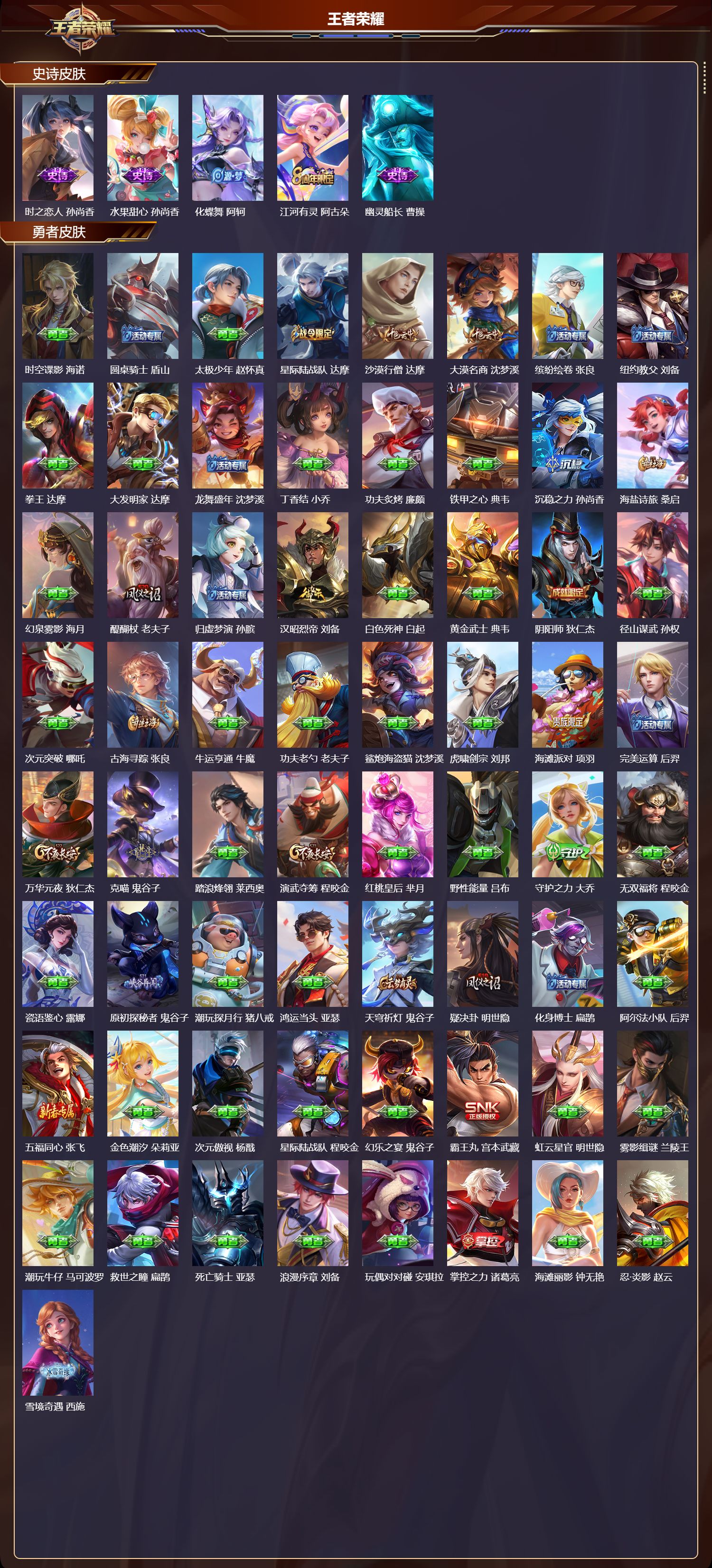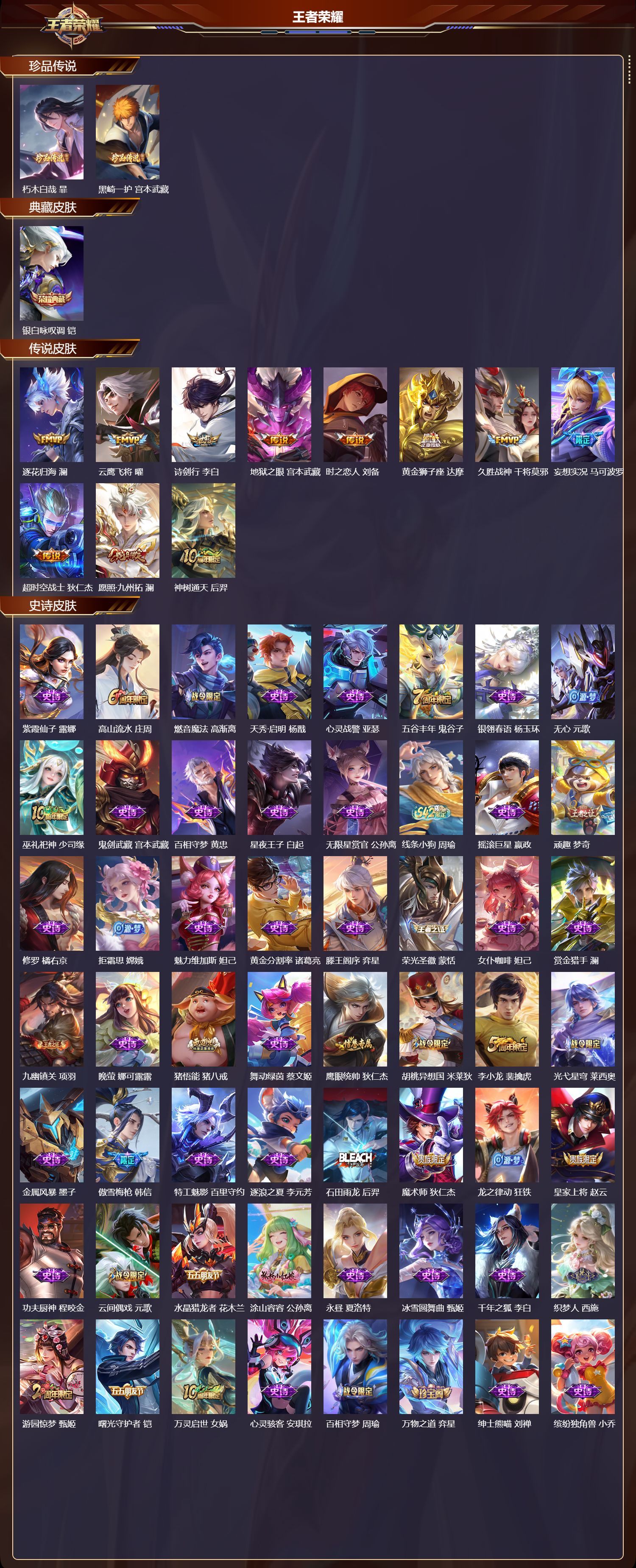 【61,史诗皮肤】紫霞仙子,露娜,高山流水,庄周,燃音魔法,高渐离,天秀·启明,杨戬,心灵战警,亚瑟,五谷丰年,鬼谷子,银翎春语,杨玉环,无心,元歌,巫礼祀神,少司缘,鬼剑武藏,宫本武藏,百相守梦,黄忠,星夜王子,白起,无限星赏官,公孙离,线条小狗,周瑜,摇滚巨星,嬴政,顽趣,梦奇,修罗,橘右京,拒霜思,嫦娥,魅力维加斯,妲己,黄金分割率,诸葛亮,滕王阁序,弈星,荣光圣徽,蒙恬,女仆咖啡,妲己,赏金猎手,澜,九幽镇关,项羽,晚萤,娜可露露,猪悟能,猪八戒,舞动绿茵,蔡文姬,鹰眼统帅,狄仁杰,胡桃异想国,米莱狄,李小龙,裴擒虎,光弋星穹,莱西奥,金属风暴,墨子,傲雪梅枪,韩信,特工魅影,百里守约,逐浪之夏,李元芳,石田雨龙,后羿,魔术师,狄仁杰,龙之律动,狂铁,皇家上将,赵云,功夫厨神,程咬金,云间偶戏,元歌,水晶猎龙者,花木兰,涂山容容,公孙离,永昼,夏洛特,冰雪圆舞曲,甄姬,千年之狐,李白,织梦人,西施,游园惊梦,甄姬,曙光守护者,铠,万灵启世,女娲,心灵骇客,安琪拉,百相守梦,周瑜,万物之道,弈星,绅士熊喵,刘禅,缤纷独角兽,小乔,时之恋人,孙尚香,水果甜心,孙尚香,化蝶舞,阿轲,江河有灵,阿古朵,幽灵船长,曹操,
