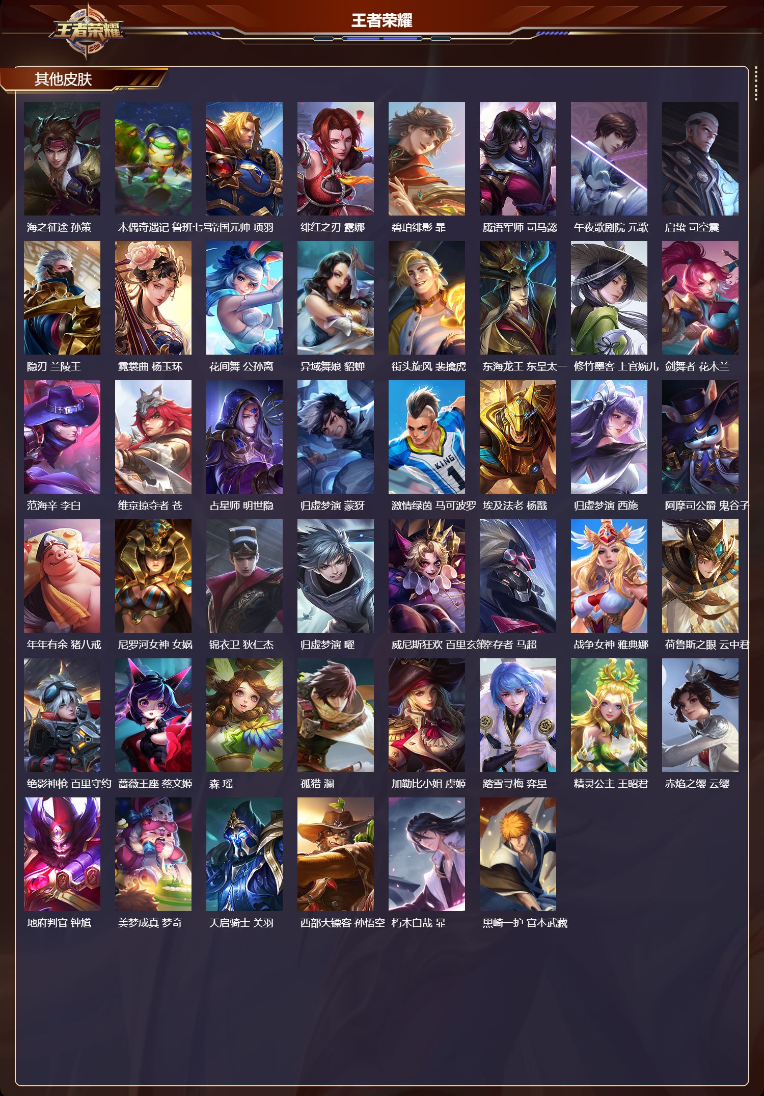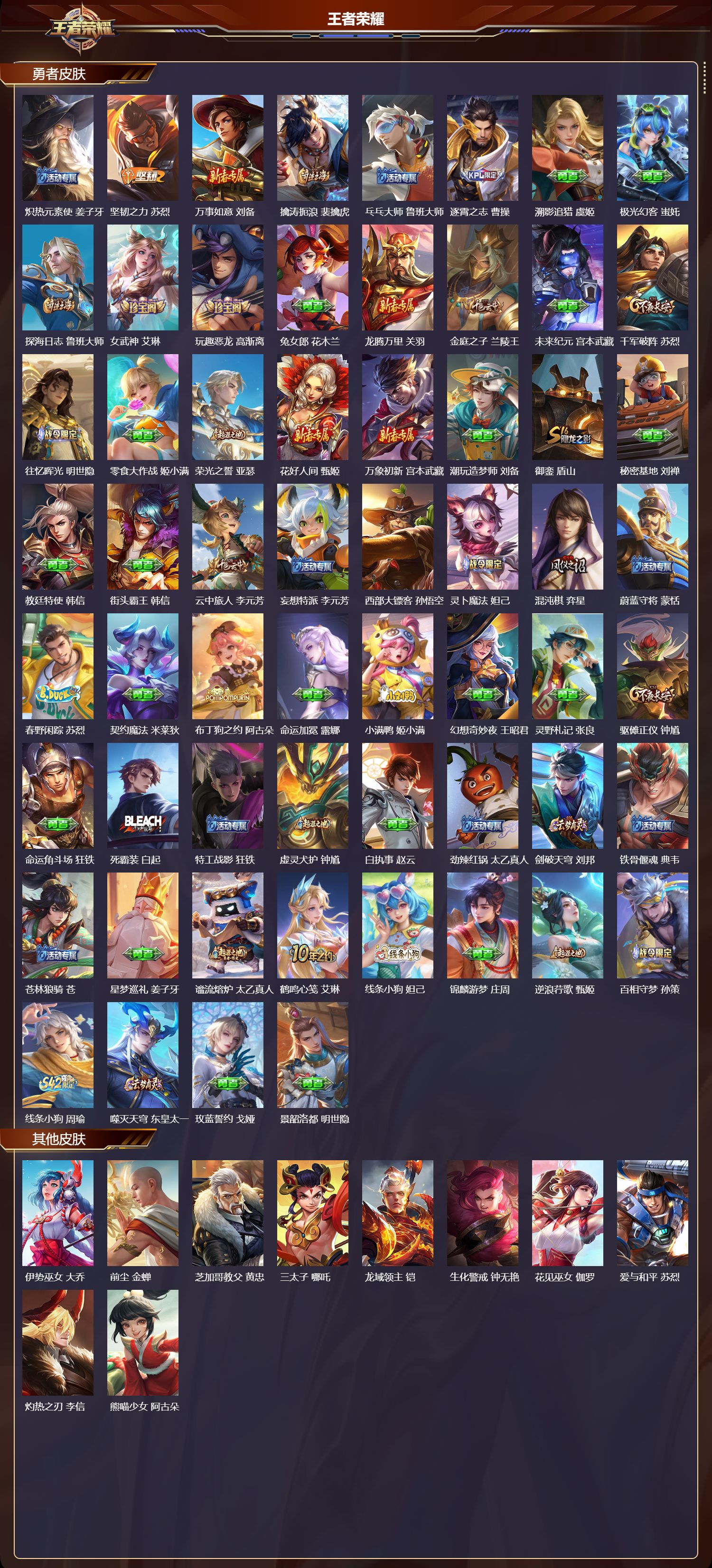 【56,其他皮肤】伊势巫女,大乔,前尘,金蝉,芝加哥教父,黄忠,三太子,哪吒,龙域领主,铠,生化警戒,钟无艳,花见巫女,伽罗,爱与和平,苏烈,灼热之刃,李信,熊喵少女,阿古朵,海之征途,孙策,木偶奇遇记,鲁班七号,帝国元帅,项羽,绯红之刃,露娜,碧珀绯影,暃,魇语军师,司马懿,午夜歌剧院,元歌,启蛰,司空震,隐刃,兰陵王,霓裳曲,杨玉环,花间舞,公孙离,异域舞娘,貂蝉,街头旋风,裴擒虎,东海龙王,东皇太一,修竹墨客,上官婉儿,剑舞者,花木兰,范海辛,李白,维京掠夺者,苍,占星师,明世隐,归虚梦演,蒙犽,激情绿茵,马可波罗,埃及法老,杨戬,归虚梦演,西施,阿摩司公爵,鬼谷子,年年有余,猪八戒,尼罗河女神,女娲,锦衣卫,狄仁杰,归虚梦演,曜,威尼斯狂欢,百里玄策,幸存者,马超,战争女神,雅典娜,荷鲁斯之眼,云中君,绝影神枪,百里守约,蔷薇王座,蔡文姬,森,瑶,孤猎,澜,加勒比小姐,虞姬,踏雪寻梅,弈星,精灵公主,王昭君,赤焰之缨,云缨,地府判官,钟馗,美梦成真,梦奇,天启骑士,关羽,西部大镖客,孙悟空,朽木白哉,暃,黑崎一护,宫本武藏,