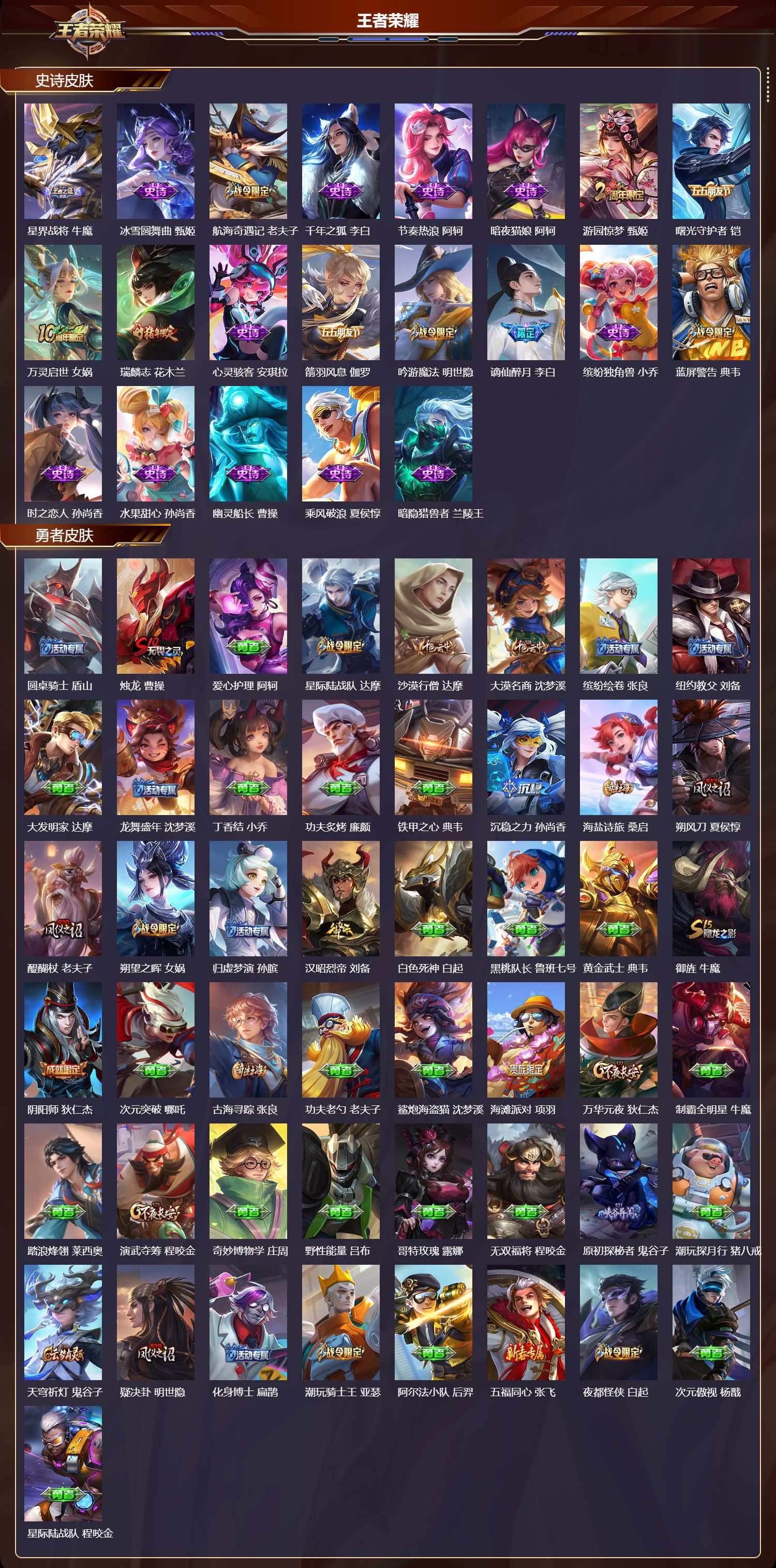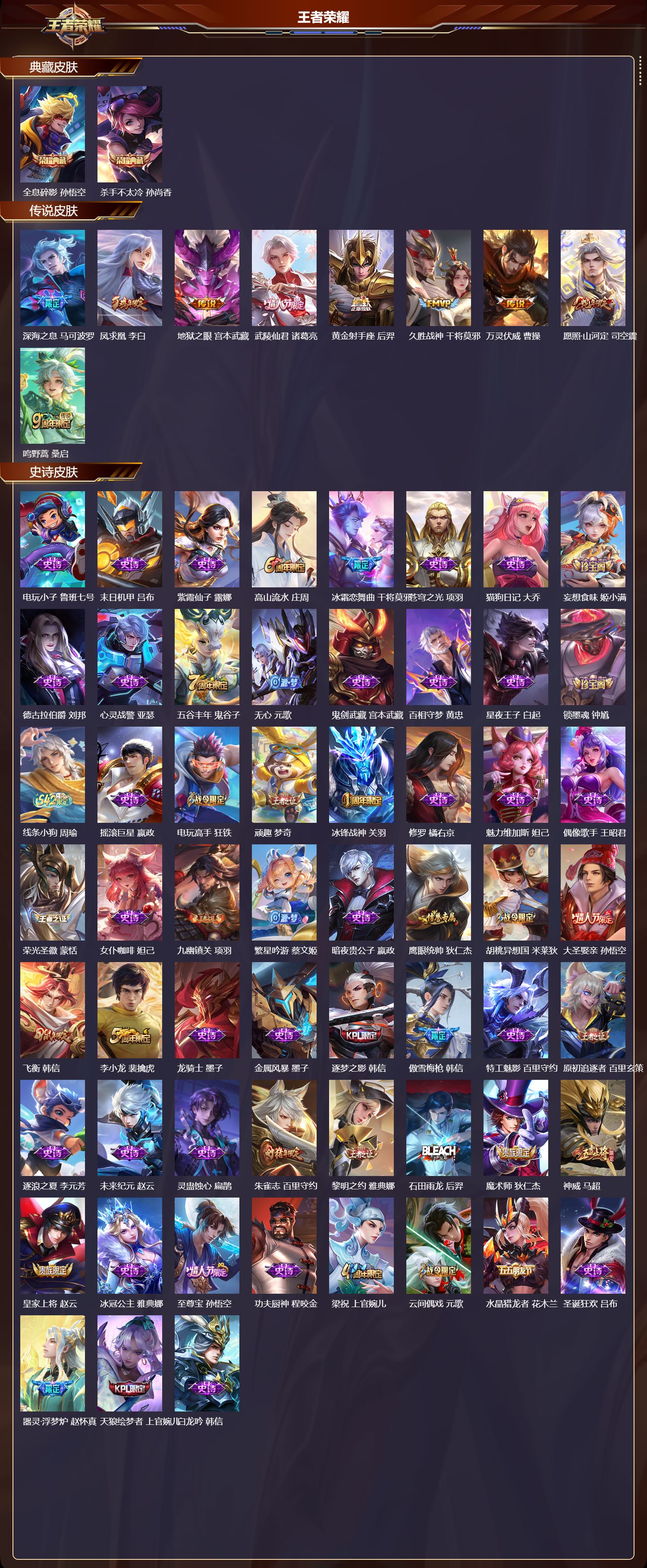 【80,史诗皮肤】电玩小子,鲁班七号,末日机甲,吕布,紫霞仙子,露娜,高山流水,庄周,冰霜恋舞曲,干将莫邪,苍穹之光,项羽,猫狗日记,大乔,妄想食味,姬小满,德古拉伯爵,刘邦,心灵战警,亚瑟,五谷丰年,鬼谷子,无心,元歌,鬼剑武藏,宫本武藏,百相守梦,黄忠,星夜王子,白起,锁墨魂,钟馗,线条小狗,周瑜,摇滚巨星,嬴政,电玩高手,狂铁,顽趣,梦奇,冰锋战神,关羽,修罗,橘右京,魅力维加斯,妲己,偶像歌手,王昭君,荣光圣徽,蒙恬,女仆咖啡,妲己,九幽镇关,项羽,繁星吟游,蔡文姬,暗夜贵公子,嬴政,鹰眼统帅,狄仁杰,胡桃异想国,米莱狄,大圣娶亲,孙悟空,飞衡,韩信,李小龙,裴擒虎,龙骑士,墨子,金属风暴,墨子,逐梦之影,韩信,傲雪梅枪,韩信,特工魅影,百里守约,原初追逐者,百里玄策,逐浪之夏,李元芳,未来纪元,赵云,灵蛊蚀心,扁鹊,朱雀志,百里守约,黎明之约,雅典娜,石田雨龙,后羿,魔术师,狄仁杰,神威,马超,皇家上将,赵云,冰冠公主,雅典娜,至尊宝,孙悟空,功夫厨神,程咬金,梁祝,上官婉儿,云间偶戏,元歌,水晶猎龙者,花木兰,圣诞狂欢,吕布,器灵·浮梦炉,赵怀真,天狼绘梦者,上官婉儿,白龙吟,韩信,星界战将,牛魔,冰雪圆舞曲,甄姬,航海奇遇记,老夫子,千年之狐,李白,节奏热浪,阿轲,暗夜猫娘,阿轲,游园惊梦,甄姬,曙光守护者,铠,万灵启世,女娲,瑞麟志,花木兰,心灵骇客,安琪拉,箭羽风息,伽罗,吟游魔法,明世隐,谪仙醉月,李白,缤纷独角兽,小乔,蓝屏警告,典韦,时之恋人,孙尚香,水果甜心,孙尚香,幽灵船长,曹操,乘风破浪,夏侯惇,暗隐猎兽者,兰陵王,