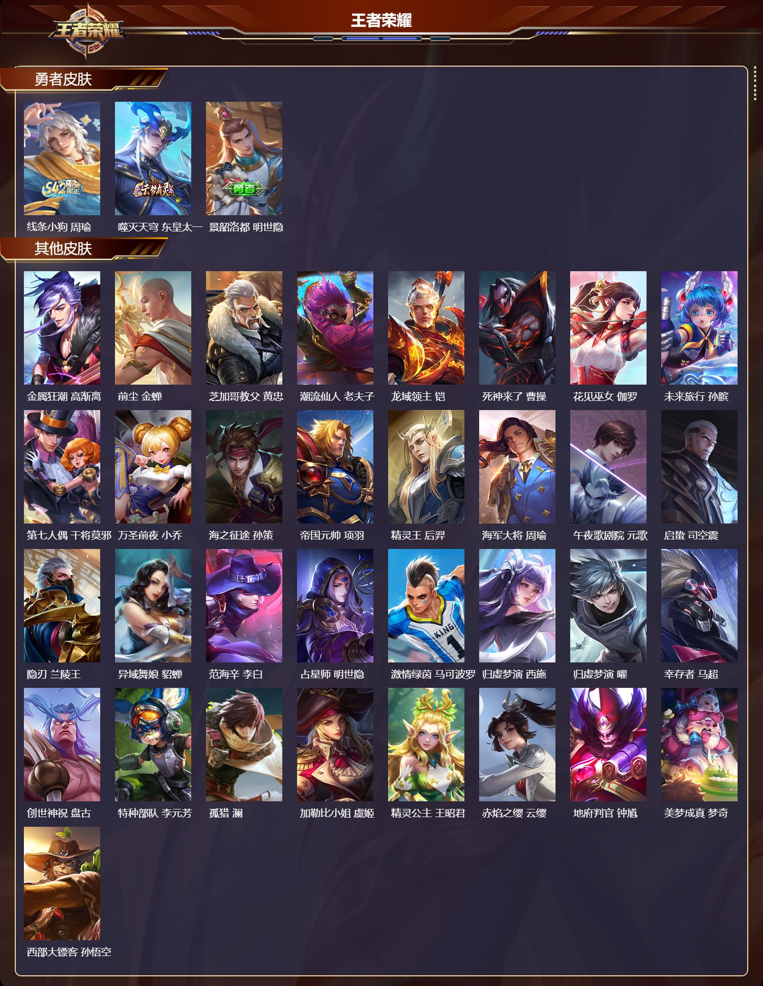 【122,勇者皮肤】圆桌骑士,盾山,烛龙,曹操,爱心护理,阿轲,星际陆战队,达摩,沙漠行僧,达摩,大漠名商,沈梦溪,缤纷绘卷,张良,纽约教父,刘备,大发明家,达摩,龙舞盛年,沈梦溪,丁香结,小乔,功夫炙烤,廉颇,铁甲之心,典韦,沉稳之力,孙尚香,海盐诗旅,桑启,朔风刀,夏侯惇,醍醐杖,老夫子,朔望之晖,女娲,归虚梦演,孙膑,汉昭烈帝,刘备,白色死神,白起,黑桃队长,鲁班七号,黄金武士,典韦,御旌,牛魔,阴阳师,狄仁杰,次元突破,哪吒,古海寻踪,张良,功夫老勺,老夫子,鲨炮海盗猫,沈梦溪,海滩派对,项羽,万华元夜,狄仁杰,制霸全明星,牛魔,踏浪烽翎,莱西奥,演武夺筹,程咬金,奇妙博物学,庄周,野性能量,吕布,哥特玫瑰,露娜,无双福将,程咬金,原初探秘者,鬼谷子,潮玩探月行,猪八戒,天穹祈灯,鬼谷子,疑决卦,明世隐,化身博士,扁鹊,潮玩骑士王,亚瑟,阿尔法小队,后羿,五福同心,张飞,夜都怪侠,白起,次元傲视,杨戬,星际陆战队,程咬金,幻乐之宴,鬼谷子,东方不败,武则天,霸王丸,宫本武藏,虹云星官,明世隐,雾影缉谜,兰陵王,救世之瞳,扁鹊,死亡骑士,亚瑟,浪漫序章,刘备,玩偶对对碰,安琪拉,掌控之力,诸葛亮,海滩丽影,钟无艳,忍·炎影,赵云,重明,芈月,炽热元素使,姜子牙,坚韧之力,苏烈,万事如意,刘备,逐霄战戟,吕布,擒涛扼浪,裴擒虎,乓乓大师,鲁班大师,溯影追猎,虞姬,探海日志,鲁班大师,雾都夜雨,干将莫邪,玩趣恶龙,高渐离,兔女郎,花木兰,龙腾万里,关羽,金庭之子,兰陵王,罗小黑战记,哪吒,千军破阵,苏烈,荣光之誓,亚瑟,花好人间,甄姬,万象初新,宫本武藏,御銮,盾山,时尚教父,姜子牙,秘密基地,刘禅,穷奇,典韦,教廷特使,韩信,街头霸王,韩信,云中旅人,李元芳,西部大镖客,孙悟空,神迹守卫,墨子,进击墨子号,墨子,少女阿狸,妲己,混沌棋,弈星,御霄,米莱狄,蔚蓝守将,蒙恬,春野闲踪,苏烈,命运加冕,露娜,午后时光,王昭君,小满鸭,姬小满,幻想奇妙夜,王昭君,灵野札记,张良,驱傩正仪,钟馗,死霸装,白起,特工战影,狂铁,虚灵犬护,钟馗,御狮,狂铁,班班快跑,鲁班七号,白执事,赵云,饕餮,太乙真人,劲辣红锅,太乙真人,剑破天穹,刘邦,铁骨偃魂,典韦,苍林狼骑,苍,天穹之誓,姜子牙,星梦巡礼,姜子牙,谧流熔炉,太乙真人,金福满堂,东皇太一,鹤鸣心笺,艾琳,云械蓝图,云中君,逆浪荇歌,甄姬,线条小狗,周瑜,噬灭天穹,东皇太一,景韶洛都,明世隐,