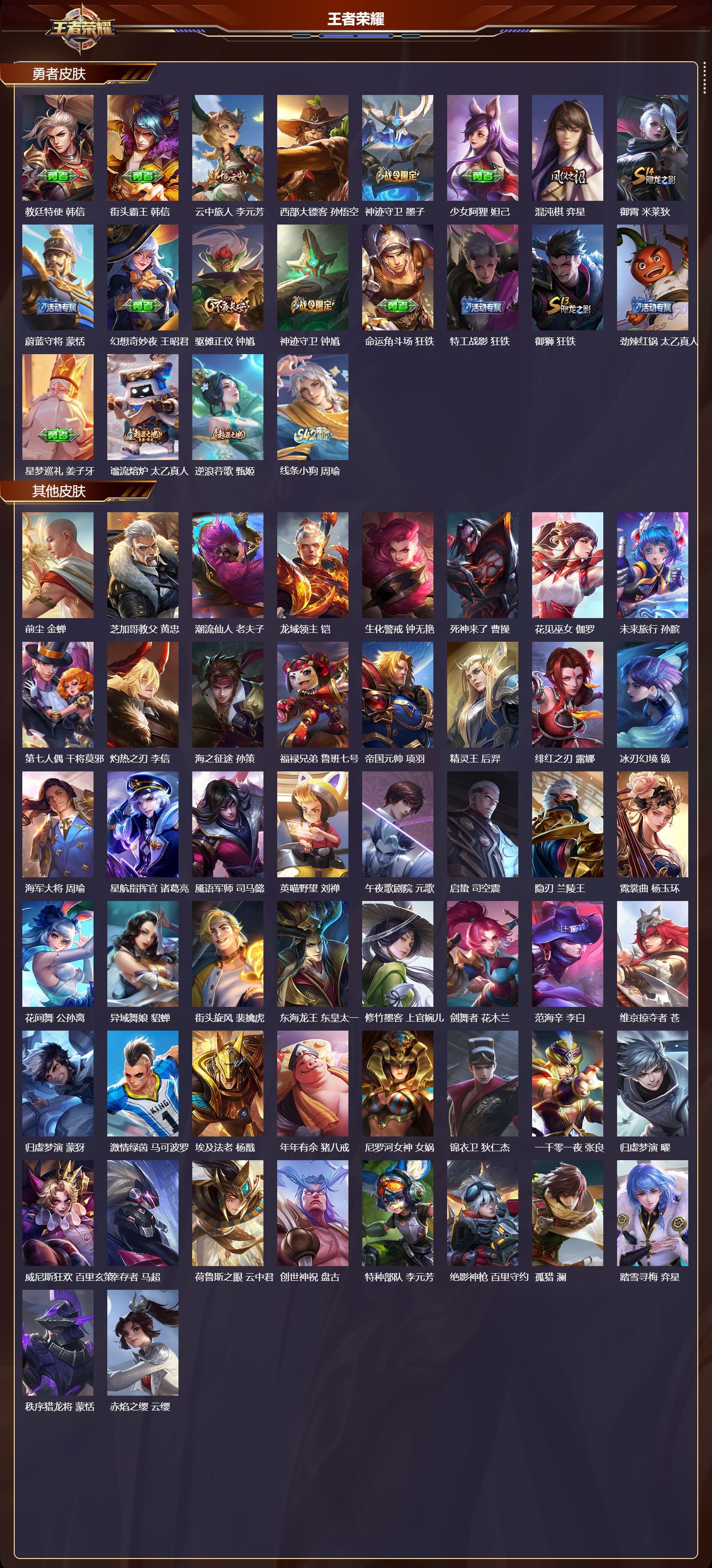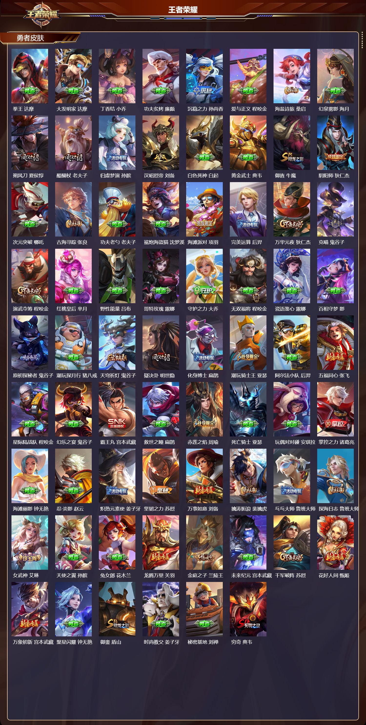 【97,勇者皮肤】玲珑珍味,西施,圆桌骑士,盾山,爱心护理,阿轲,沙漠行僧,达摩,大漠名商,沈梦溪,缤纷绘卷,张良,纽约教父,刘备,拳王,达摩,大发明家,达摩,丁香结,小乔,功夫炙烤,廉颇,沉稳之力,孙尚香,爱与正义,程咬金,海盐诗旅,桑启,幻泉雾影,海月,朔风刀,夏侯惇,醍醐杖,老夫子,归虚梦演,孙膑,汉昭烈帝,刘备,白色死神,白起,黄金武士,典韦,御旌,牛魔,阴阳师,狄仁杰,次元突破,哪吒,古海寻踪,张良,功夫老勺,老夫子,鲨炮海盗猫,沈梦溪,海滩派对,项羽,完美运算,后羿,万华元夜,狄仁杰,克喵,鬼谷子,演武夺筹,程咬金,红桃皇后,芈月,野性能量,吕布,哥特玫瑰,露娜,守护之力,大乔,无双福将,程咬金,瓷语鉴心,露娜,百相守梦,影,原初探秘者,鬼谷子,潮玩探月行,猪八戒,天穹祈灯,鬼谷子,疑决卦,明世隐,化身博士,扁鹊,潮玩骑士王,亚瑟,阿尔法小队,后羿,五福同心,张飞,星际陆战队,程咬金,幻乐之宴,鬼谷子,霸王丸,宫本武藏,救世之瞳,扁鹊,赤莲之焰,周瑜,死亡骑士,亚瑟,玩偶对对碰,安琪拉,掌控之力,诸葛亮,海滩丽影,钟无艳,忍·炎影,赵云,炽热元素使,姜子牙,坚韧之力,苏烈,万事如意,刘备,擒涛扼浪,裴擒虎,乓乓大师,鲁班大师,探海日志,鲁班大师,女武神,艾琳,天使之翼,孙膑,兔女郎,花木兰,龙腾万里,关羽,金庭之子,兰陵王,未来纪元,宫本武藏,千军破阵,苏烈,花好人间,甄姬,万象初新,宫本武藏,聚星闪耀,钟无艳,御銮,盾山,时尚教父,姜子牙,秘密基地,刘禅,穷奇,典韦,教廷特使,韩信,街头霸王,韩信,云中旅人,李元芳,西部大镖客,孙悟空,神迹守卫,墨子,少女阿狸,妲己,混沌棋,弈星,御霄,米莱狄,蔚蓝守将,蒙恬,幻想奇妙夜,王昭君,驱傩正仪,钟馗,神迹守卫,钟馗,命运角斗场,狂铁,特工战影,狂铁,御狮,狂铁,劲辣红锅,太乙真人,星梦巡礼,姜子牙,谧流熔炉,太乙真人,逆浪荇歌,甄姬,线条小狗,周瑜,