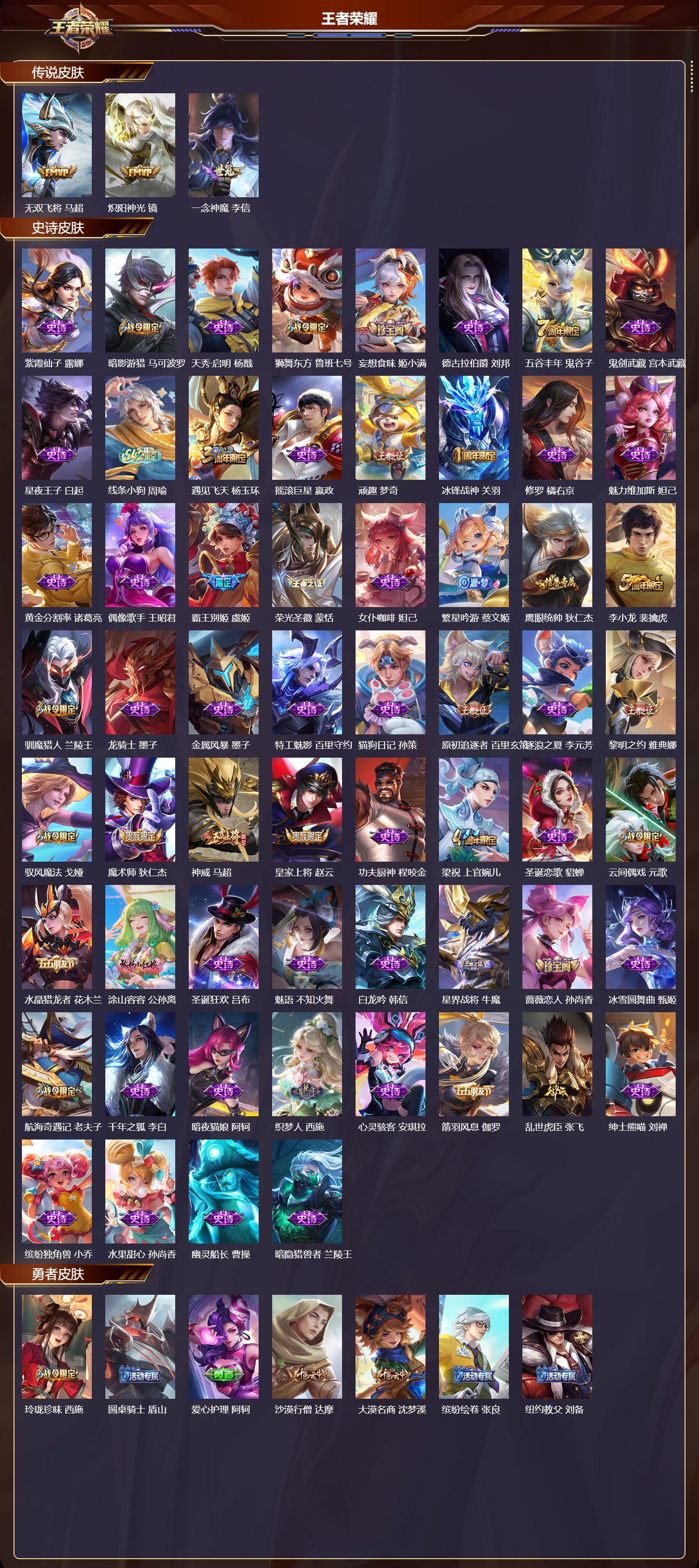 【60,史诗皮肤】紫霞仙子,露娜,暗影游猎,马可波罗,天秀·启明,杨戬,狮舞东方,鲁班七号,妄想食味,姬小满,德古拉伯爵,刘邦,五谷丰年,鬼谷子,鬼剑武藏,宫本武藏,星夜王子,白起,线条小狗,周瑜,遇见飞天,杨玉环,摇滚巨星,嬴政,顽趣,梦奇,冰锋战神,关羽,修罗,橘右京,魅力维加斯,妲己,黄金分割率,诸葛亮,偶像歌手,王昭君,霸王别姬,虞姬,荣光圣徽,蒙恬,女仆咖啡,妲己,繁星吟游,蔡文姬,鹰眼统帅,狄仁杰,李小龙,裴擒虎,驯魔猎人,兰陵王,龙骑士,墨子,金属风暴,墨子,特工魅影,百里守约,猫狗日记,孙策,原初追逐者,百里玄策,逐浪之夏,李元芳,黎明之约,雅典娜,驭风魔法,戈娅,魔术师,狄仁杰,神威,马超,皇家上将,赵云,功夫厨神,程咬金,梁祝,上官婉儿,圣诞恋歌,貂蝉,云间偶戏,元歌,水晶猎龙者,花木兰,涂山容容,公孙离,圣诞狂欢,吕布,魅语,不知火舞,白龙吟,韩信,星界战将,牛魔,蔷薇恋人,孙尚香,冰雪圆舞曲,甄姬,航海奇遇记,老夫子,千年之狐,李白,暗夜猫娘,阿轲,织梦人,西施,心灵骇客,安琪拉,箭羽风息,伽罗,乱世虎臣,张飞,绅士熊喵,刘禅,缤纷独角兽,小乔,水果甜心,孙尚香,幽灵船长,曹操,暗隐猎兽者,兰陵王,