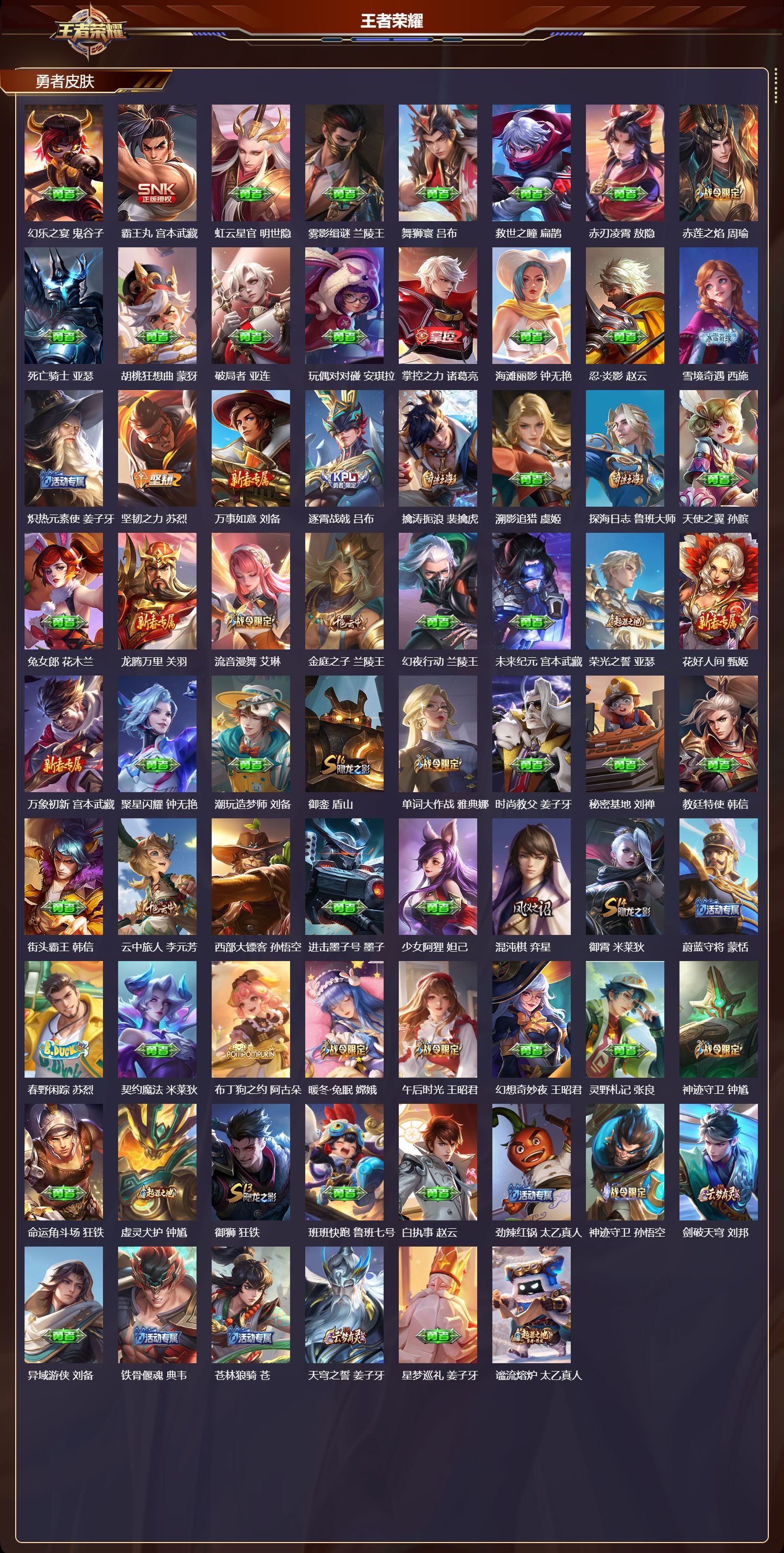 【138,勇者皮肤】时空谍影,海诺,圆桌骑士,盾山,爱心护理,阿轲,大漠名商,沈梦溪,暖冬絮语,程咬金,缤纷绘卷,张良,拳王,达摩,大发明家,达摩,乐园追猎者,白起,丁香结,小乔,功夫炙烤,廉颇,沉稳之力,孙尚香,海盐诗旅,桑启,幻泉雾影,海月,朔风刀,夏侯惇,醍醐杖,老夫子,归虚梦演,孙膑,白色死神,白起,黑桃队长,鲁班七号,黄金武士,典韦,王牌新星,海月,落雪兰心,甄姬,夺宝奇兵,刘邦,御旌,牛魔,阴阳师,狄仁杰,次元突破,哪吒,古海寻踪,张良,科学大爆炸,项羽,功夫老勺,老夫子,西部大镖客,牛魔,鲨炮海盗猫,沈梦溪,海滩派对,项羽,完美运算,后羿,万华元夜,狄仁杰,无尽征程,廉颇,踏浪烽翎,莱西奥,演武夺筹,程咬金,红桃皇后,芈月,奇妙博物学,庄周,西部游侠,莱西奥,野性能量,吕布,哥特玫瑰,露娜,守护之力,大乔,无双福将,程咬金,瓷语鉴心,露娜,原初探秘者,鬼谷子,星空之诺,沈梦溪,潮玩探月行,猪八戒,鸿运当头,亚瑟,天穹祈灯,鬼谷子,西部大镖客,猪八戒,疑决卦,明世隐,化身博士,扁鹊,潮玩骑士王,亚瑟,阿尔法小队,后羿,无尽旅途,扁鹊,五福同心,张飞,金色潮汐,朵莉亚,次元傲视,杨戬,星际陆战队,程咬金,幻乐之宴,鬼谷子,霸王丸,宫本武藏,虹云星官,明世隐,雾影缉谜,兰陵王,舞狮寰,吕布,救世之瞳,扁鹊,赤刃凌霄,敖隐,赤莲之焰,周瑜,死亡骑士,亚瑟,胡桃狂想曲,蒙犽,破局者,亚连,玩偶对对碰,安琪拉,掌控之力,诸葛亮,海滩丽影,钟无艳,忍·炎影,赵云,雪境奇遇,西施,炽热元素使,姜子牙,坚韧之力,苏烈,万事如意,刘备,逐霄战戟,吕布,擒涛扼浪,裴擒虎,溯影追猎,虞姬,探海日志,鲁班大师,天使之翼,孙膑,兔女郎,花木兰,龙腾万里,关羽,流音漫舞,艾琳,金庭之子,兰陵王,幻夜行动,兰陵王,未来纪元,宫本武藏,荣光之誓,亚瑟,花好人间,甄姬,万象初新,宫本武藏,聚星闪耀,钟无艳,潮玩造梦师,刘备,御銮,盾山,单词大作战,雅典娜,时尚教父,姜子牙,秘密基地,刘禅,教廷特使,韩信,街头霸王,韩信,云中旅人,李元芳,西部大镖客,孙悟空,进击墨子号,墨子,少女阿狸,妲己,混沌棋,弈星,御霄,米莱狄,蔚蓝守将,蒙恬,春野闲踪,苏烈,契约魔法,米莱狄,布丁狗之约,阿古朵,暖冬·兔眠,嫦娥,午后时光,王昭君,幻想奇妙夜,王昭君,灵野札记,张良,神迹守卫,钟馗,命运角斗场,狂铁,虚灵犬护,钟馗,御狮,狂铁,班班快跑,鲁班七号,白执事,赵云,劲辣红锅,太乙真人,神迹守卫,孙悟空,剑破天穹,刘邦,异域游侠,刘备,铁骨偃魂,典韦,苍林狼骑,苍,天穹之誓,姜子牙,星梦巡礼,姜子牙,谧流熔炉,太乙真人,经纬探寻者,盘古,鹤鸣心笺,艾琳,云械蓝图,云中君,逆浪荇歌,甄姬,海之女神,海月,线条小狗,周瑜,百相守梦,老夫子,噬灭天穹,东皇太一,