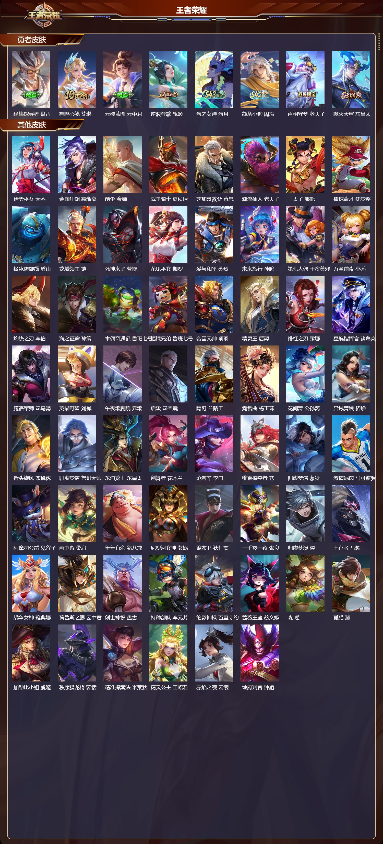【65,其他皮肤】伊势巫女,大乔,金属狂潮,高渐离,前尘,金蝉,战争骑士,夏侯惇,芝加哥教父,黄忠,潮流仙人,老夫子,三太子,哪吒,棒球奇才,沈梦溪,极冰防御线,盾山,龙域领主,铠,死神来了,曹操,花见巫女,伽罗,爱与和平,苏烈,未来旅行,孙膑,第七人偶,干将莫邪,万圣前夜,小乔,灼热之刃,李信,海之征途,孙策,木偶奇遇记,鲁班七号,福禄兄弟,鲁班七号,帝国元帅,项羽,精灵王,后羿,绯红之刃,露娜,星航指挥官,诸葛亮,魇语军师,司马懿,英喵野望,刘禅,午夜歌剧院,元歌,启蛰,司空震,隐刃,兰陵王,霓裳曲,杨玉环,花间舞,公孙离,异域舞娘,貂蝉,街头旋风,裴擒虎,归虚梦演,鲁班大师,东海龙王,东皇太一,剑舞者,花木兰,范海辛,李白,维京掠夺者,苍,归虚梦演,蒙犽,激情绿茵,马可波罗,阿摩司公爵,鬼谷子,画中游,桑启,年年有余,猪八戒,尼罗河女神,女娲,锦衣卫,狄仁杰,一千零一夜,张良,归虚梦演,曜,幸存者,马超,战争女神,雅典娜,荷鲁斯之眼,云中君,创世神祝,盘古,特种部队,李元芳,绝影神枪,百里守约,蔷薇王座,蔡文姬,森,瑶,孤猎,澜,加勒比小姐,虞姬,秩序猎龙将,蒙恬,精准探案法,米莱狄,精灵公主,王昭君,赤焰之缨,云缨,地府判官,钟馗,美梦成真,梦奇,天启骑士,关羽,西部大镖客,孙悟空,