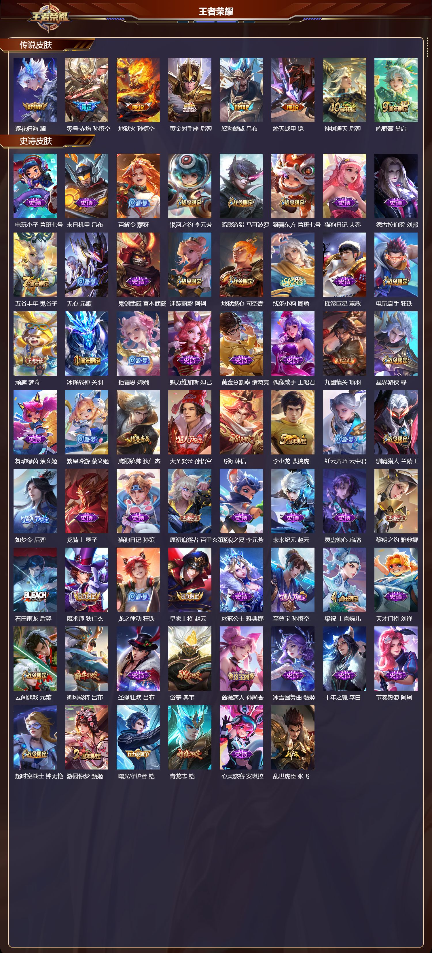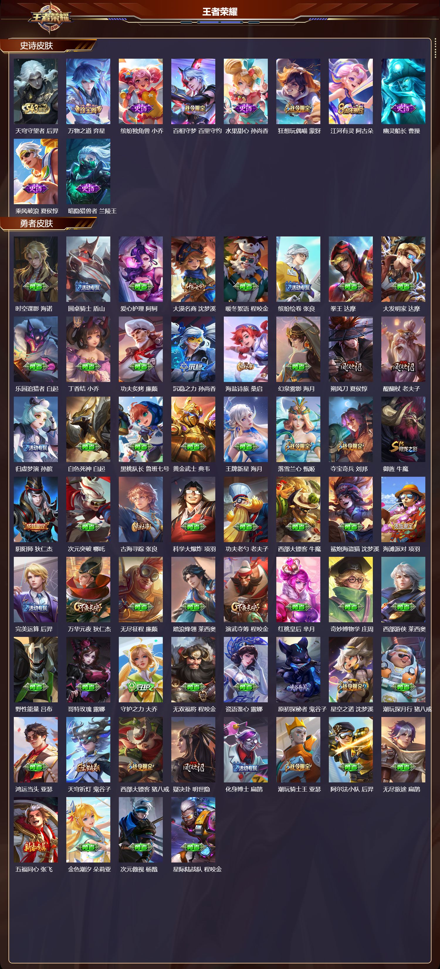 【72,史诗皮肤】电玩小子,鲁班七号,末日机甲,吕布,百解令,蒙犽,银河之约,李元芳,暗影游猎,马可波罗,狮舞东方,鲁班七号,猫狗日记,大乔,德古拉伯爵,刘邦,五谷丰年,鬼谷子,无心,元歌,鬼剑武藏,宫本武藏,迷踪丽影,阿轲,地狱燃心,司空震,线条小狗,周瑜,摇滚巨星,嬴政,电玩高手,狂铁,顽趣,梦奇,冰锋战神,关羽,拒霜思,嫦娥,魅力维加斯,妲己,黄金分割率,诸葛亮,偶像歌手,王昭君,九幽镇关,项羽,星界游侠,暃,舞动绿茵,蔡文姬,繁星吟游,蔡文姬,鹰眼统帅,狄仁杰,大圣娶亲,孙悟空,飞衡,韩信,李小龙,裴擒虎,纤云弄巧,云中君,驯魔猎人,兰陵王,如梦令,后羿,龙骑士,墨子,猫狗日记,孙策,原初追逐者,百里玄策,逐浪之夏,李元芳,未来纪元,赵云,灵蛊蚀心,扁鹊,黎明之约,雅典娜,石田雨龙,后羿,魔术师,狄仁杰,龙之律动,狂铁,皇家上将,赵云,冰冠公主,雅典娜,至尊宝,孙悟空,梁祝,上官婉儿,天才门将,刘禅,云间偶戏,元歌,御风骁将,吕布,圣诞狂欢,吕布,岱宗,典韦,蔷薇恋人,孙尚香,冰雪圆舞曲,甄姬,千年之狐,李白,节奏热浪,阿轲,超时空战士,钟无艳,游园惊梦,甄姬,曙光守护者,铠,青龙志,铠,心灵骇客,安琪拉,乱世虎臣,张飞,天穹守望者,后羿,万物之道,弈星,缤纷独角兽,小乔,百相守梦,百里守约,水果甜心,孙尚香,狂想玩偶喵,蒙犽,江河有灵,阿古朵,幽灵船长,曹操,乘风破浪,夏侯惇,暗隐猎兽者,兰陵王,