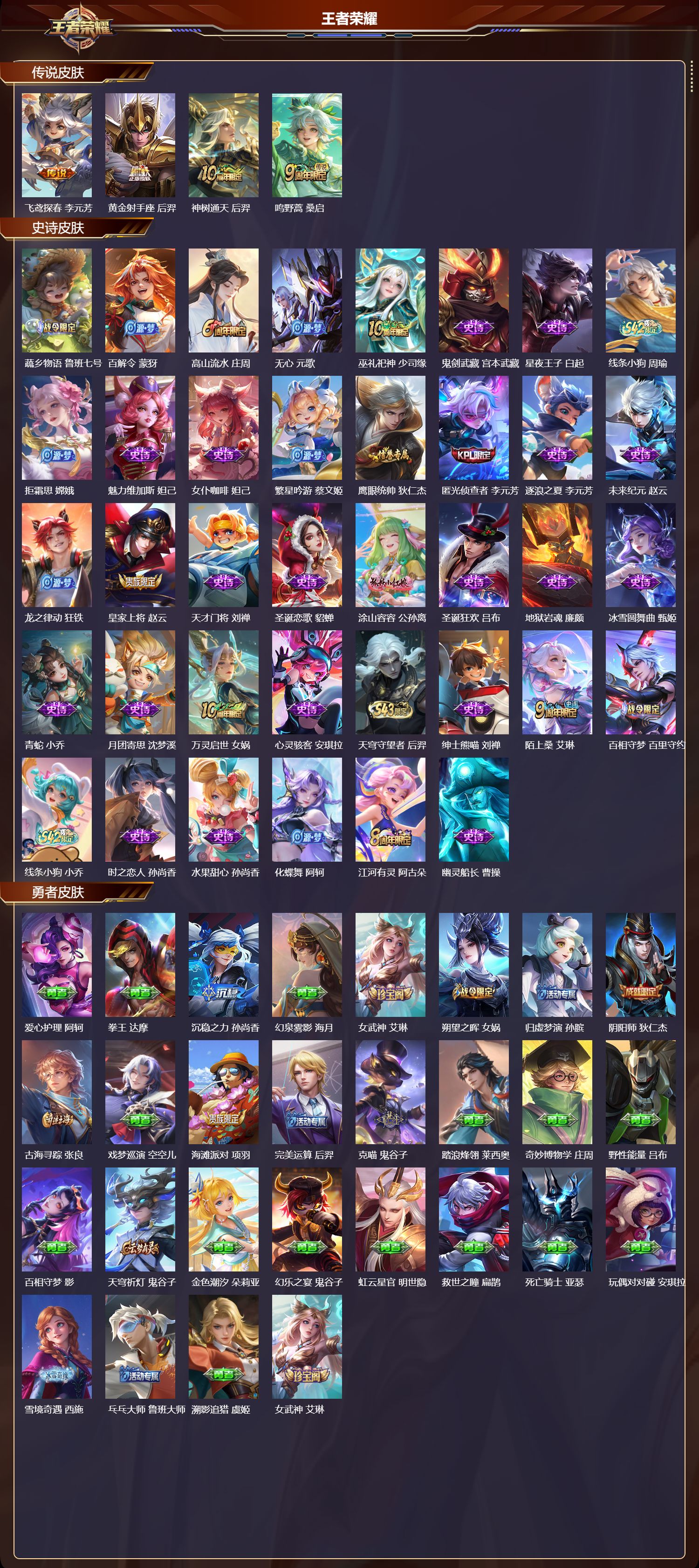【38,史诗皮肤】,蔬乡物语,鲁班七号,百解令,蒙犽,高山流水,庄周,无心,元歌,巫礼祀神,少司缘,鬼剑武藏,宫本武藏,星夜王子,白起,线条小狗,周瑜,拒霜思,嫦娥,魅力维加斯,妲己,女仆咖啡,妲己,繁星吟游,蔡文姬,鹰眼统帅,狄仁杰,匿光侦查者,李元芳,逐浪之夏,李元芳,未来纪元,赵云,龙之律动,狂铁,皇家上将,赵云,天才门将,刘禅,圣诞恋歌,貂蝉,涂山容容,公孙离,圣诞狂欢,吕布,地狱岩魂,廉颇,冰雪圆舞曲,甄姬,青蛇,小乔,月团寄思,沈梦溪,万灵启世,女娲,心灵骇客,安琪拉,天穹守望者,后羿,绅士熊喵,刘禅,陌上桑,艾琳,百相守梦,百里守约,线条小狗,小乔,时之恋人,孙尚香,水果甜心,孙尚香,化蝶舞,阿轲,江河有灵,阿古朵,幽灵船长,曹操,