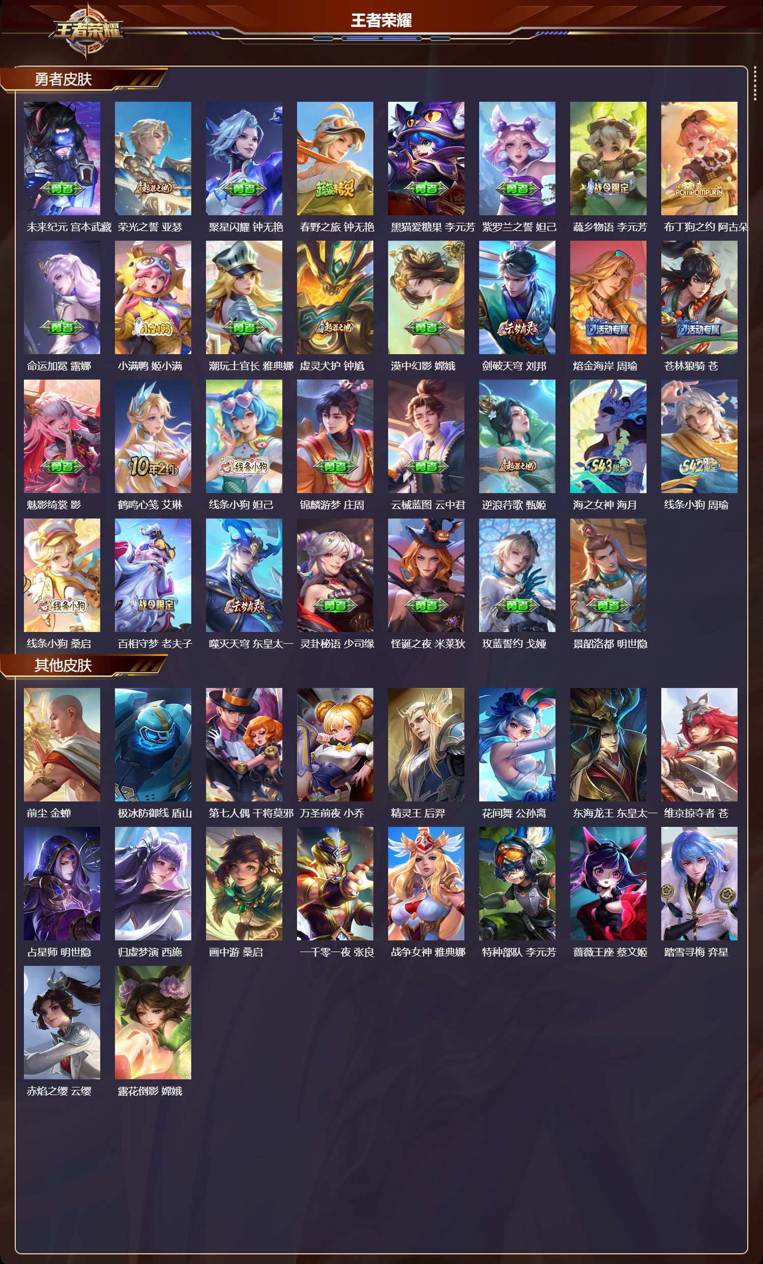 【58,勇者皮肤】,爱心护理,阿轲,拳王,达摩,沉稳之力,孙尚香,幻泉雾影,海月,朔望之晖,女娲,归虚梦演,孙膑,阴阳师,狄仁杰,古海寻踪,张良,戏梦巡演,空空儿,海滩派对,项羽,完美运算,后羿,克喵,鬼谷子,踏浪烽翎,莱西奥,奇妙博物学,庄周,野性能量,吕布,百相守梦,影,天穹祈灯,鬼谷子,金色潮汐,朵莉亚,幻乐之宴,鬼谷子,虹云星官,明世隐,救世之瞳,扁鹊,死亡骑士,亚瑟,玩偶对对碰,安琪拉,雪境奇遇,西施,乓乓大师,鲁班大师,溯影追猎,虞姬,女武神,艾琳,未来纪元,宫本武藏,荣光之誓,亚瑟,聚星闪耀,钟无艳,春野之旅,钟无艳,黑猫爱糖果,李元芳,紫罗兰之誓,妲己,蔬乡物语,李元芳,布丁狗之约,阿古朵,命运加冕,露娜,小满鸭,姬小满,潮玩士官长,雅典娜,虚灵犬护,钟馗,漠中幻影,嫦娥,剑破天穹,刘邦,熔金海岸,周瑜,苍林狼骑,苍,魅影绮裳,影,鹤鸣心笺,艾琳,线条小狗,妲己,锦麟游梦,庄周,云械蓝图,云中君,逆浪荇歌,甄姬,海之女神,海月,线条小狗,周瑜,线条小狗,桑启,百相守梦,老夫子,噬灭天穹,东皇太一,灵卦秘语,少司缘,怪诞之夜,米莱狄,玫蓝誓约,戈娅,景韶洛都,明世隐,