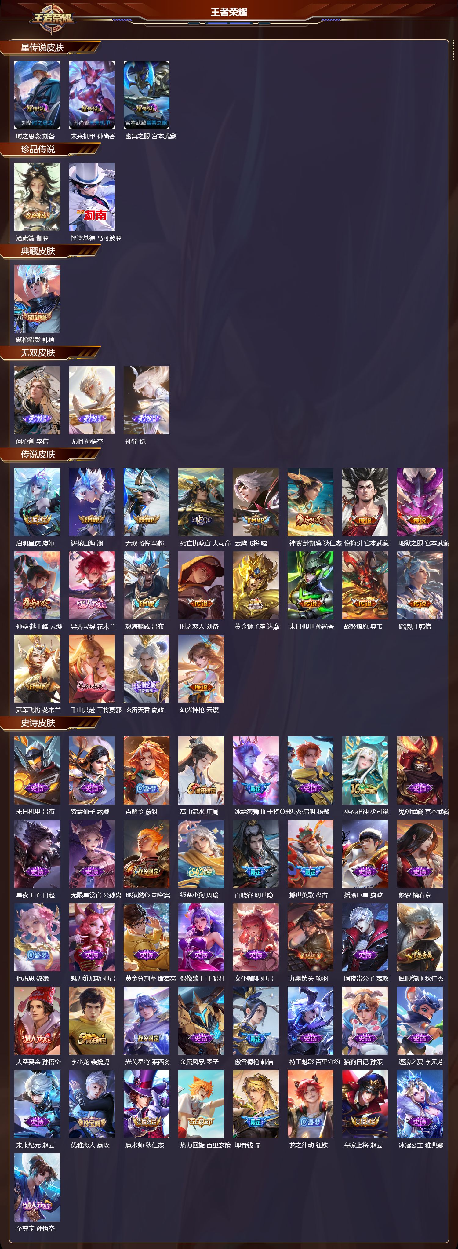 【69,史诗皮肤】,末日机甲,吕布,紫霞仙子,露娜,百解令,蒙犽,高山流水,庄周,冰霜恋舞曲,干将莫邪,天秀·启明,杨戬,巫礼祀神,少司缘,鬼剑武藏,宫本武藏,星夜王子,白起,无限星赏官,公孙离,地狱燃心,司空震,线条小狗,周瑜,百晓客,明世隐,撼世英歌,盘古,摇滚巨星,嬴政,修罗,橘右京,拒霜思,嫦娥,魅力维加斯,妲己,黄金分割率,诸葛亮,偶像歌手,王昭君,女仆咖啡,妲己,九幽镇关,项羽,暗夜贵公子,嬴政,鹰眼统帅,狄仁杰,大圣娶亲,孙悟空,李小龙,裴擒虎,光弋星穹,莱西奥,金属风暴,墨子,傲雪梅枪,韩信,特工魅影,百里守约,猫狗日记,孙策,逐浪之夏,李元芳,未来纪元,赵云,优雅恋人,嬴政,魔术师,狄仁杰,热力回旋,百里玄策,埋骨钱,暃,龙之律动,狂铁,皇家上将,赵云,冰冠公主,雅典娜,至尊宝,孙悟空,功夫厨神,程咬金,圣诞恋歌,貂蝉,水晶猎龙者,花木兰,涂山容容,公孙离,圣诞狂欢,吕布,魅语,不知火舞,群星魔术团,上官婉儿,器灵·浮梦炉,赵怀真,星界战将,牛魔,茶境仙,孙膑,蔷薇恋人,孙尚香,冰雪圆舞曲,甄姬,雪上飞焰,哪吒,千年之狐,李白,节奏热浪,阿轲,暗夜猫娘,阿轲,曙光守护者,铠,万灵启世,女娲,乱世虎臣,张飞,百相守梦,周瑜,龙胆,赵云,绅士熊喵,刘禅,百相守梦,百里守约,线条小狗,小乔,水果甜心,孙尚香,幽灵船长,曹操,乘风破浪,夏侯惇,暗隐猎兽者,兰陵王,