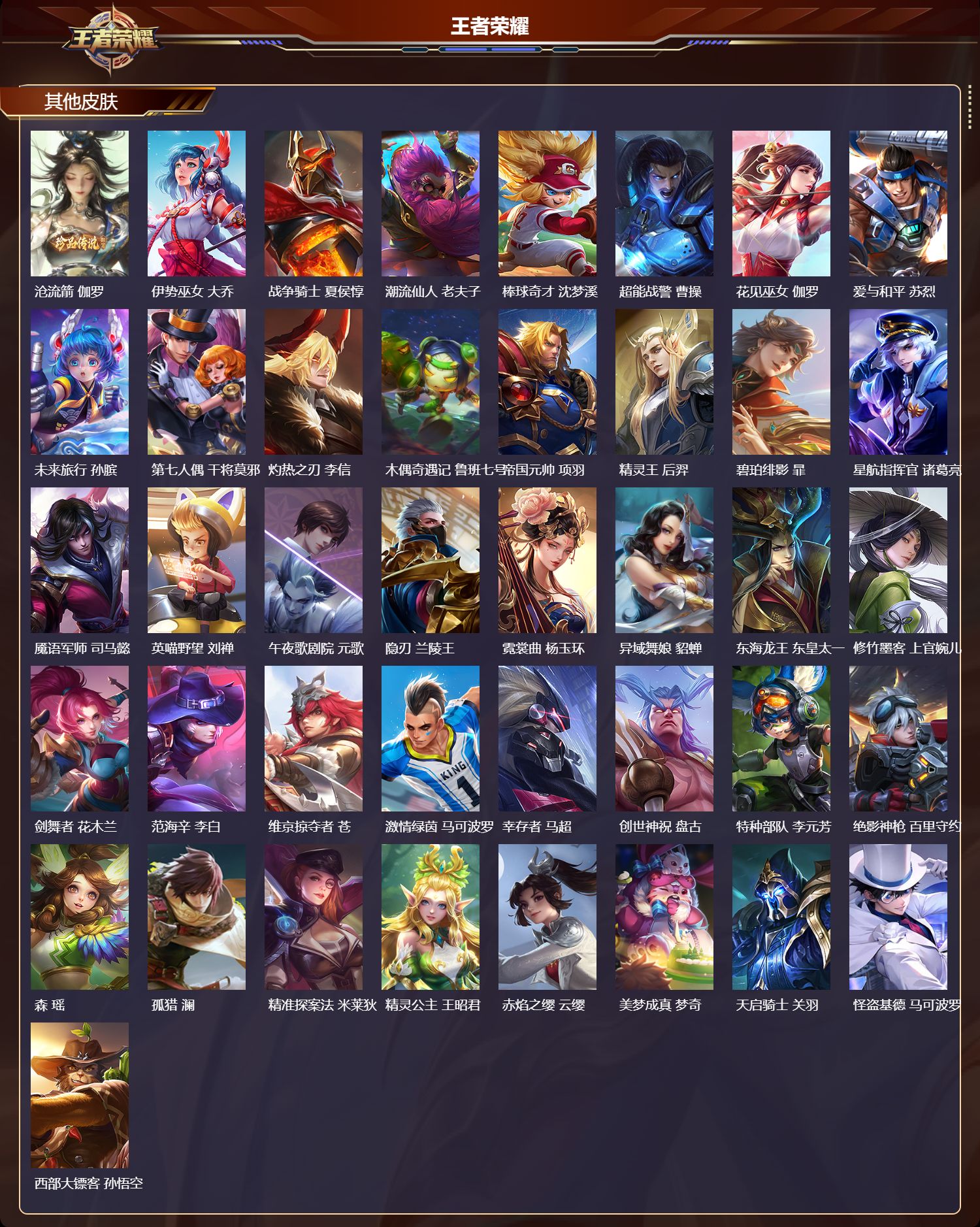 【41,其他皮肤】,沧流箭,伽罗,伊势巫女,大乔,战争骑士,夏侯惇,潮流仙人,老夫子,棒球奇才,沈梦溪,超能战警,曹操,花见巫女,伽罗,爱与和平,苏烈,未来旅行,孙膑,第七人偶,干将莫邪,灼热之刃,李信,木偶奇遇记,鲁班七号,帝国元帅,项羽,精灵王,后羿,碧珀绯影,暃,星航指挥官,诸葛亮,魇语军师,司马懿,英喵野望,刘禅,午夜歌剧院,元歌,隐刃,兰陵王,霓裳曲,杨玉环,异域舞娘,貂蝉,东海龙王,东皇太一,修竹墨客,上官婉儿,剑舞者,花木兰,范海辛,李白,维京掠夺者,苍,激情绿茵,马可波罗,幸存者,马超,创世神祝,盘古,特种部队,李元芳,绝影神枪,百里守约,森,瑶,孤猎,澜,精准探案法,米莱狄,精灵公主,王昭君,赤焰之缨,云缨,美梦成真,梦奇,天启骑士,关羽,怪盗基德,马可波罗,西部大镖客,孙悟空,
