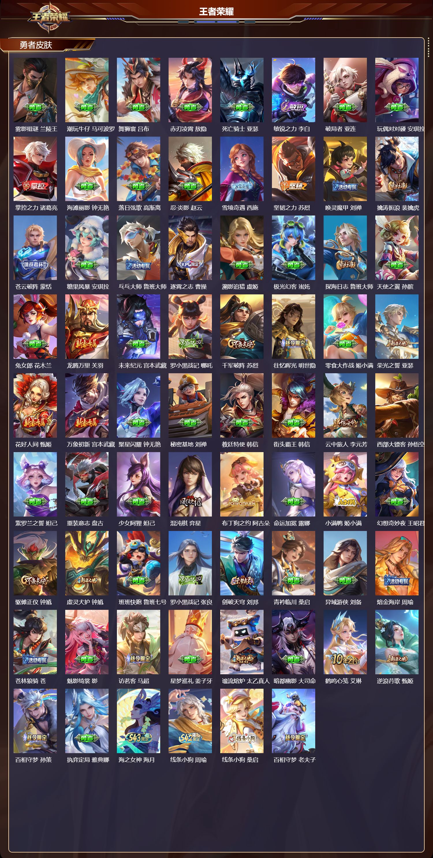 【112,勇者皮肤】,时空谍影,海诺,太极少年,赵怀真,沙漠行僧,达摩,拳王,达摩,大发明家,达摩,乐园追猎者,白起,丁香结,小乔,功夫炙烤,廉颇,铁甲之心,典韦,海盐诗旅,桑启,幻泉雾影,海月,醍醐杖,老夫子,汉昭烈帝,刘备,白色死神,白起,黄金武士,典韦,王牌新星,海月,阴阳师,狄仁杰,径山谋武,孙权,古海寻踪,张良,牛运亨通,牛魔,科学大爆炸,项羽,功夫老勺,老夫子,鲨炮海盗猫,沈梦溪,海滩派对,项羽,万华元夜,狄仁杰,克喵,鬼谷子,踏浪烽翎,莱西奥,演武夺筹,程咬金,红桃皇后,芈月,野性能量,吕布,守护之力,大乔,无双福将,程咬金,瓷语鉴心,露娜,百相守梦,影,原初探秘者,鬼谷子,潮玩探月行,猪八戒,天穹祈灯,鬼谷子,决胜大满贯,曹操,疑决卦,明世隐,化身博士,扁鹊,阿尔法小队,后羿,霸王丸,宫本武藏,雾影缉谜,兰陵王,潮玩牛仔,马可波罗,舞狮寰,吕布,赤刃凌霄,敖隐,死亡骑士,亚瑟,敏锐之力,李白,破局者,亚连,玩偶对对碰,安琪拉,掌控之力,诸葛亮,海滩丽影,钟无艳,落日弦歌,高渐离,忍·炎影,赵云,雪境奇遇,西施,坚韧之力,苏烈,唤灵魔甲,刘禅,擒涛扼浪,裴擒虎,苍云破阵,蒙恬,糖果风暴,安琪拉,乓乓大师,鲁班大师,逐霄之志,曹操,溯影追猎,虞姬,极光幻客,蚩奼,探海日志,鲁班大师,天使之翼,孙膑,兔女郎,花木兰,龙腾万里,关羽,未来纪元,宫本武藏,罗小黑战记,哪吒,千军破阵,苏烈,往忆晖光,明世隐,零食大作战,姬小满,荣光之誓,亚瑟,花好人间,甄姬,万象初新,宫本武藏,聚星闪耀,钟无艳,秘密基地,刘禅,教廷特使,韩信,街头霸王,韩信,云中旅人,李元芳,西部大镖客,孙悟空,紫罗兰之誓,妲己,重装意志,盘古,少女阿狸,妲己,混沌棋,弈星,布丁狗之约,阿古朵,命运加冕,露娜,小满鸭,姬小满,幻想奇妙夜,王昭君,驱傩正仪,钟馗,虚灵犬护,钟馗,班班快跑,鲁班七号,罗小黑战记,张良,剑破天穹,刘邦,青衿临川,桑启,异域游侠,刘备,熔金海岸,周瑜,苍林狼骑,苍,魅影绮裳,影,访茗客,马超,星梦巡礼,姜子牙,谧流熔炉,太乙真人,暗都幽影,大司命,鹤鸣心笺,艾琳,逆浪荇歌,甄姬,百相守梦,孙策,执弈定局,雅典娜,海之女神,海月,线条小狗,周瑜,线条小狗,桑启,百相守梦,老夫子,