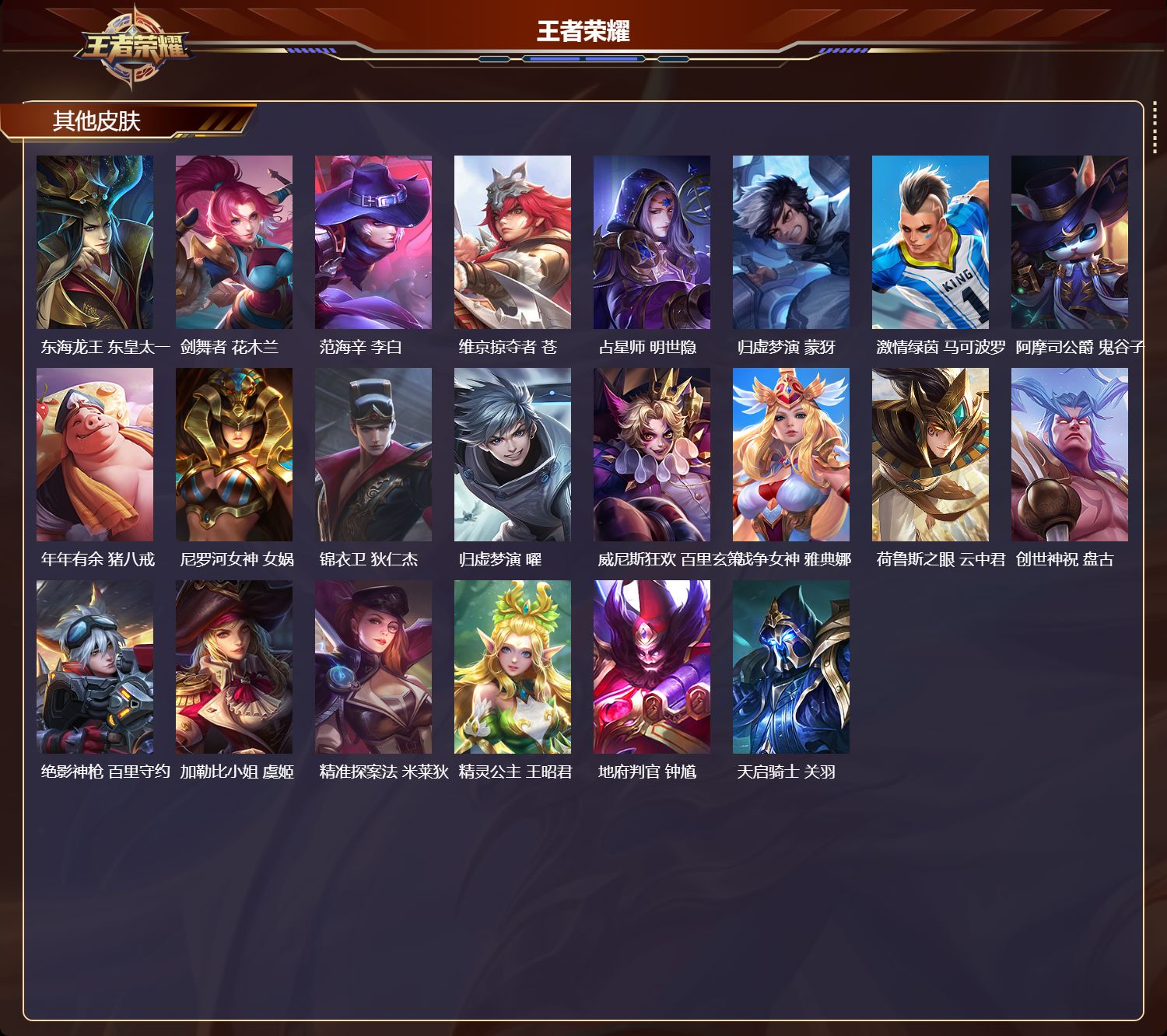【46,其他皮肤】,金属狂潮,高渐离,战争骑士,夏侯惇,圣殿之光,刘邦,芝加哥教父,黄忠,潮流仙人,老夫子,三太子,哪吒,龙域领主,铠,超能战警,曹操,第七人偶,干将莫邪,万圣前夜,小乔,灼热之刃,李信,熊喵少女,阿古朵,海之征途,孙策,福禄兄弟,鲁班七号,帝国元帅,项羽,冰刃幻境,镜,碧珀绯影,暃,星航指挥官,诸葛亮,魇语军师,司马懿,英喵野望,刘禅,午夜歌剧院,元歌,启蛰,司空震,隐刃,兰陵王,街头旋风,裴擒虎,东海龙王,东皇太一,剑舞者,花木兰,范海辛,李白,维京掠夺者,苍,占星师,明世隐,归虚梦演,蒙犽,激情绿茵,马可波罗,阿摩司公爵,鬼谷子,年年有余,猪八戒,尼罗河女神,女娲,锦衣卫,狄仁杰,归虚梦演,曜,威尼斯狂欢,百里玄策,战争女神,雅典娜,荷鲁斯之眼,云中君,创世神祝,盘古,绝影神枪,百里守约,加勒比小姐,虞姬,精准探案法,米莱狄,精灵公主,王昭君,地府判官,钟馗,天启骑士,关羽,