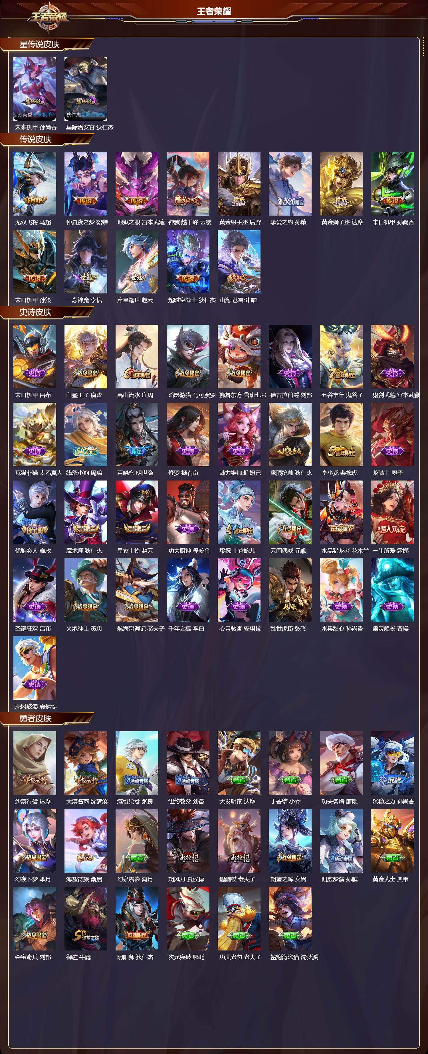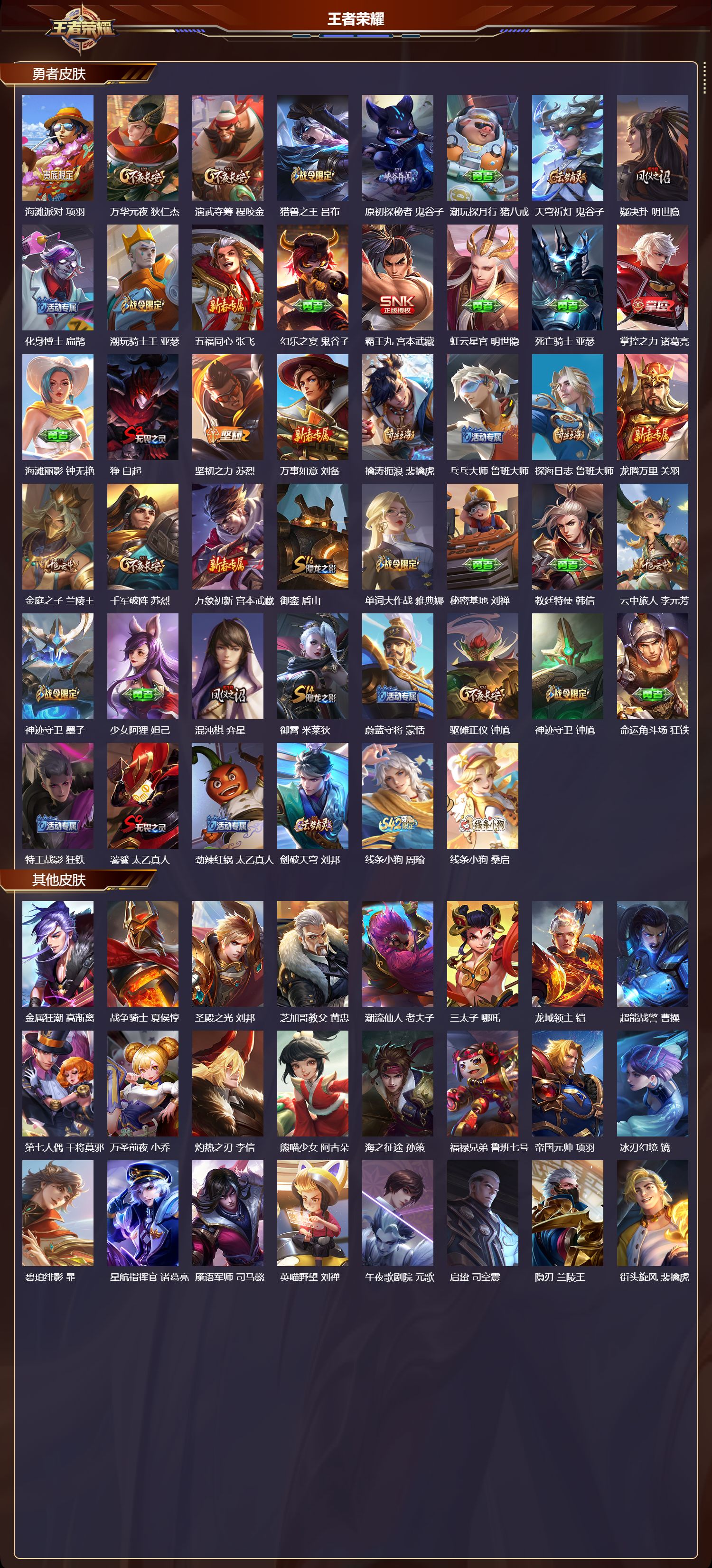 【68,勇者皮肤】,沙漠行僧,达摩,大漠名商,沈梦溪,缤纷绘卷,张良,纽约教父,刘备,大发明家,达摩,丁香结,小乔,功夫炙烤,廉颇,沉稳之力,孙尚香,幻夜卜梦,芈月,海盐诗旅,桑启,幻泉雾影,海月,朔风刀,夏侯惇,醍醐杖,老夫子,朔望之晖,女娲,归虚梦演,孙膑,黄金武士,典韦,夺宝奇兵,刘邦,御旌,牛魔,阴阳师,狄仁杰,次元突破,哪吒,功夫老勺,老夫子,鲨炮海盗猫,沈梦溪,海滩派对,项羽,万华元夜,狄仁杰,演武夺筹,程咬金,猎兽之王,吕布,原初探秘者,鬼谷子,潮玩探月行,猪八戒,天穹祈灯,鬼谷子,疑决卦,明世隐,化身博士,扁鹊,潮玩骑士王,亚瑟,五福同心,张飞,幻乐之宴,鬼谷子,霸王丸,宫本武藏,虹云星官,明世隐,死亡骑士,亚瑟,掌控之力,诸葛亮,海滩丽影,钟无艳,狰,白起,坚韧之力,苏烈,万事如意,刘备,擒涛扼浪,裴擒虎,乓乓大师,鲁班大师,探海日志,鲁班大师,龙腾万里,关羽,金庭之子,兰陵王,千军破阵,苏烈,万象初新,宫本武藏,御銮,盾山,单词大作战,雅典娜,秘密基地,刘禅,教廷特使,韩信,云中旅人,李元芳,神迹守卫,墨子,少女阿狸,妲己,混沌棋,弈星,御霄,米莱狄,蔚蓝守将,蒙恬,驱傩正仪,钟馗,神迹守卫,钟馗,命运角斗场,狂铁,特工战影,狂铁,饕餮,太乙真人,劲辣红锅,太乙真人,剑破天穹,刘邦,线条小狗,周瑜,线条小狗,桑启,