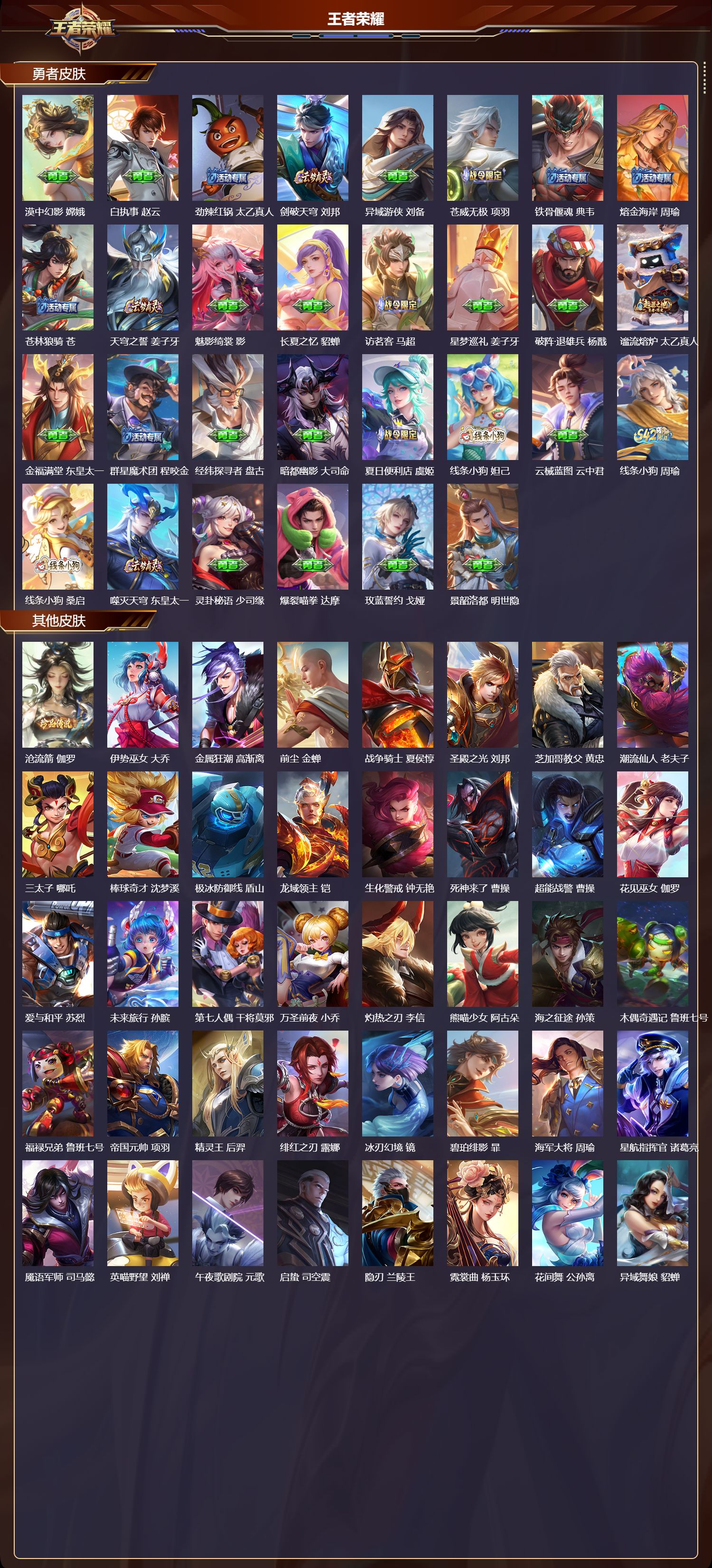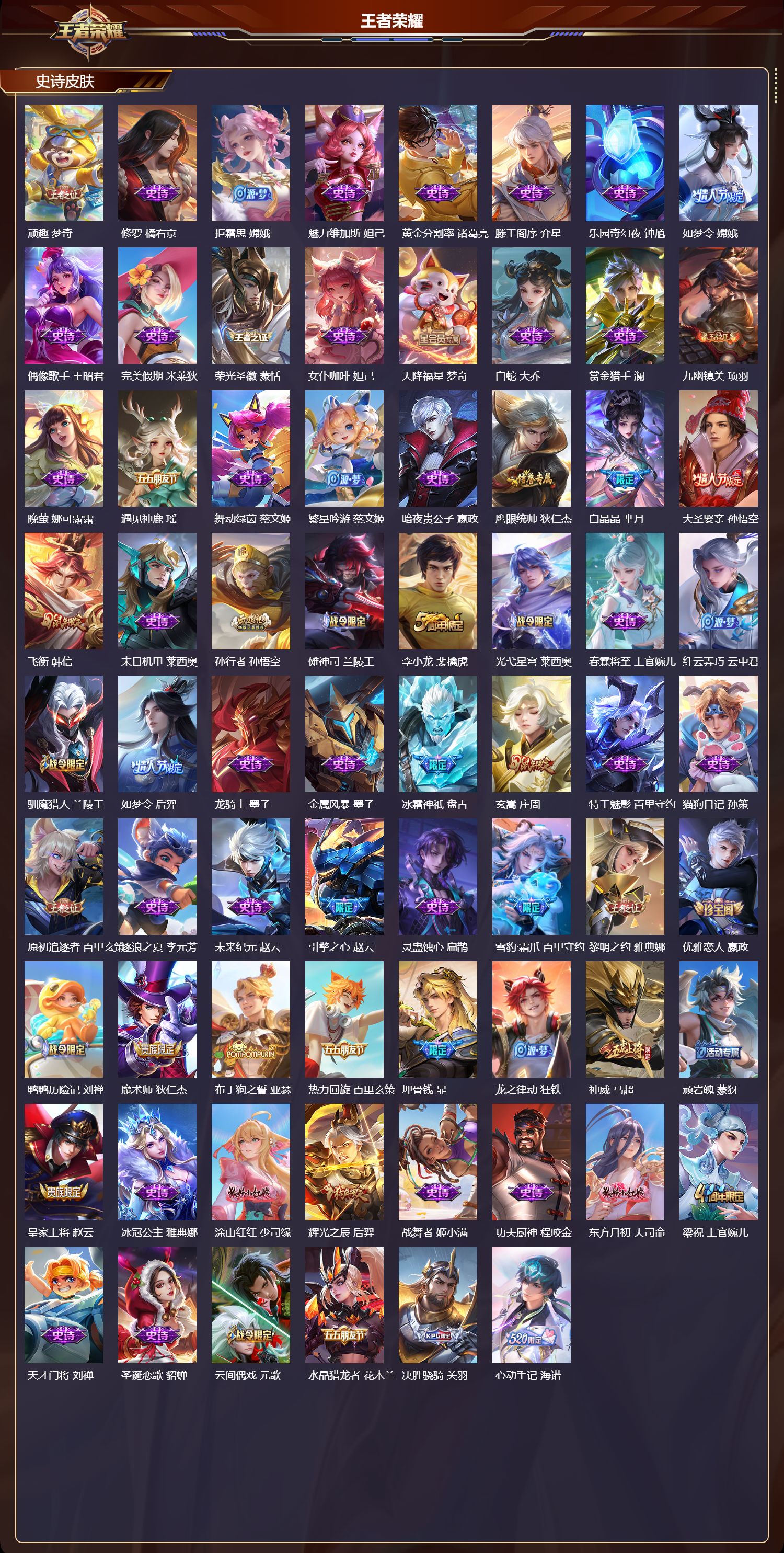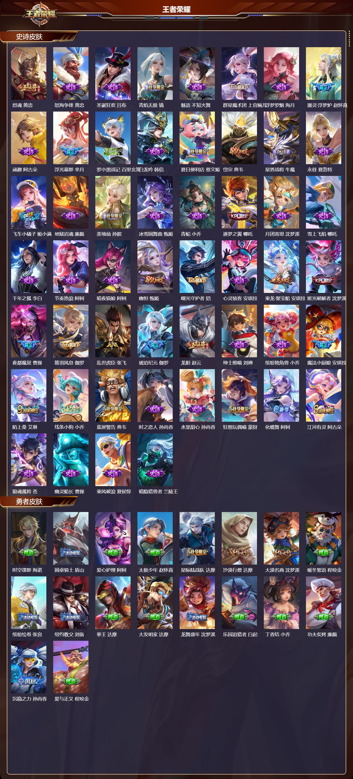 【167,史诗皮肤】奔雷神使,牛魔,龙鼓争鸣,蒙犽,时之奇旅,安琪拉,电玩小子,鲁班七号,末日机甲,吕布,白昼王子,嬴政,蔬乡物语,鲁班七号,超元猎域,百里玄策,紫霞仙子,露娜,百解令,蒙犽,雪夜绮愿,周瑜,奇遇舞章,艾琳,唐三藏,金蝉,暗渊魔法,司马懿,匿光决锋者,夏侯惇,乘龙·忆丹青,大乔,暗影游猎,马可波罗,燃音魔法,高渐离,冰霜恋舞曲,干将莫邪,白鹤梁神女,大乔,苍穹之光,项羽,天秀·启明,杨戬,狮舞东方,鲁班七号,猫狗日记,大乔,德古拉伯爵,刘邦,山海·玄木吟,马可波罗,心灵战警,亚瑟,星君·亢金,达摩,五谷丰年,鬼谷子,银翎春语,杨玉环,诗语江南,西施,无心,元歌,鬼剑武藏,宫本武藏,星夜王子,白起,寅虎·心曲,杨玉环,无限星赏官,公孙离,千筹问战,张良,地狱燃心,司空震,瓦猫非猫,太乙真人,锁墨魂,钟馗,线条小狗,周瑜,玉兔公主,公孙离,百晓客,明世隐,遇见飞天,杨玉环,摇滚巨星,嬴政,顽趣,梦奇,修罗,橘右京,拒霜思,嫦娥,魅力维加斯,妲己,黄金分割率,诸葛亮,滕王阁序,弈星,乐园奇幻夜,钟馗,如梦令,嫦娥,偶像歌手,王昭君,完美假期,米莱狄,荣光圣徽,蒙恬,女仆咖啡,妲己,天降福星,梦奇,白蛇,大乔,赏金猎手,澜,九幽镇关,项羽,晚萤,娜可露露,遇见神鹿,瑶,舞动绿茵,蔡文姬,繁星吟游,蔡文姬,暗夜贵公子,嬴政,鹰眼统帅,狄仁杰,白晶晶,芈月,大圣娶亲,孙悟空,飞衡,韩信,末日机甲,莱西奥,孙行者,孙悟空,傩神司,兰陵王,李小龙,裴擒虎,光弋星穹,莱西奥,春霖将至,上官婉儿,纤云弄巧,云中君,驯魔猎人,兰陵王,如梦令,后羿,龙骑士,墨子,金属风暴,墨子,冰霜神祇,盘古,玄嵩,庄周,特工魅影,百里守约,猫狗日记,孙策,原初追逐者,百里玄策,逐浪之夏,李元芳,未来纪元,赵云,引擎之心,赵云,灵蛊蚀心,扁鹊,雪豹·霜爪,百里守约,黎明之约,雅典娜,优雅恋人,嬴政,鸭鸭历险记,刘禅,魔术师,狄仁杰,布丁狗之誓,亚瑟,热力回旋,百里玄策,埋骨钱,暃,龙之律动,狂铁,神威,马超,顽岩魄,蒙犽,皇家上将,赵云,冰冠公主,雅典娜,涂山红红,少司缘,辉光之辰,后羿,战舞者,姬小满,功夫厨神,程咬金,东方月初,大司命,梁祝,上官婉儿,天才门将,刘禅,圣诞恋歌,貂蝉,云间偶戏,元歌,水晶猎龙者,花木兰,决胜骁骑,关羽,心动手记,海诺,烈魂,黄忠,怒海争锋,黄忠,圣诞狂欢,吕布,青焰无极,镜,魅语,不知火舞,群星魔术团,上官婉儿,浮梦罗烟,海月,器灵·浮梦炉,赵怀真,顽趣,阿古朵,浮光幕影,芈月,罗小黑战记,百里玄策,白龙吟,韩信,夏日便利店,蔡文姬,岱宗,典韦,星界战将,牛魔,永昼,夏洛特,飞车小橘子,姬小满,地狱岩魂,廉颇,茶境仙,孙膑,冰雪圆舞曲,甄姬,青蛇,小乔,逐梦之翼,哪吒,月团寄思,沈梦溪,雪上飞焰,哪吒,千年之狐,李白,节奏热浪,阿轲,暗夜猫娘,阿轲,幽恒,甄姬,曙光守护者,铠,心灵骇客,安琪拉,乘龙·聚宝船,安琪拉,匿光破解者,沈梦溪,夜都魔契,曹操,箭羽风息,伽罗,乱世虎臣,张飞,琥珀纪元,伽罗,龙胆,赵云,绅士熊喵,刘禅,缤纷独角兽,小乔,魔法小厨娘,安琪拉,陌上桑,艾琳,线条小狗,小乔,蓝屏警告,典韦,时之恋人,孙尚香,水果甜心,孙尚香,狂想玩偶喵,蒙犽,化蝶舞,阿轲,江河有灵,阿古朵,狼魂孤将,苍,幽灵船长,曹操,乘风破浪,夏侯惇,暗隐猎兽者,兰陵王,