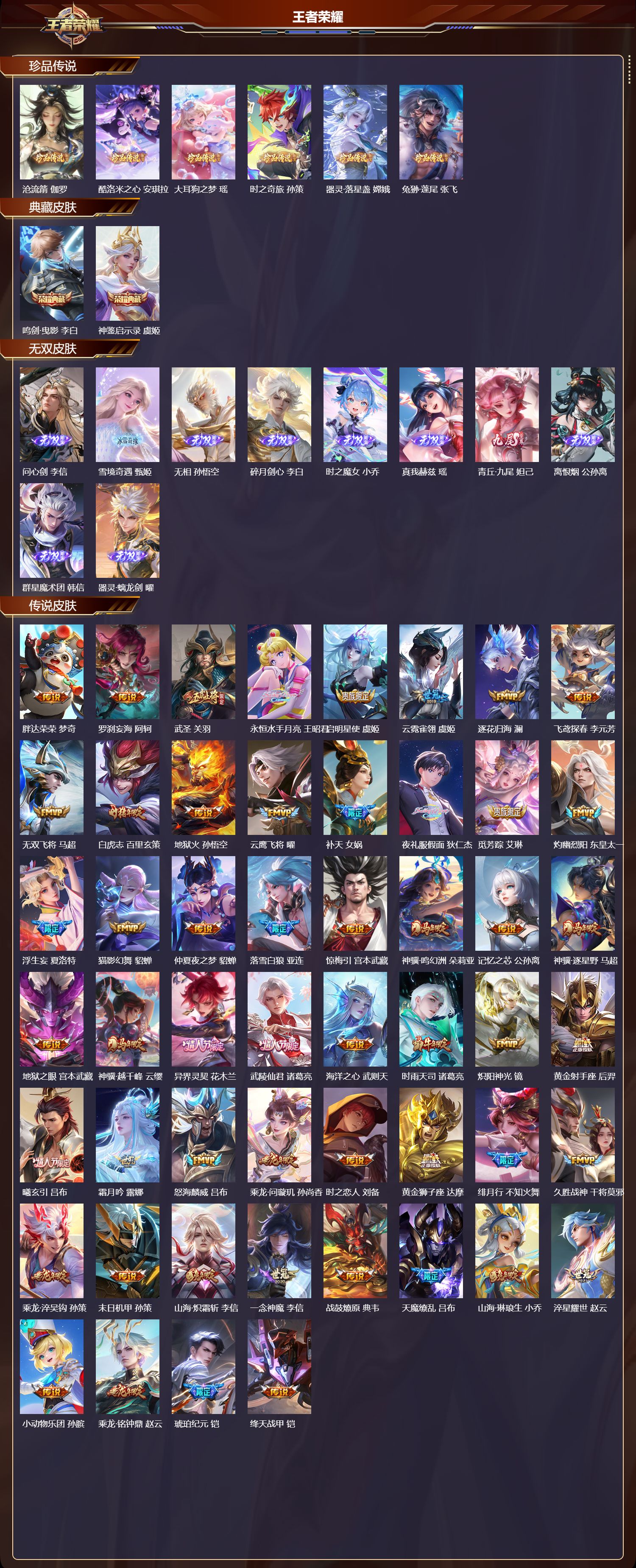 【77,传说皮肤】胖达荣荣,梦奇,罗刹妄海,阿轲,武圣,关羽,永恒水手月亮,王昭君,启明星使,虞姬,云霓雀翎,虞姬,逐花归海,澜,飞鸢探春,李元芳,无双飞将,马超,白虎志,百里玄策,地狱火,孙悟空,云鹰飞将,曜,补天,女娲,夜礼服假面,狄仁杰,觅芳踪,艾琳,灼幽烈阳,东皇太一,浮生妄,夏洛特,猫影幻舞,貂蝉,仲夏夜之梦,貂蝉,落雪白狼,亚连,惊梅引,宫本武藏,神骥·鸣幻洲,朵莉亚,记忆之芯,公孙离,神骥·逐星野,马超,地狱之眼,宫本武藏,神骥·越千峰,云缨,异界灵契,花木兰,武陵仙君,诸葛亮,海洋之心,武则天,时雨天司,诸葛亮,炽阳神光,镜,黄金射手座,后羿,曦玄引,吕布,霜月吟,露娜,怒海麟威,吕布,乘龙·问璇玑,孙尚香,时之恋人,刘备,黄金狮子座,达摩,绯月行,不知火舞,久胜战神,干将莫邪,乘龙·淬吴钩,孙策,末日机甲,孙策,山海·炽霜斩,李信,一念神魔,李信,战鼓燎原,典韦,天魔缭乱,吕布,山海·琳琅生,小乔,淬星耀世,赵云,小动物乐团,孙膑,乘龙·铭钟鼎,赵云,琥珀纪元,铠,绛天战甲,铠,妄想实况,马可波罗,寅虎·赤拳,裴擒虎,超时空战士,狄仁杰,山海·苍雷引,曜,琥珀纪元,马超,霜北刀,夏侯惇,冠军飞将,花木兰,黄金白羊座,张良,金乌负日,海月,心动手记,朵莉亚,愿照·九州拓,澜,黄金天蝎座,墨子,玄雷天君,嬴政,愿照·众生和,妲己,愿照·福禄聚,蔡文姬,幻光神枪,云缨,愿照·山河定,司空震,祥瑞亨通,裴擒虎,愿照·岁时盈,虞姬,千劫归真,后羿,愿照·千秋盛,女娲,曦玄引,貂蝉,鸣野蒿,桑启,云诺千山,公孙离,续相思,西施,