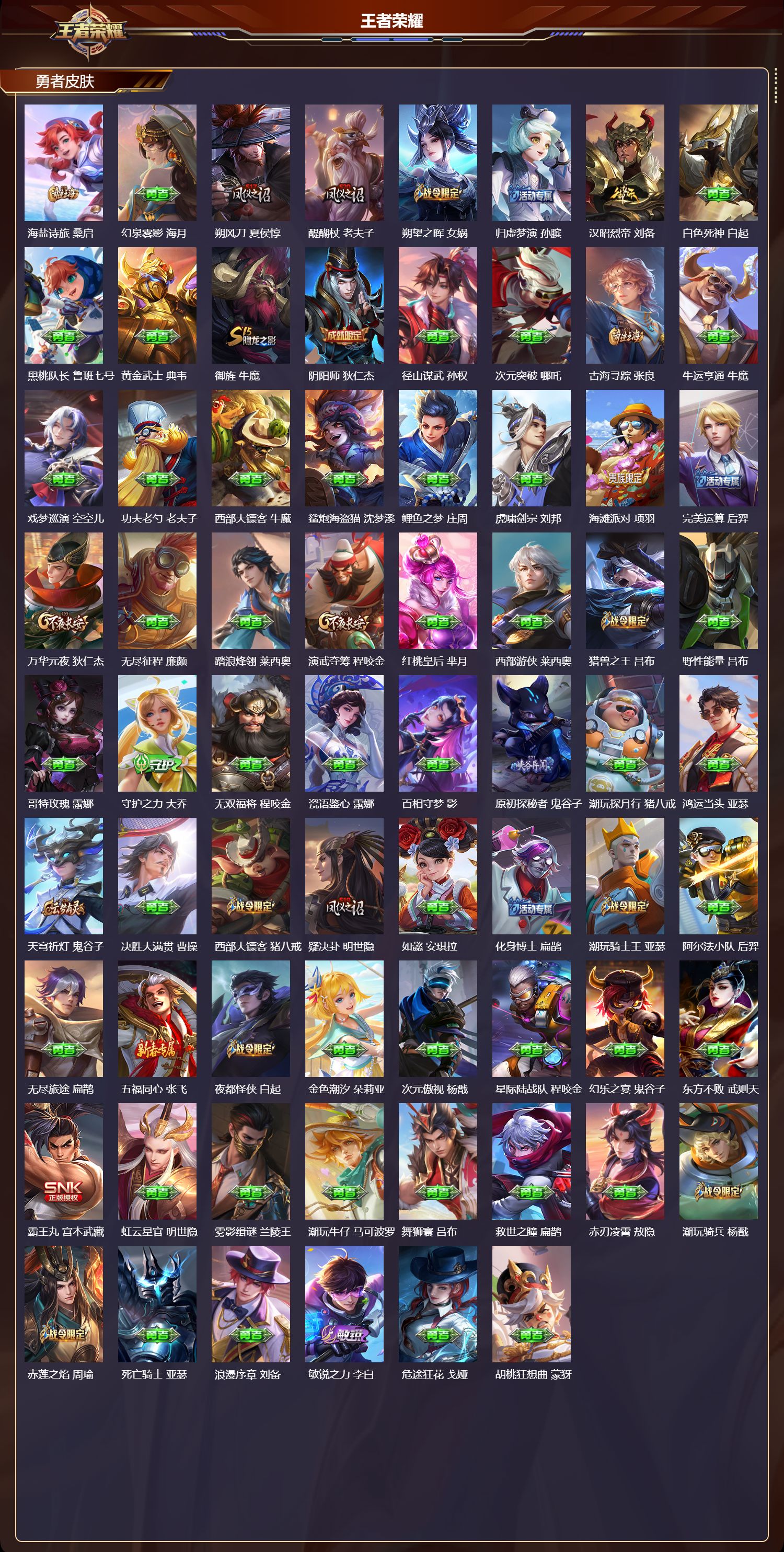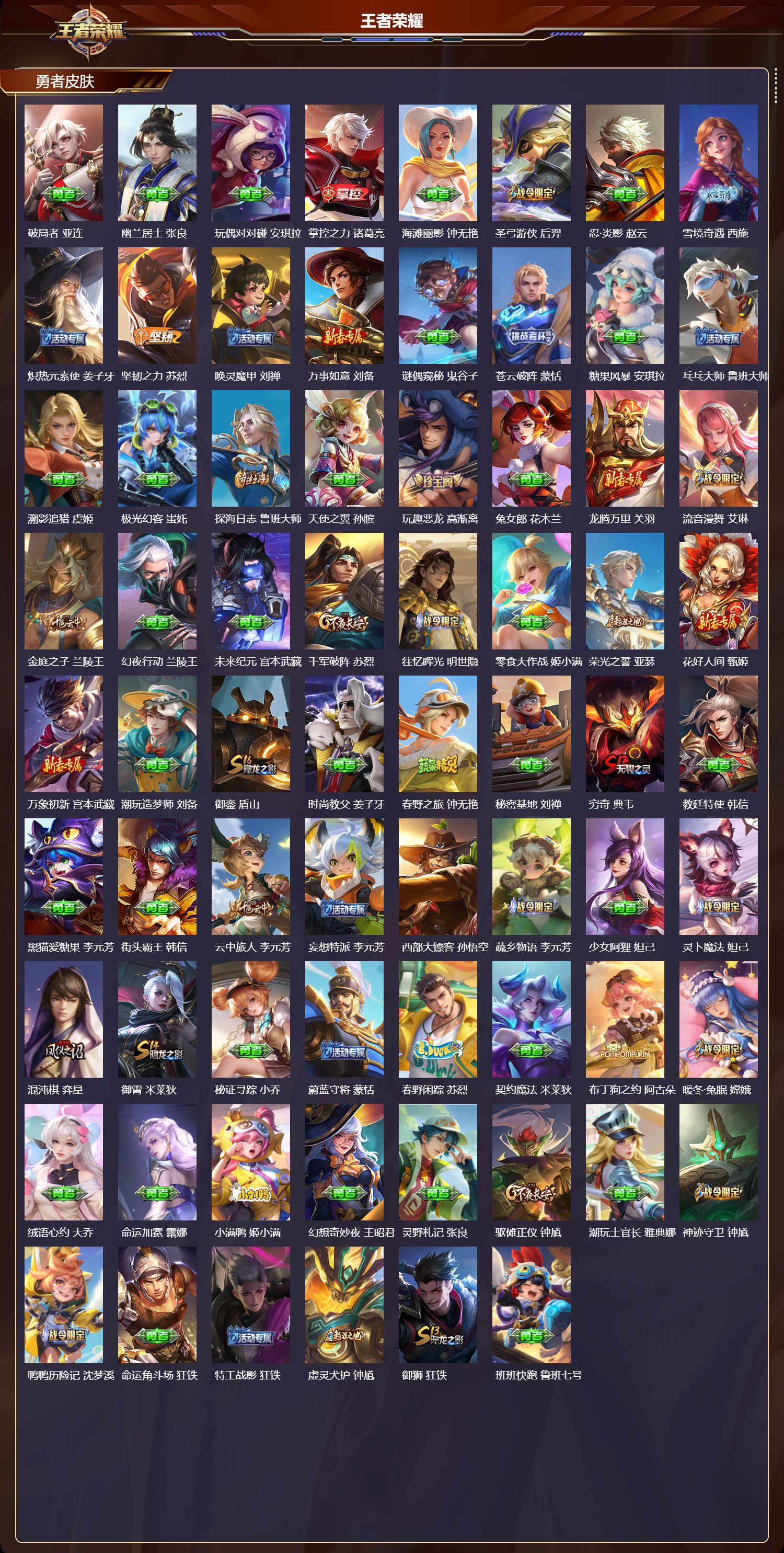 【188,勇者皮肤】时空谍影,海诺,圆桌骑士,盾山,爱心护理,阿轲,太极少年,赵怀真,星际陆战队,达摩,沙漠行僧,达摩,大漠名商,沈梦溪,暖冬絮语,程咬金,缤纷绘卷,张良,纽约教父,刘备,拳王,达摩,大发明家,达摩,龙舞盛年,沈梦溪,乐园追猎者,白起,丁香结,小乔,功夫炙烤,廉颇,沉稳之力,孙尚香,爱与正义,程咬金,海盐诗旅,桑启,幻泉雾影,海月,朔风刀,夏侯惇,醍醐杖,老夫子,朔望之晖,女娲,归虚梦演,孙膑,汉昭烈帝,刘备,白色死神,白起,黑桃队长,鲁班七号,黄金武士,典韦,御旌,牛魔,阴阳师,狄仁杰,径山谋武,孙权,次元突破,哪吒,古海寻踪,张良,牛运亨通,牛魔,戏梦巡演,空空儿,功夫老勺,老夫子,西部大镖客,牛魔,鲨炮海盗猫,沈梦溪,鲤鱼之梦,庄周,虎啸剑宗,刘邦,海滩派对,项羽,完美运算,后羿,万华元夜,狄仁杰,无尽征程,廉颇,踏浪烽翎,莱西奥,演武夺筹,程咬金,红桃皇后,芈月,西部游侠,莱西奥,猎兽之王,吕布,野性能量,吕布,哥特玫瑰,露娜,守护之力,大乔,无双福将,程咬金,瓷语鉴心,露娜,百相守梦,影,原初探秘者,鬼谷子,潮玩探月行,猪八戒,鸿运当头,亚瑟,天穹祈灯,鬼谷子,决胜大满贯,曹操,西部大镖客,猪八戒,疑决卦,明世隐,如懿,安琪拉,化身博士,扁鹊,潮玩骑士王,亚瑟,阿尔法小队,后羿,无尽旅途,扁鹊,五福同心,张飞,夜都怪侠,白起,金色潮汐,朵莉亚,次元傲视,杨戬,星际陆战队,程咬金,幻乐之宴,鬼谷子,东方不败,武则天,霸王丸,宫本武藏,虹云星官,明世隐,雾影缉谜,兰陵王,潮玩牛仔,马可波罗,舞狮寰,吕布,救世之瞳,扁鹊,赤刃凌霄,敖隐,潮玩骑兵,杨戬,赤莲之焰,周瑜,死亡骑士,亚瑟,浪漫序章,刘备,敏锐之力,李白,危途狂花,戈娅,胡桃狂想曲,蒙犽,破局者,亚连,幽兰居士,张良,玩偶对对碰,安琪拉,掌控之力,诸葛亮,海滩丽影,钟无艳,圣弓游侠,后羿,忍·炎影,赵云,雪境奇遇,西施,炽热元素使,姜子牙,坚韧之力,苏烈,唤灵魔甲,刘禅,万事如意,刘备,谜偶窥秘,鬼谷子,苍云破阵,蒙恬,糖果风暴,安琪拉,乓乓大师,鲁班大师,溯影追猎,虞姬,极光幻客,蚩奼,探海日志,鲁班大师,天使之翼,孙膑,玩趣恶龙,高渐离,兔女郎,花木兰,龙腾万里,关羽,流音漫舞,艾琳,金庭之子,兰陵王,幻夜行动,兰陵王,未来纪元,宫本武藏,千军破阵,苏烈,往忆晖光,明世隐,零食大作战,姬小满,荣光之誓,亚瑟,花好人间,甄姬,万象初新,宫本武藏,潮玩造梦师,刘备,御銮,盾山,时尚教父,姜子牙,春野之旅,钟无艳,秘密基地,刘禅,穷奇,典韦,教廷特使,韩信,黑猫爱糖果,李元芳,街头霸王,韩信,云中旅人,李元芳,妄想特派,李元芳,西部大镖客,孙悟空,蔬乡物语,李元芳,少女阿狸,妲己,灵卜魔法,妲己,混沌棋,弈星,御霄,米莱狄,秘证寻踪,小乔,蔚蓝守将,蒙恬,春野闲踪,苏烈,契约魔法,米莱狄,布丁狗之约,阿古朵,暖冬·兔眠,嫦娥,绒语心约,大乔,命运加冕,露娜,小满鸭,姬小满,幻想奇妙夜,王昭君,灵野札记,张良,驱傩正仪,钟馗,潮玩士官长,雅典娜,神迹守卫,钟馗,鸭鸭历险记,沈梦溪,命运角斗场,狂铁,特工战影,狂铁,虚灵犬护,钟馗,御狮,狂铁,班班快跑,鲁班七号,漠中幻影,嫦娥,白执事,赵云,劲辣红锅,太乙真人,剑破天穹,刘邦,异域游侠,刘备,苍威无极,项羽,铁骨偃魂,典韦,熔金海岸,周瑜,苍林狼骑,苍,天穹之誓,姜子牙,魅影绮裳,影,长夏之忆,貂蝉,访茗客,马超,星梦巡礼,姜子牙,破阵·退雄兵,杨戬,谧流熔炉,太乙真人,金福满堂,东皇太一,群星魔术团,程咬金,经纬探寻者,盘古,暗都幽影,大司命,夏日便利店,虞姬,线条小狗,妲己,云械蓝图,云中君,线条小狗,周瑜,线条小狗,桑启,噬灭天穹,东皇太一,灵卦秘语,少司缘,爆裂喵拳,达摩,玫蓝誓约,戈娅,景韶洛都,明世隐,