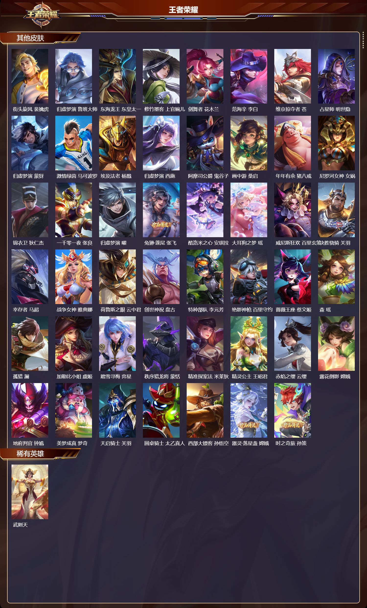【87,其他皮肤】沧流箭,伽罗,伊势巫女,大乔,金属狂潮,高渐离,前尘,金蝉,战争骑士,夏侯惇,圣殿之光,刘邦,芝加哥教父,黄忠,潮流仙人,老夫子,三太子,哪吒,棒球奇才,沈梦溪,极冰防御线,盾山,龙域领主,铠,生化警戒,钟无艳,死神来了,曹操,超能战警,曹操,花见巫女,伽罗,爱与和平,苏烈,未来旅行,孙膑,第七人偶,干将莫邪,万圣前夜,小乔,灼热之刃,李信,熊喵少女,阿古朵,海之征途,孙策,木偶奇遇记,鲁班七号,福禄兄弟,鲁班七号,帝国元帅,项羽,精灵王,后羿,绯红之刃,露娜,冰刃幻境,镜,碧珀绯影,暃,海军大将,周瑜,星航指挥官,诸葛亮,魇语军师,司马懿,英喵野望,刘禅,午夜歌剧院,元歌,启蛰,司空震,隐刃,兰陵王,霓裳曲,杨玉环,花间舞,公孙离,异域舞娘,貂蝉,街头旋风,裴擒虎,归虚梦演,鲁班大师,东海龙王,东皇太一,修竹墨客,上官婉儿,剑舞者,花木兰,范海辛,李白,维京掠夺者,苍,占星师,明世隐,归虚梦演,蒙犽,激情绿茵,马可波罗,埃及法老,杨戬,归虚梦演,西施,阿摩司公爵,鬼谷子,画中游,桑启,年年有余,猪八戒,尼罗河女神,女娲,锦衣卫,狄仁杰,一千零一夜,张良,归虚梦演,曜,兔狲·蓬尾,张飞,酷洛米之心,安琪拉,大耳狗之梦,瑶,威尼斯狂欢,百里玄策,决胜骁骑,关羽,幸存者,马超,战争女神,雅典娜,荷鲁斯之眼,云中君,创世神祝,盘古,特种部队,李元芳,绝影神枪,百里守约,蔷薇王座,蔡文姬,森,瑶,孤猎,澜,加勒比小姐,虞姬,踏雪寻梅,弈星,秩序猎龙将,蒙恬,精准探案法,米莱狄,精灵公主,王昭君,赤焰之缨,云缨,露花倒影,嫦娥,地府判官,钟馗,美梦成真,梦奇,天启骑士,关羽,圆桌骑士,太乙真人,西部大镖客,孙悟空,器灵·落星盏,嫦娥,时之奇旅,孙策,
