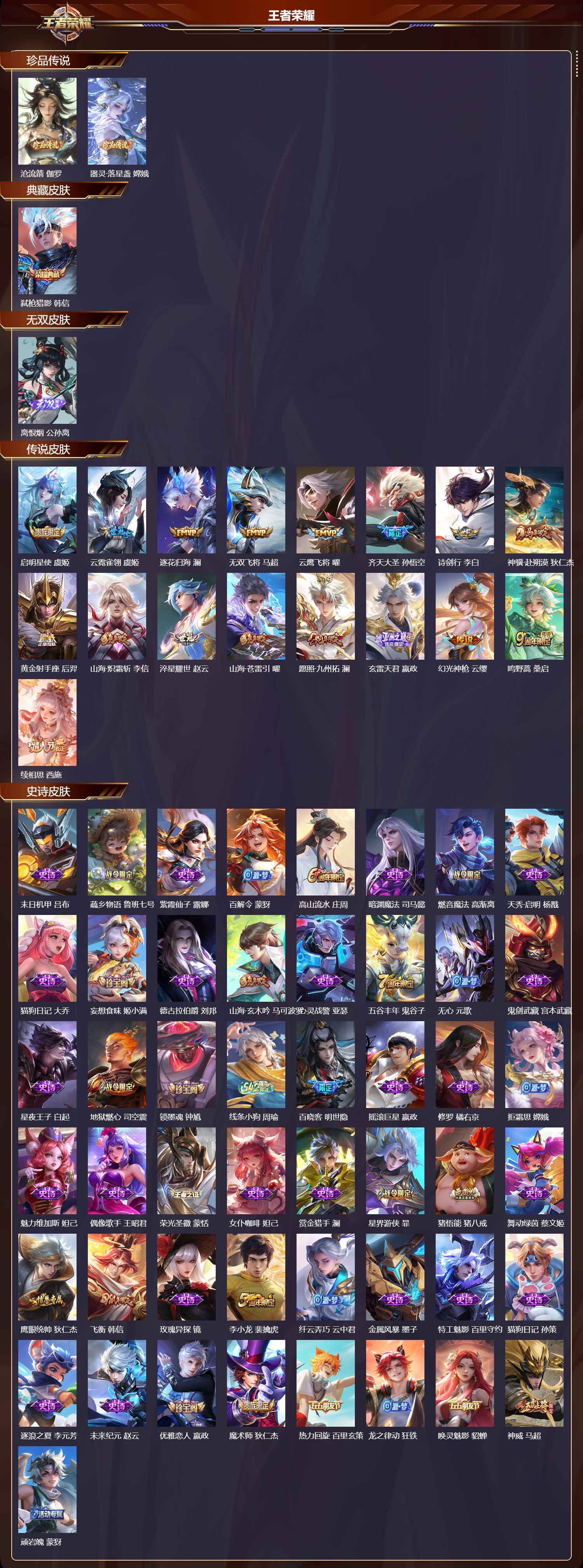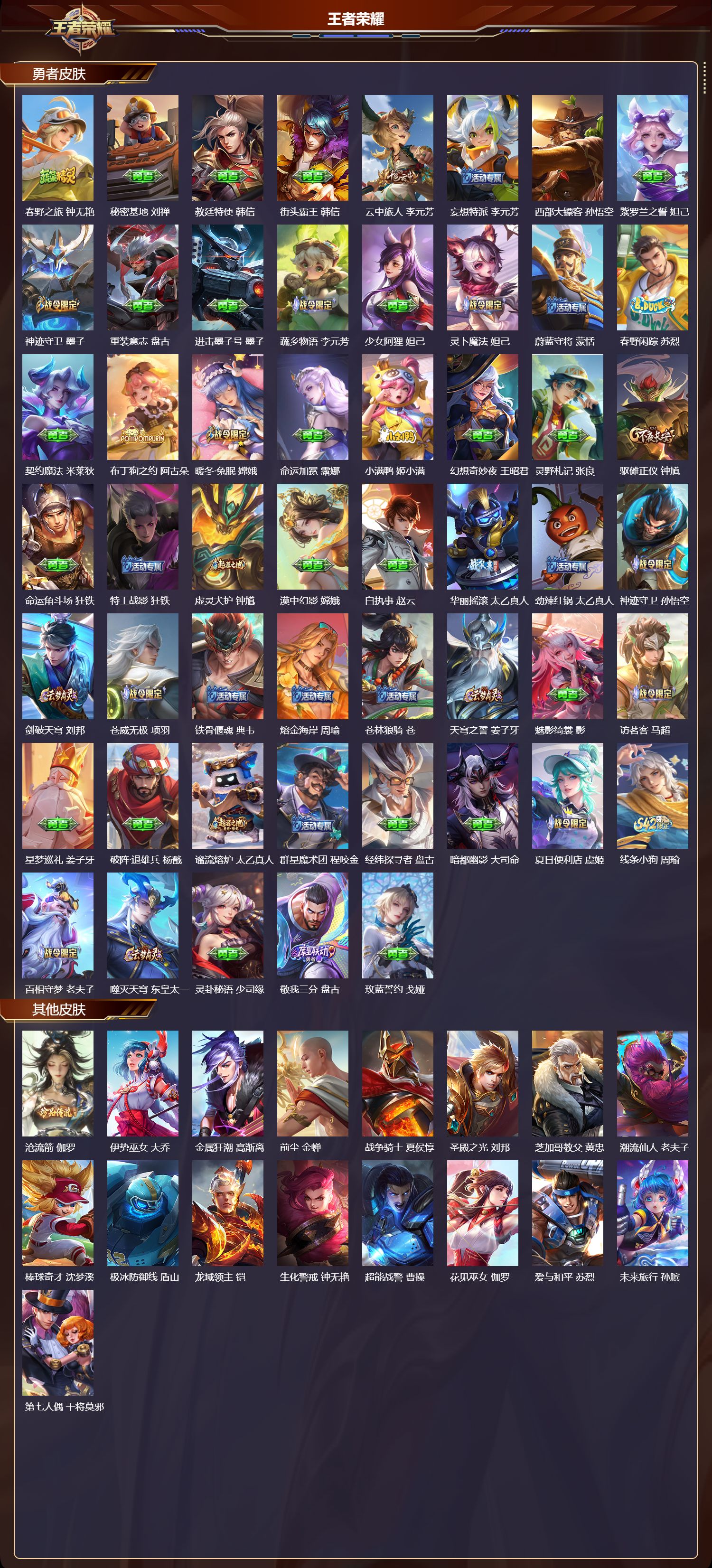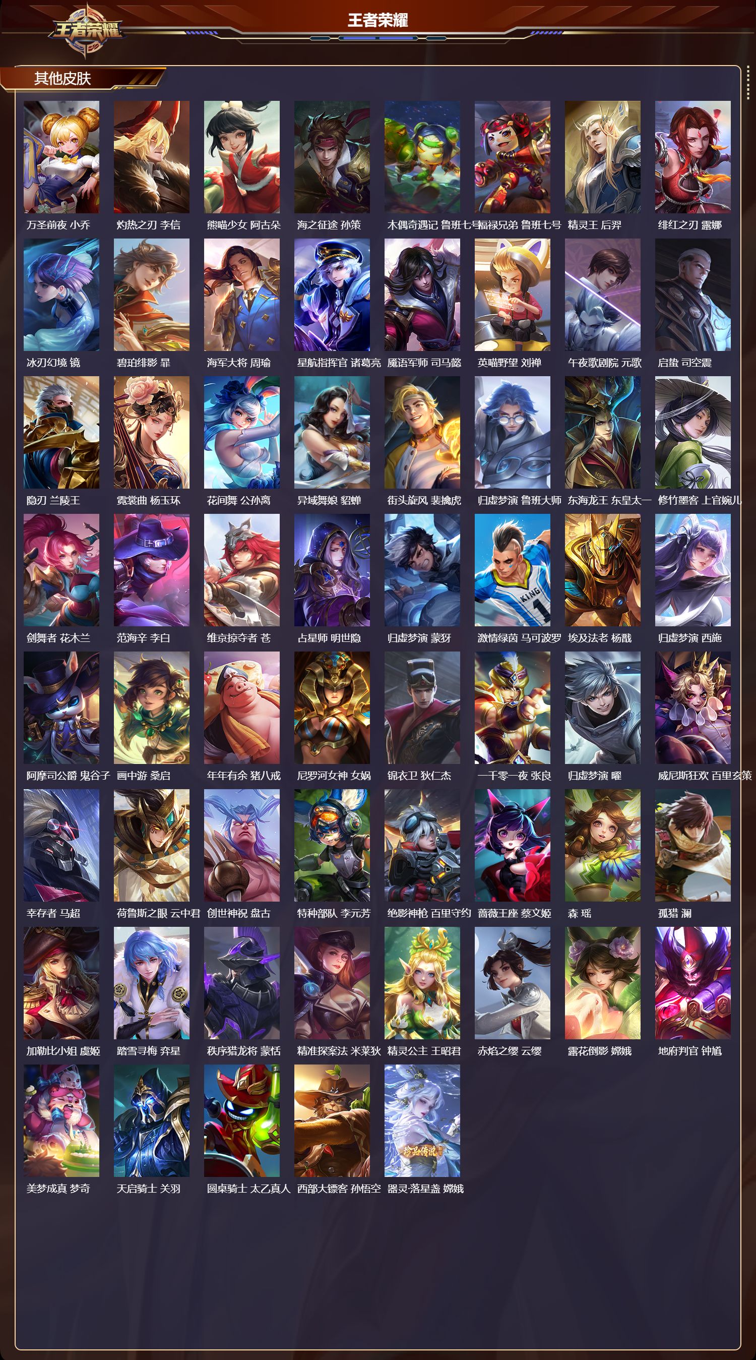 【78,其他皮肤】沧流箭,伽罗,伊势巫女,大乔,金属狂潮,高渐离,前尘,金蝉,战争骑士,夏侯惇,圣殿之光,刘邦,芝加哥教父,黄忠,潮流仙人,老夫子,棒球奇才,沈梦溪,极冰防御线,盾山,龙域领主,铠,生化警戒,钟无艳,超能战警,曹操,花见巫女,伽罗,爱与和平,苏烈,未来旅行,孙膑,第七人偶,干将莫邪,万圣前夜,小乔,灼热之刃,李信,熊喵少女,阿古朵,海之征途,孙策,木偶奇遇记,鲁班七号,福禄兄弟,鲁班七号,精灵王,后羿,绯红之刃,露娜,冰刃幻境,镜,碧珀绯影,暃,海军大将,周瑜,星航指挥官,诸葛亮,魇语军师,司马懿,英喵野望,刘禅,午夜歌剧院,元歌,启蛰,司空震,隐刃,兰陵王,霓裳曲,杨玉环,花间舞,公孙离,异域舞娘,貂蝉,街头旋风,裴擒虎,归虚梦演,鲁班大师,东海龙王,东皇太一,修竹墨客,上官婉儿,剑舞者,花木兰,范海辛,李白,维京掠夺者,苍,占星师,明世隐,归虚梦演,蒙犽,激情绿茵,马可波罗,埃及法老,杨戬,归虚梦演,西施,阿摩司公爵,鬼谷子,画中游,桑启,年年有余,猪八戒,尼罗河女神,女娲,锦衣卫,狄仁杰,一千零一夜,张良,归虚梦演,曜,威尼斯狂欢,百里玄策,幸存者,马超,荷鲁斯之眼,云中君,创世神祝,盘古,特种部队,李元芳,绝影神枪,百里守约,蔷薇王座,蔡文姬,森,瑶,孤猎,澜,加勒比小姐,虞姬,踏雪寻梅,弈星,秩序猎龙将,蒙恬,精准探案法,米莱狄,精灵公主,王昭君,赤焰之缨,云缨,露花倒影,嫦娥,地府判官,钟馗,美梦成真,梦奇,天启骑士,关羽,圆桌骑士,太乙真人,西部大镖客,孙悟空,器灵·落星盏,嫦娥,