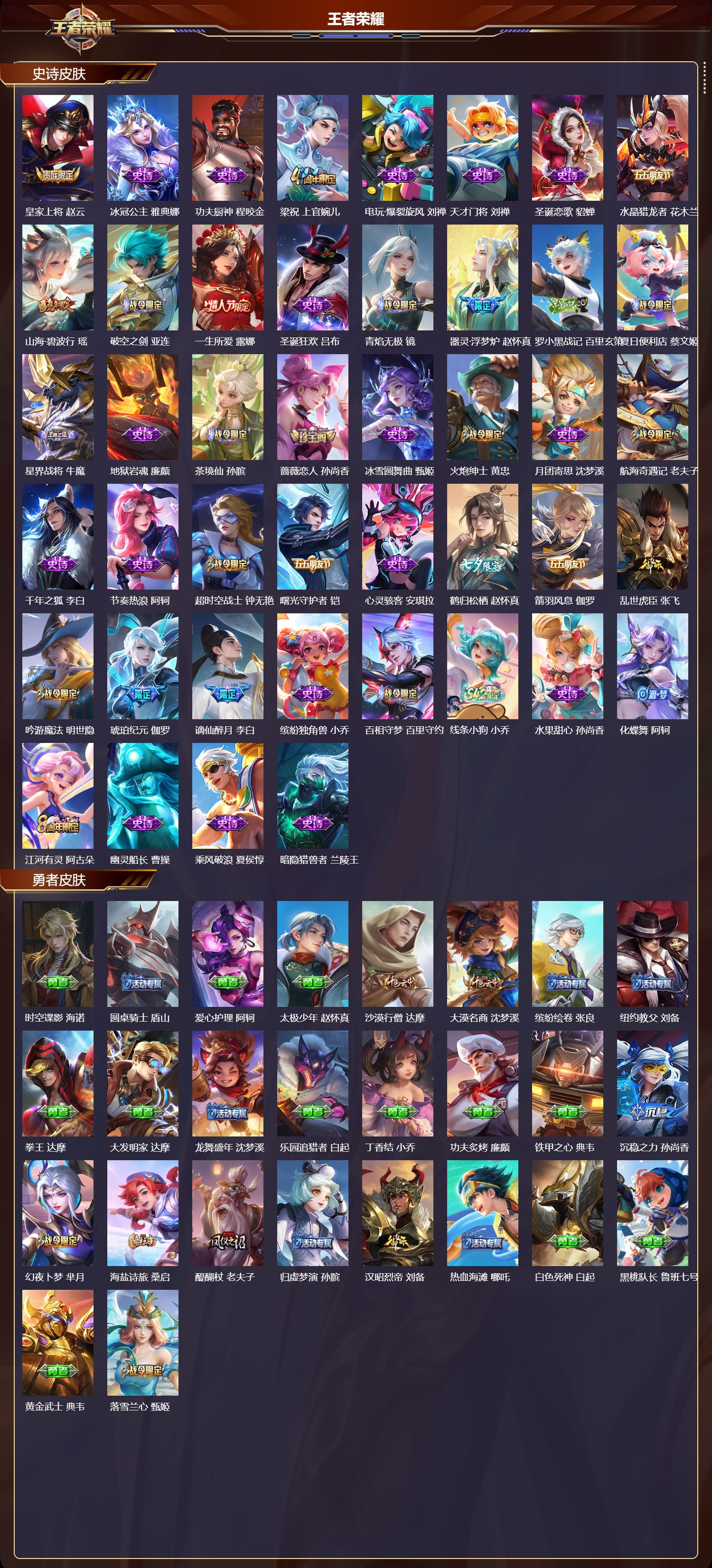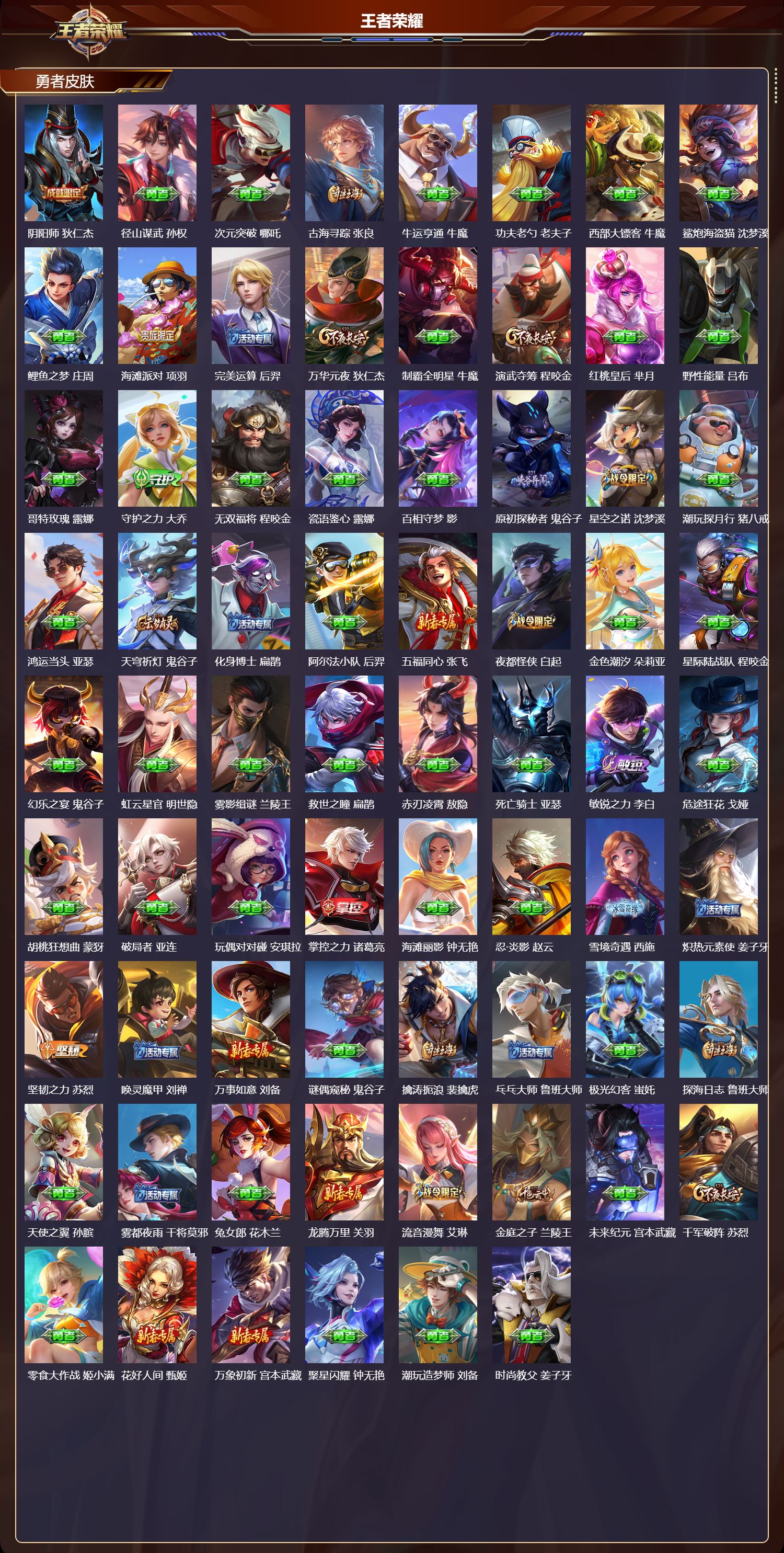 【149,勇者皮肤】时空谍影,海诺,圆桌骑士,盾山,爱心护理,阿轲,太极少年,赵怀真,沙漠行僧,达摩,大漠名商,沈梦溪,缤纷绘卷,张良,纽约教父,刘备,拳王,达摩,大发明家,达摩,龙舞盛年,沈梦溪,乐园追猎者,白起,丁香结,小乔,功夫炙烤,廉颇,铁甲之心,典韦,沉稳之力,孙尚香,幻夜卜梦,芈月,海盐诗旅,桑启,醍醐杖,老夫子,归虚梦演,孙膑,汉昭烈帝,刘备,热血海滩,哪吒,白色死神,白起,黑桃队长,鲁班七号,黄金武士,典韦,落雪兰心,甄姬,阴阳师,狄仁杰,径山谋武,孙权,次元突破,哪吒,古海寻踪,张良,牛运亨通,牛魔,功夫老勺,老夫子,西部大镖客,牛魔,鲨炮海盗猫,沈梦溪,鲤鱼之梦,庄周,海滩派对,项羽,完美运算,后羿,万华元夜,狄仁杰,制霸全明星,牛魔,演武夺筹,程咬金,红桃皇后,芈月,野性能量,吕布,哥特玫瑰,露娜,守护之力,大乔,无双福将,程咬金,瓷语鉴心,露娜,百相守梦,影,原初探秘者,鬼谷子,星空之诺,沈梦溪,潮玩探月行,猪八戒,鸿运当头,亚瑟,天穹祈灯,鬼谷子,化身博士,扁鹊,阿尔法小队,后羿,五福同心,张飞,夜都怪侠,白起,金色潮汐,朵莉亚,星际陆战队,程咬金,幻乐之宴,鬼谷子,虹云星官,明世隐,雾影缉谜,兰陵王,救世之瞳,扁鹊,赤刃凌霄,敖隐,死亡骑士,亚瑟,敏锐之力,李白,危途狂花,戈娅,胡桃狂想曲,蒙犽,破局者,亚连,玩偶对对碰,安琪拉,掌控之力,诸葛亮,海滩丽影,钟无艳,忍·炎影,赵云,雪境奇遇,西施,炽热元素使,姜子牙,坚韧之力,苏烈,唤灵魔甲,刘禅,万事如意,刘备,谜偶窥秘,鬼谷子,擒涛扼浪,裴擒虎,乓乓大师,鲁班大师,极光幻客,蚩奼,探海日志,鲁班大师,天使之翼,孙膑,雾都夜雨,干将莫邪,兔女郎,花木兰,龙腾万里,关羽,流音漫舞,艾琳,金庭之子,兰陵王,未来纪元,宫本武藏,千军破阵,苏烈,零食大作战,姬小满,花好人间,甄姬,万象初新,宫本武藏,聚星闪耀,钟无艳,潮玩造梦师,刘备,时尚教父,姜子牙,春野之旅,钟无艳,秘密基地,刘禅,教廷特使,韩信,街头霸王,韩信,云中旅人,李元芳,妄想特派,李元芳,西部大镖客,孙悟空,紫罗兰之誓,妲己,神迹守卫,墨子,重装意志,盘古,进击墨子号,墨子,蔬乡物语,李元芳,少女阿狸,妲己,灵卜魔法,妲己,蔚蓝守将,蒙恬,春野闲踪,苏烈,契约魔法,米莱狄,布丁狗之约,阿古朵,暖冬·兔眠,嫦娥,命运加冕,露娜,小满鸭,姬小满,幻想奇妙夜,王昭君,灵野札记,张良,驱傩正仪,钟馗,命运角斗场,狂铁,特工战影,狂铁,虚灵犬护,钟馗,漠中幻影,嫦娥,白执事,赵云,华丽摇滚,太乙真人,劲辣红锅,太乙真人,神迹守卫,孙悟空,剑破天穹,刘邦,苍威无极,项羽,铁骨偃魂,典韦,熔金海岸,周瑜,苍林狼骑,苍,天穹之誓,姜子牙,魅影绮裳,影,访茗客,马超,星梦巡礼,姜子牙,破阵·退雄兵,杨戬,谧流熔炉,太乙真人,群星魔术团,程咬金,经纬探寻者,盘古,暗都幽影,大司命,夏日便利店,虞姬,线条小狗,周瑜,百相守梦,老夫子,噬灭天穹,东皇太一,灵卦秘语,少司缘,敬我三分,盘古,玫蓝誓约,戈娅,