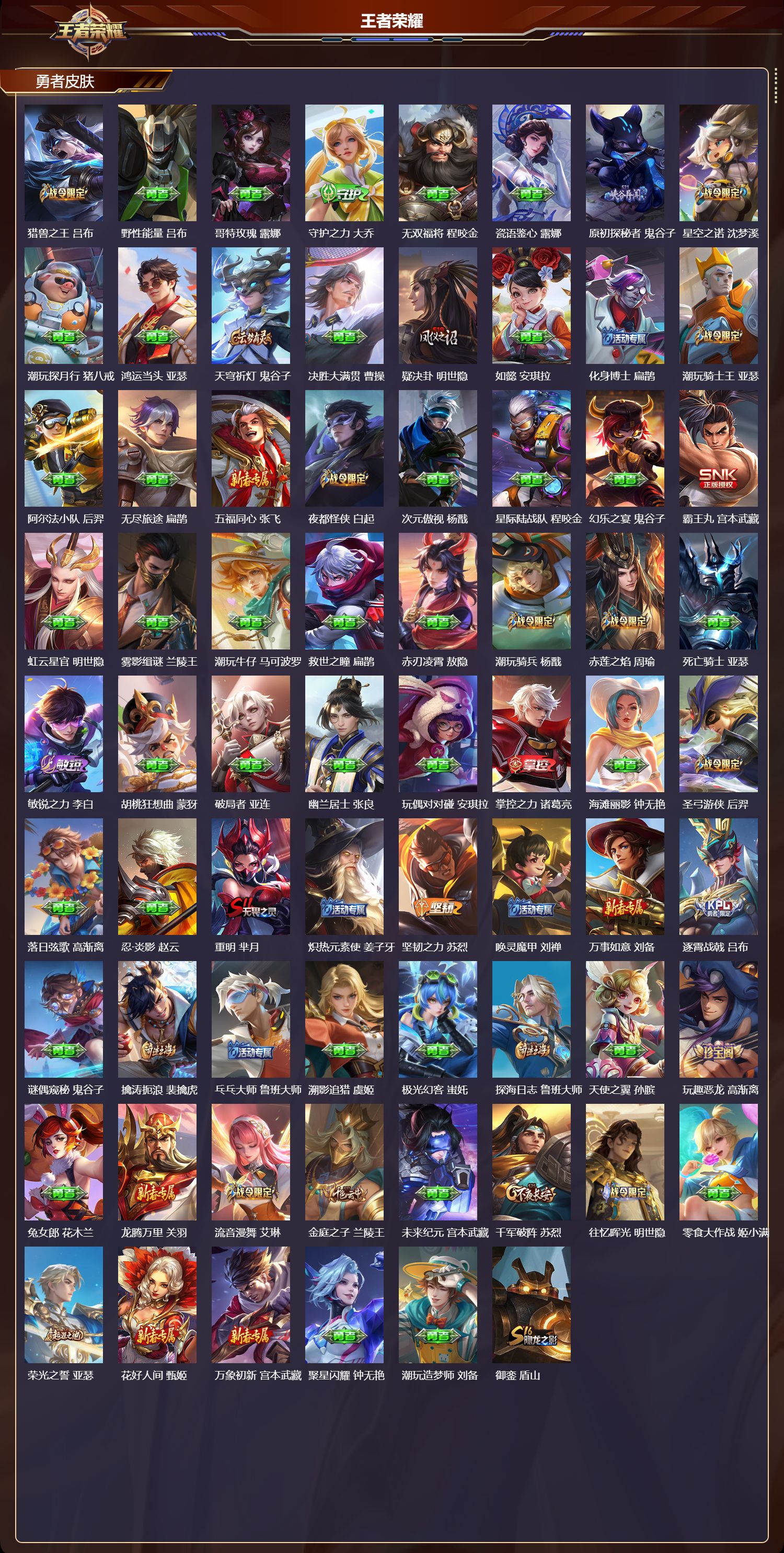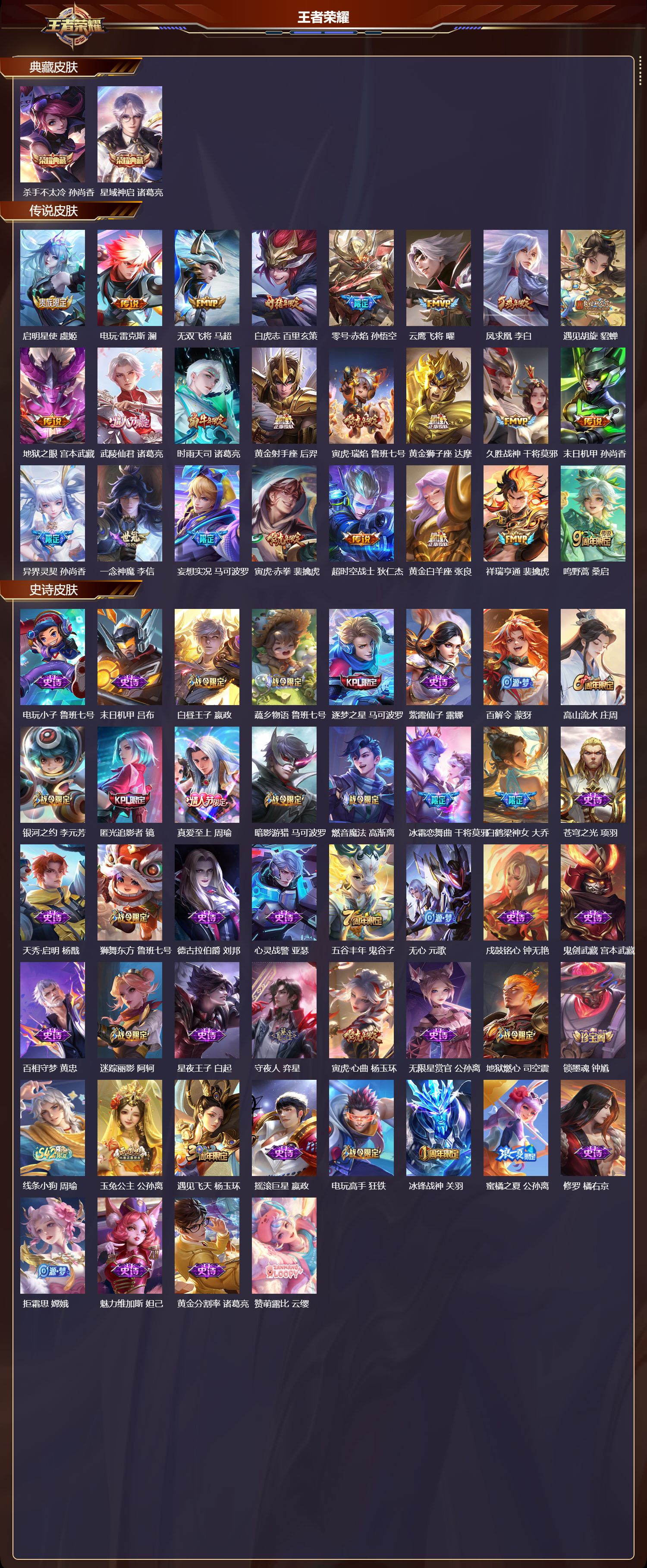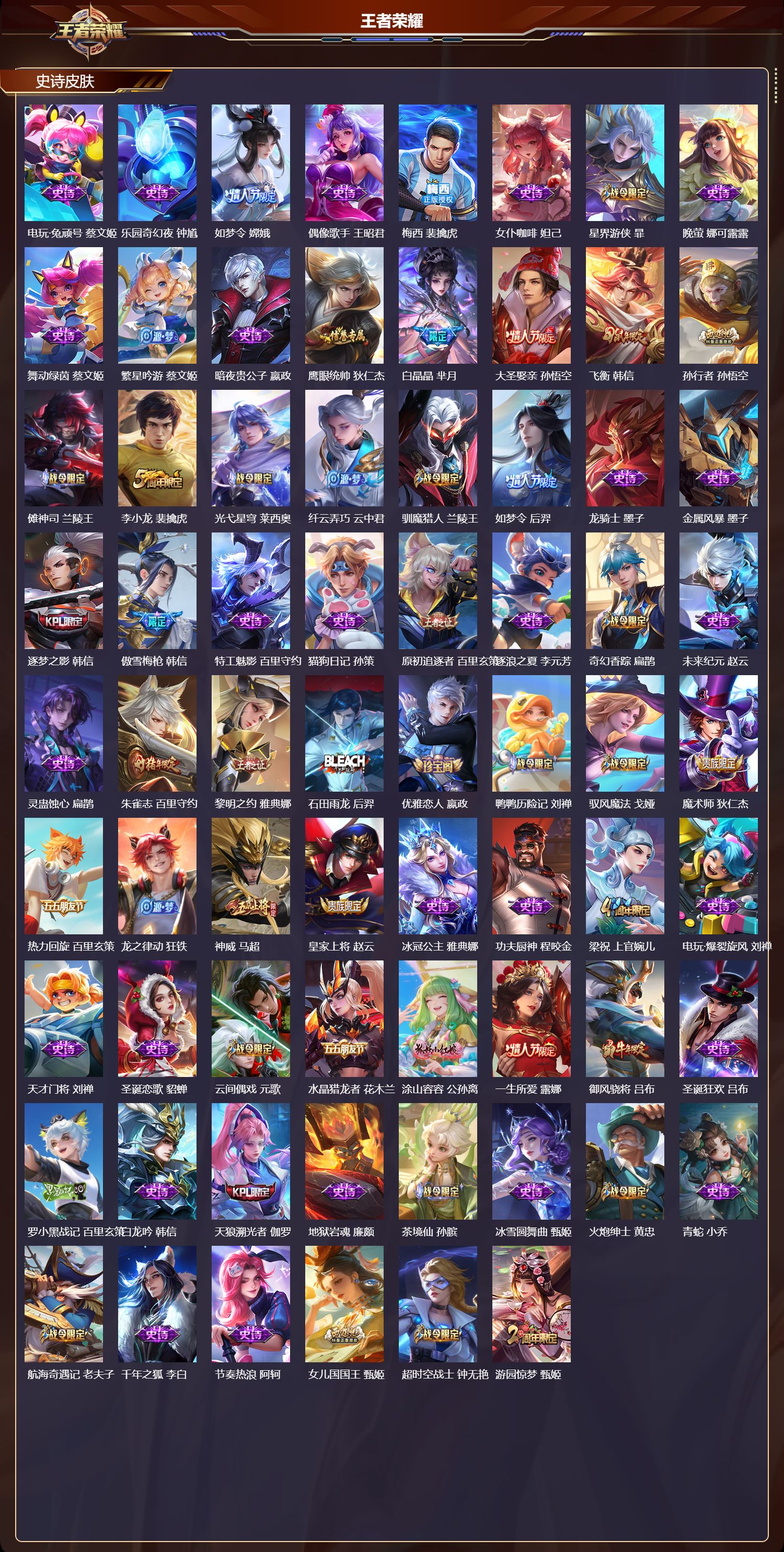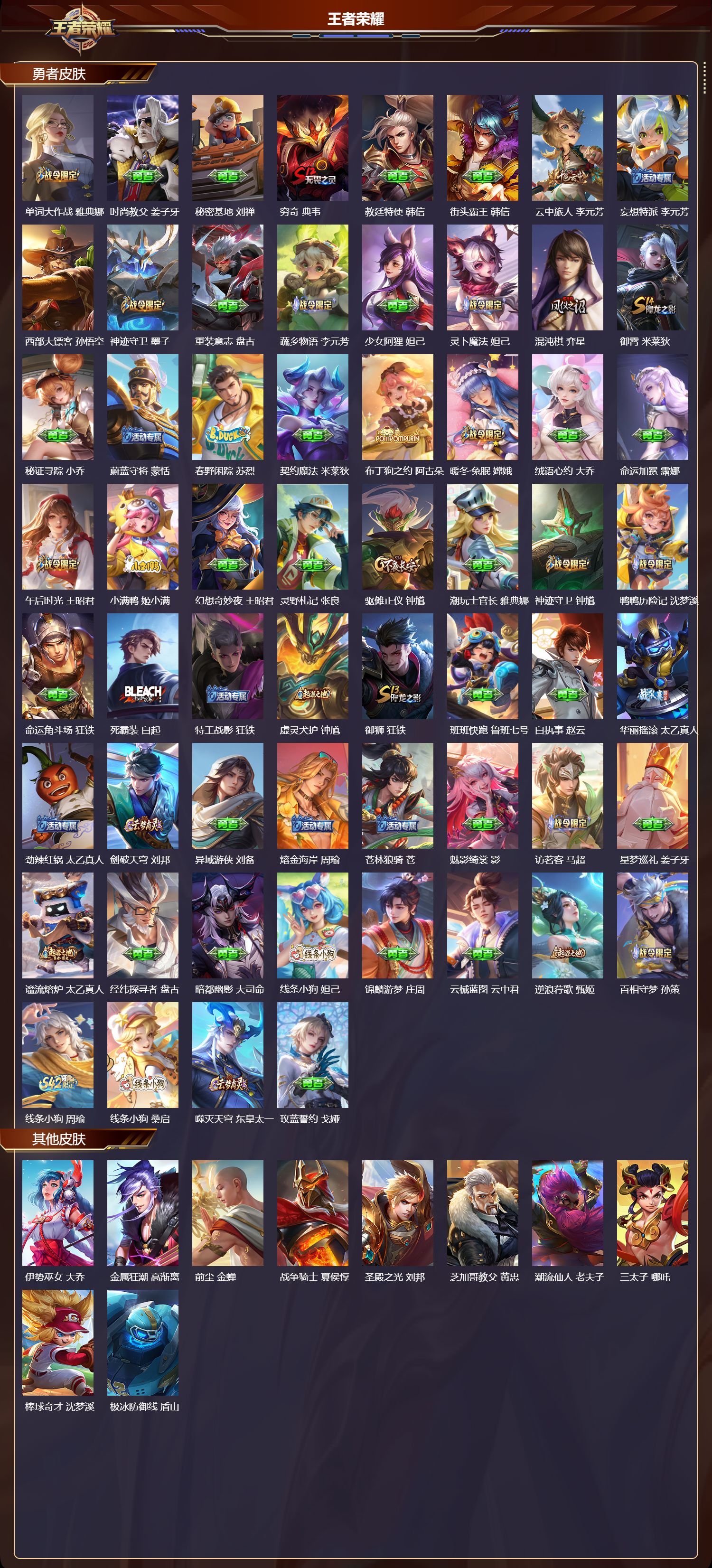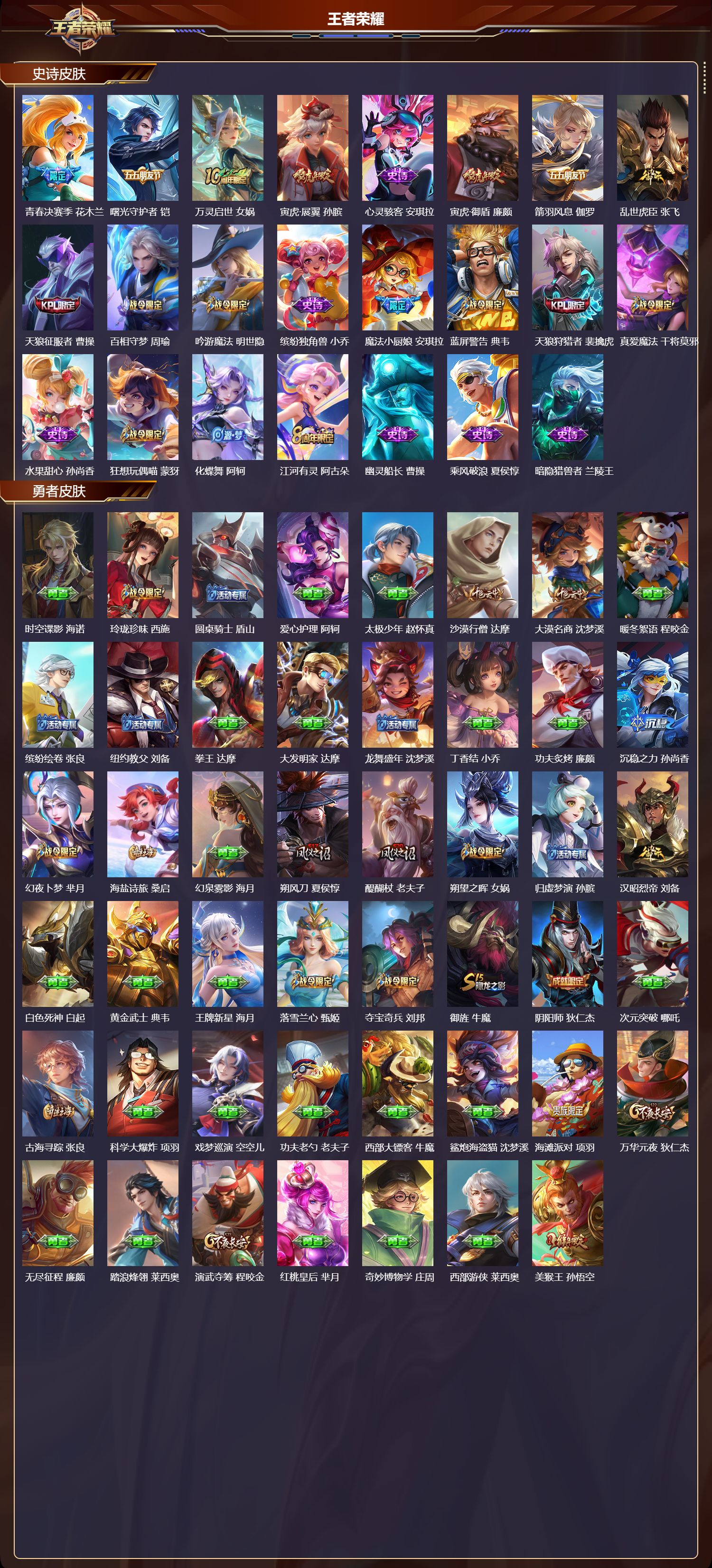 【137,史诗皮肤】电玩小子,鲁班七号,末日机甲,吕布,白昼王子,嬴政,蔬乡物语,鲁班七号,逐梦之星,马可波罗,紫霞仙子,露娜,百解令,蒙犽,高山流水,庄周,银河之约,李元芳,匿光追影者,镜,真爱至上,周瑜,暗影游猎,马可波罗,燃音魔法,高渐离,冰霜恋舞曲,干将莫邪,白鹤梁神女,大乔,苍穹之光,项羽,天秀·启明,杨戬,狮舞东方,鲁班七号,德古拉伯爵,刘邦,心灵战警,亚瑟,五谷丰年,鬼谷子,无心,元歌,戍鼓铭心,钟无艳,鬼剑武藏,宫本武藏,百相守梦,黄忠,迷踪丽影,阿轲,星夜王子,白起,守夜人,弈星,寅虎·心曲,杨玉环,无限星赏官,公孙离,地狱燃心,司空震,锁墨魂,钟馗,线条小狗,周瑜,玉兔公主,公孙离,遇见飞天,杨玉环,摇滚巨星,嬴政,电玩高手,狂铁,冰锋战神,关羽,蜜橘之夏,公孙离,修罗,橘右京,拒霜思,嫦娥,魅力维加斯,妲己,黄金分割率,诸葛亮,赞萌露比,云缨,电玩·兔顽号,蔡文姬,乐园奇幻夜,钟馗,如梦令,嫦娥,偶像歌手,王昭君,梅西,裴擒虎,女仆咖啡,妲己,星界游侠,暃,晚萤,娜可露露,舞动绿茵,蔡文姬,繁星吟游,蔡文姬,暗夜贵公子,嬴政,鹰眼统帅,狄仁杰,白晶晶,芈月,大圣娶亲,孙悟空,飞衡,韩信,孙行者,孙悟空,傩神司,兰陵王,李小龙,裴擒虎,光弋星穹,莱西奥,纤云弄巧,云中君,驯魔猎人,兰陵王,如梦令,后羿,龙骑士,墨子,金属风暴,墨子,逐梦之影,韩信,傲雪梅枪,韩信,特工魅影,百里守约,猫狗日记,孙策,原初追逐者,百里玄策,逐浪之夏,李元芳,奇幻香踪,扁鹊,未来纪元,赵云,灵蛊蚀心,扁鹊,朱雀志,百里守约,黎明之约,雅典娜,石田雨龙,后羿,优雅恋人,嬴政,鸭鸭历险记,刘禅,驭风魔法,戈娅,魔术师,狄仁杰,热力回旋,百里玄策,龙之律动,狂铁,神威,马超,皇家上将,赵云,冰冠公主,雅典娜,功夫厨神,程咬金,梁祝,上官婉儿,电玩·爆裂旋风,刘禅,天才门将,刘禅,圣诞恋歌,貂蝉,云间偶戏,元歌,水晶猎龙者,花木兰,涂山容容,公孙离,一生所爱,露娜,御风骁将,吕布,圣诞狂欢,吕布,罗小黑战记,百里玄策,白龙吟,韩信,天狼溯光者,伽罗,地狱岩魂,廉颇,茶境仙,孙膑,冰雪圆舞曲,甄姬,火炮绅士,黄忠,青蛇,小乔,航海奇遇记,老夫子,千年之狐,李白,节奏热浪,阿轲,女儿国国王,甄姬,超时空战士,钟无艳,游园惊梦,甄姬,青春决赛季,花木兰,曙光守护者,铠,万灵启世,女娲,寅虎·展翼,孙膑,心灵骇客,安琪拉,寅虎·御盾,廉颇,箭羽风息,伽罗,乱世虎臣,张飞,天狼征服者,曹操,百相守梦,周瑜,吟游魔法,明世隐,缤纷独角兽,小乔,魔法小厨娘,安琪拉,蓝屏警告,典韦,天狼狩猎者,裴擒虎,真爱魔法,干将莫邪,水果甜心,孙尚香,狂想玩偶喵,蒙犽,化蝶舞,阿轲,江河有灵,阿古朵,幽灵船长,曹操,乘风破浪,夏侯惇,暗隐猎兽者,兰陵王,