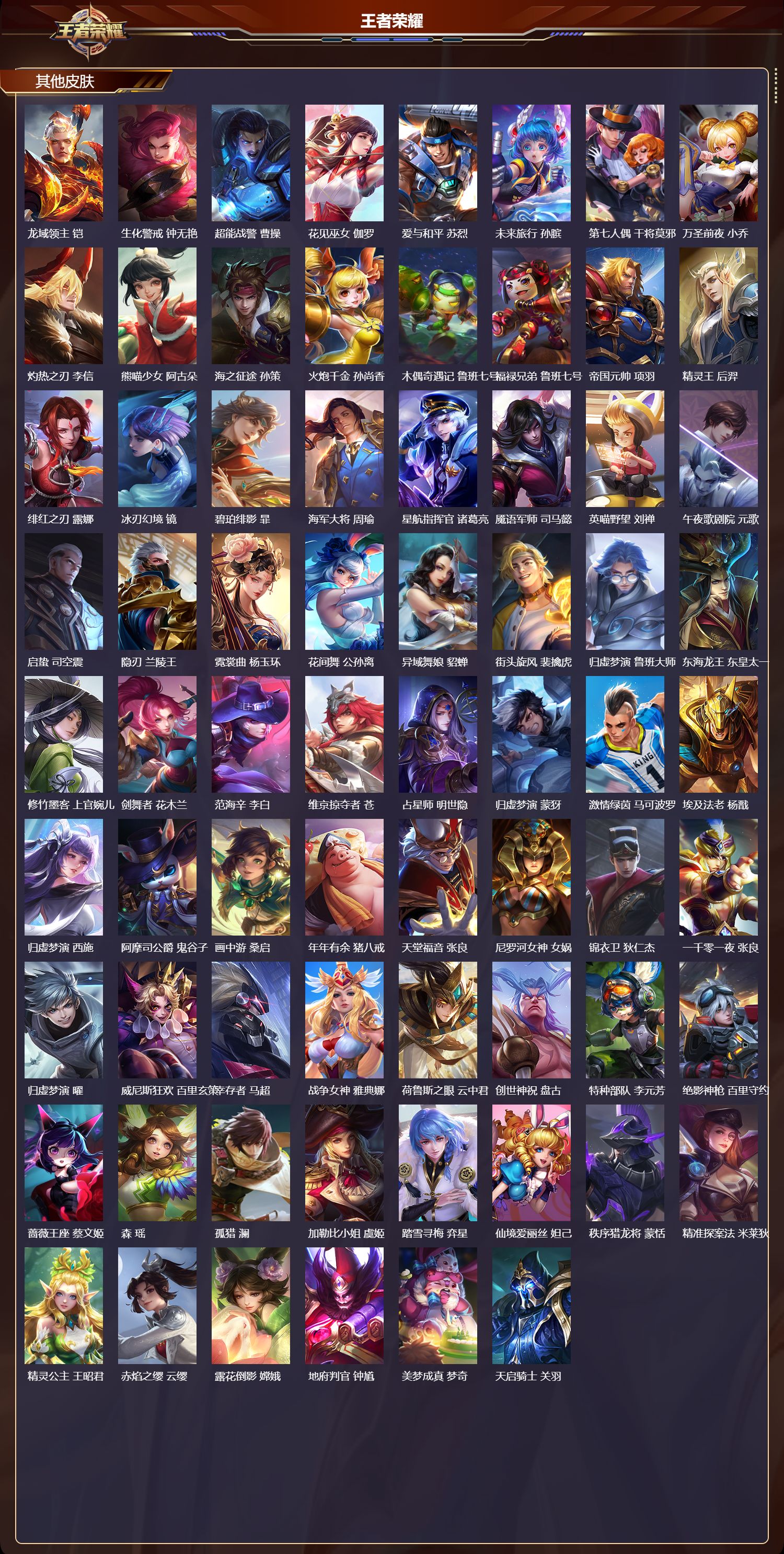 【82,其他皮肤】伊势巫女,大乔,金属狂潮,高渐离,前尘,金蝉,战争骑士,夏侯惇,圣殿之光,刘邦,芝加哥教父,黄忠,潮流仙人,老夫子,三太子,哪吒,棒球奇才,沈梦溪,极冰防御线,盾山,龙域领主,铠,生化警戒,钟无艳,超能战警,曹操,花见巫女,伽罗,爱与和平,苏烈,未来旅行,孙膑,第七人偶,干将莫邪,万圣前夜,小乔,灼热之刃,李信,熊喵少女,阿古朵,海之征途,孙策,火炮千金,孙尚香,木偶奇遇记,鲁班七号,福禄兄弟,鲁班七号,帝国元帅,项羽,精灵王,后羿,绯红之刃,露娜,冰刃幻境,镜,碧珀绯影,暃,海军大将,周瑜,星航指挥官,诸葛亮,魇语军师,司马懿,英喵野望,刘禅,午夜歌剧院,元歌,启蛰,司空震,隐刃,兰陵王,霓裳曲,杨玉环,花间舞,公孙离,异域舞娘,貂蝉,街头旋风,裴擒虎,归虚梦演,鲁班大师,东海龙王,东皇太一,修竹墨客,上官婉儿,剑舞者,花木兰,范海辛,李白,维京掠夺者,苍,占星师,明世隐,归虚梦演,蒙犽,激情绿茵,马可波罗,埃及法老,杨戬,归虚梦演,西施,阿摩司公爵,鬼谷子,画中游,桑启,年年有余,猪八戒,天堂福音,张良,尼罗河女神,女娲,锦衣卫,狄仁杰,一千零一夜,张良,归虚梦演,曜,威尼斯狂欢,百里玄策,幸存者,马超,战争女神,雅典娜,荷鲁斯之眼,云中君,创世神祝,盘古,特种部队,李元芳,绝影神枪,百里守约,蔷薇王座,蔡文姬,森,瑶,孤猎,澜,加勒比小姐,虞姬,踏雪寻梅,弈星,仙境爱丽丝,妲己,秩序猎龙将,蒙恬,精准探案法,米莱狄,精灵公主,王昭君,赤焰之缨,云缨,露花倒影,嫦娥,地府判官,钟馗,美梦成真,梦奇,天启骑士,关羽,圆桌骑士,太乙真人,西部大镖客,孙悟空,