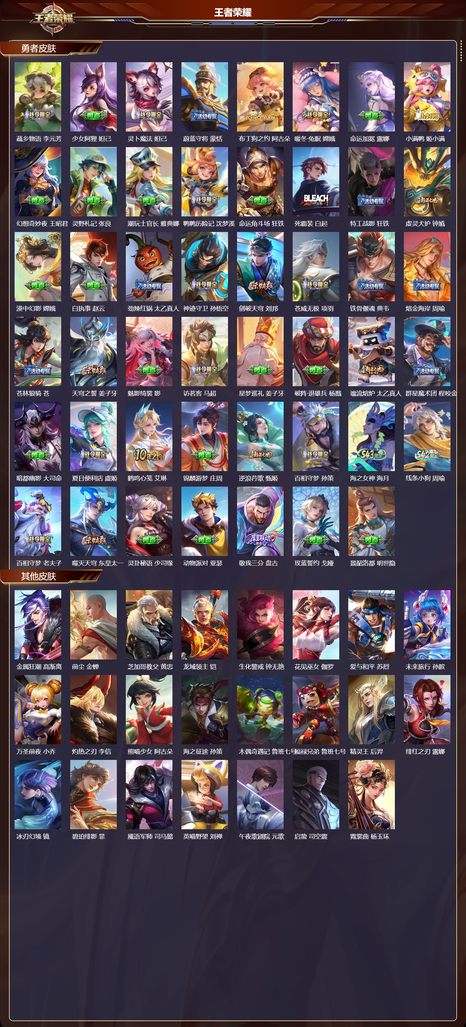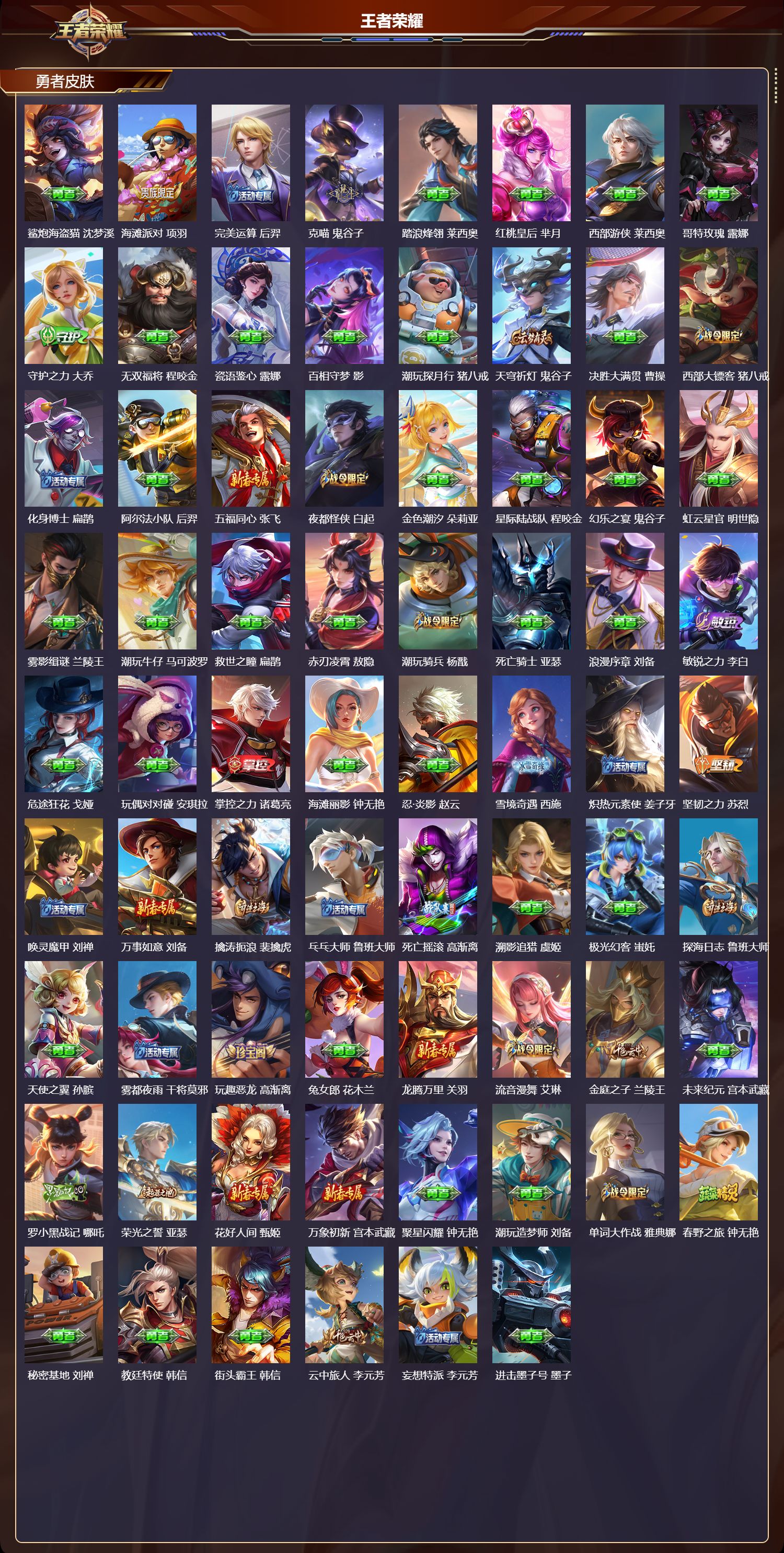 【143,勇者皮肤】时空谍影,海诺,玲珑珍味,西施,圆桌骑士,盾山,沙漠行僧,达摩,大漠名商,沈梦溪,缤纷绘卷,张良,纽约教父,刘备,拳王,达摩,龙舞盛年,沈梦溪,乐园追猎者,白起,功夫炙烤,廉颇,海盐诗旅,桑启,幻泉雾影,海月,汉昭烈帝,刘备,热血海滩,哪吒,白色死神,白起,黄金武士,典韦,王牌新星,海月,落雪兰心,甄姬,阴阳师,狄仁杰,径山谋武,孙权,次元突破,哪吒,古海寻踪,张良,戏梦巡演,空空儿,功夫老勺,老夫子,西部大镖客,牛魔,鲨炮海盗猫,沈梦溪,海滩派对,项羽,完美运算,后羿,克喵,鬼谷子,踏浪烽翎,莱西奥,红桃皇后,芈月,西部游侠,莱西奥,哥特玫瑰,露娜,守护之力,大乔,无双福将,程咬金,瓷语鉴心,露娜,百相守梦,影,潮玩探月行,猪八戒,天穹祈灯,鬼谷子,决胜大满贯,曹操,西部大镖客,猪八戒,化身博士,扁鹊,阿尔法小队,后羿,五福同心,张飞,夜都怪侠,白起,金色潮汐,朵莉亚,星际陆战队,程咬金,幻乐之宴,鬼谷子,虹云星官,明世隐,雾影缉谜,兰陵王,潮玩牛仔,马可波罗,救世之瞳,扁鹊,赤刃凌霄,敖隐,潮玩骑兵,杨戬,死亡骑士,亚瑟,浪漫序章,刘备,敏锐之力,李白,危途狂花,戈娅,玩偶对对碰,安琪拉,掌控之力,诸葛亮,海滩丽影,钟无艳,忍·炎影,赵云,雪境奇遇,西施,炽热元素使,姜子牙,坚韧之力,苏烈,唤灵魔甲,刘禅,万事如意,刘备,擒涛扼浪,裴擒虎,乓乓大师,鲁班大师,死亡摇滚,高渐离,溯影追猎,虞姬,极光幻客,蚩奼,探海日志,鲁班大师,天使之翼,孙膑,雾都夜雨,干将莫邪,玩趣恶龙,高渐离,兔女郎,花木兰,龙腾万里,关羽,流音漫舞,艾琳,金庭之子,兰陵王,未来纪元,宫本武藏,罗小黑战记,哪吒,荣光之誓,亚瑟,花好人间,甄姬,万象初新,宫本武藏,聚星闪耀,钟无艳,潮玩造梦师,刘备,单词大作战,雅典娜,春野之旅,钟无艳,秘密基地,刘禅,教廷特使,韩信,街头霸王,韩信,云中旅人,李元芳,妄想特派,李元芳,进击墨子号,墨子,蔬乡物语,李元芳,少女阿狸,妲己,灵卜魔法,妲己,蔚蓝守将,蒙恬,布丁狗之约,阿古朵,暖冬·兔眠,嫦娥,命运加冕,露娜,小满鸭,姬小满,幻想奇妙夜,王昭君,灵野札记,张良,潮玩士官长,雅典娜,鸭鸭历险记,沈梦溪,命运角斗场,狂铁,死霸装,白起,特工战影,狂铁,虚灵犬护,钟馗,漠中幻影,嫦娥,白执事,赵云,劲辣红锅,太乙真人,神迹守卫,孙悟空,剑破天穹,刘邦,苍威无极,项羽,铁骨偃魂,典韦,熔金海岸,周瑜,苍林狼骑,苍,天穹之誓,姜子牙,魅影绮裳,影,访茗客,马超,星梦巡礼,姜子牙,破阵·退雄兵,杨戬,谧流熔炉,太乙真人,群星魔术团,程咬金,暗都幽影,大司命,夏日便利店,虞姬,鹤鸣心笺,艾琳,锦麟游梦,庄周,逆浪荇歌,甄姬,百相守梦,孙策,海之女神,海月,线条小狗,周瑜,百相守梦,老夫子,噬灭天穹,东皇太一,灵卦秘语,少司缘,动物派对,亚瑟,敬我三分,盘古,玫蓝誓约,戈娅,景韶洛都,明世隐,