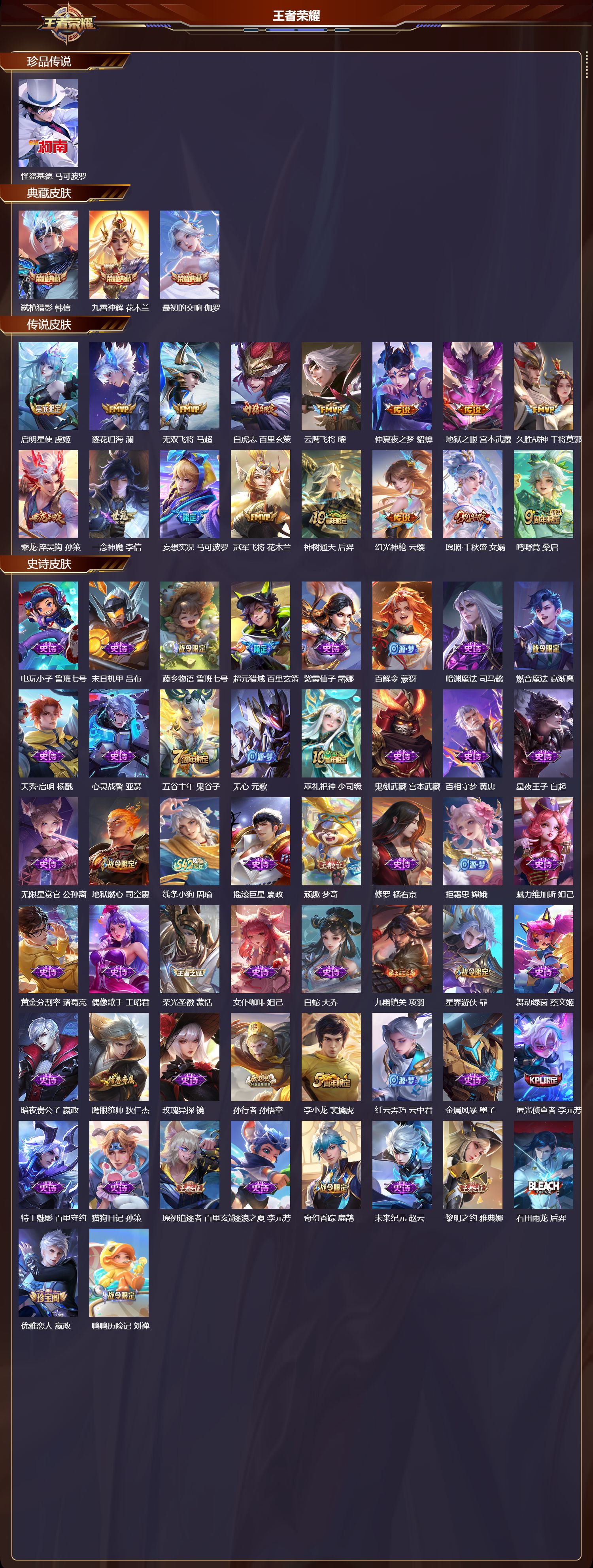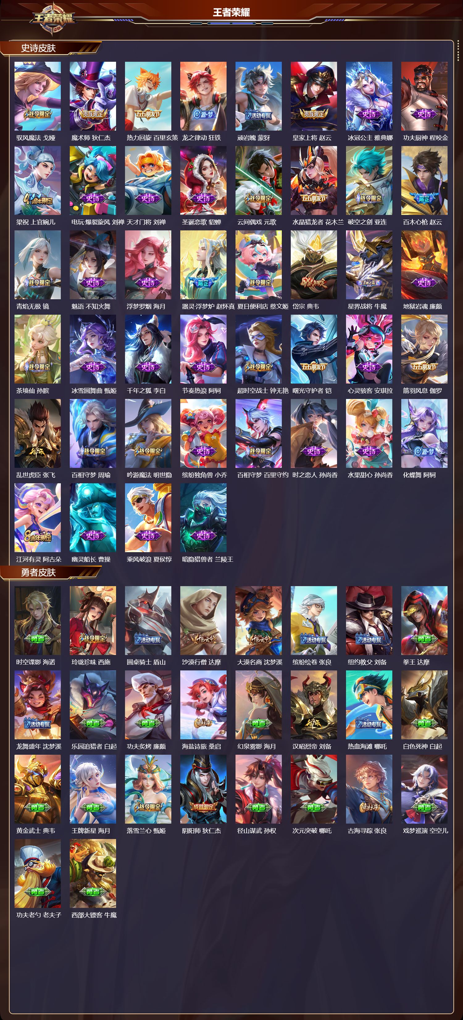 【94,史诗皮肤】电玩小子,鲁班七号,末日机甲,吕布,蔬乡物语,鲁班七号,超元猎域,百里玄策,紫霞仙子,露娜,百解令,蒙犽,暗渊魔法,司马懿,燃音魔法,高渐离,天秀·启明,杨戬,心灵战警,亚瑟,五谷丰年,鬼谷子,无心,元歌,巫礼祀神,少司缘,鬼剑武藏,宫本武藏,百相守梦,黄忠,星夜王子,白起,无限星赏官,公孙离,地狱燃心,司空震,线条小狗,周瑜,摇滚巨星,嬴政,顽趣,梦奇,修罗,橘右京,拒霜思,嫦娥,魅力维加斯,妲己,黄金分割率,诸葛亮,偶像歌手,王昭君,荣光圣徽,蒙恬,女仆咖啡,妲己,白蛇,大乔,九幽镇关,项羽,星界游侠,暃,舞动绿茵,蔡文姬,暗夜贵公子,嬴政,鹰眼统帅,狄仁杰,玫瑰异探,镜,孙行者,孙悟空,李小龙,裴擒虎,纤云弄巧,云中君,金属风暴,墨子,匿光侦查者,李元芳,特工魅影,百里守约,猫狗日记,孙策,原初追逐者,百里玄策,逐浪之夏,李元芳,奇幻香踪,扁鹊,未来纪元,赵云,黎明之约,雅典娜,石田雨龙,后羿,优雅恋人,嬴政,鸭鸭历险记,刘禅,驭风魔法,戈娅,魔术师,狄仁杰,热力回旋,百里玄策,龙之律动,狂铁,顽岩魄,蒙犽,皇家上将,赵云,冰冠公主,雅典娜,功夫厨神,程咬金,梁祝,上官婉儿,电玩·爆裂旋风,刘禅,天才门将,刘禅,圣诞恋歌,貂蝉,云间偶戏,元歌,水晶猎龙者,花木兰,破空之剑,亚连,百木心枪,赵云,青焰无极,镜,魅语,不知火舞,浮梦罗烟,海月,器灵·浮梦炉,赵怀真,夏日便利店,蔡文姬,岱宗,典韦,星界战将,牛魔,地狱岩魂,廉颇,茶境仙,孙膑,冰雪圆舞曲,甄姬,千年之狐,李白,节奏热浪,阿轲,超时空战士,钟无艳,曙光守护者,铠,心灵骇客,安琪拉,箭羽风息,伽罗,乱世虎臣,张飞,百相守梦,周瑜,吟游魔法,明世隐,缤纷独角兽,小乔,百相守梦,百里守约,时之恋人,孙尚香,水果甜心,孙尚香,化蝶舞,阿轲,江河有灵,阿古朵,幽灵船长,曹操,乘风破浪,夏侯惇,暗隐猎兽者,兰陵王,