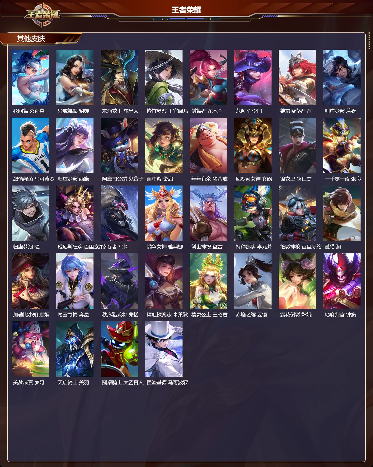 【59,其他皮肤】金属狂潮,高渐离,前尘,金蝉,芝加哥教父,黄忠,龙域领主,铠,生化警戒,钟无艳,花见巫女,伽罗,爱与和平,苏烈,未来旅行,孙膑,万圣前夜,小乔,灼热之刃,李信,熊喵少女,阿古朵,海之征途,孙策,木偶奇遇记,鲁班七号,福禄兄弟,鲁班七号,精灵王,后羿,绯红之刃,露娜,冰刃幻境,镜,碧珀绯影,暃,魇语军师,司马懿,英喵野望,刘禅,午夜歌剧院,元歌,启蛰,司空震,霓裳曲,杨玉环,花间舞,公孙离,异域舞娘,貂蝉,东海龙王,东皇太一,修竹墨客,上官婉儿,剑舞者,花木兰,范海辛,李白,维京掠夺者,苍,归虚梦演,蒙犽,激情绿茵,马可波罗,归虚梦演,西施,阿摩司公爵,鬼谷子,画中游,桑启,年年有余,猪八戒,尼罗河女神,女娲,锦衣卫,狄仁杰,一千零一夜,张良,归虚梦演,曜,威尼斯狂欢,百里玄策,幸存者,马超,战争女神,雅典娜,创世神祝,盘古,特种部队,李元芳,绝影神枪,百里守约,孤猎,澜,加勒比小姐,虞姬,踏雪寻梅,弈星,秩序猎龙将,蒙恬,精准探案法,米莱狄,精灵公主,王昭君,赤焰之缨,云缨,露花倒影,嫦娥,地府判官,钟馗,美梦成真,梦奇,天启骑士,关羽,圆桌骑士,太乙真人,怪盗基德,马可波罗,