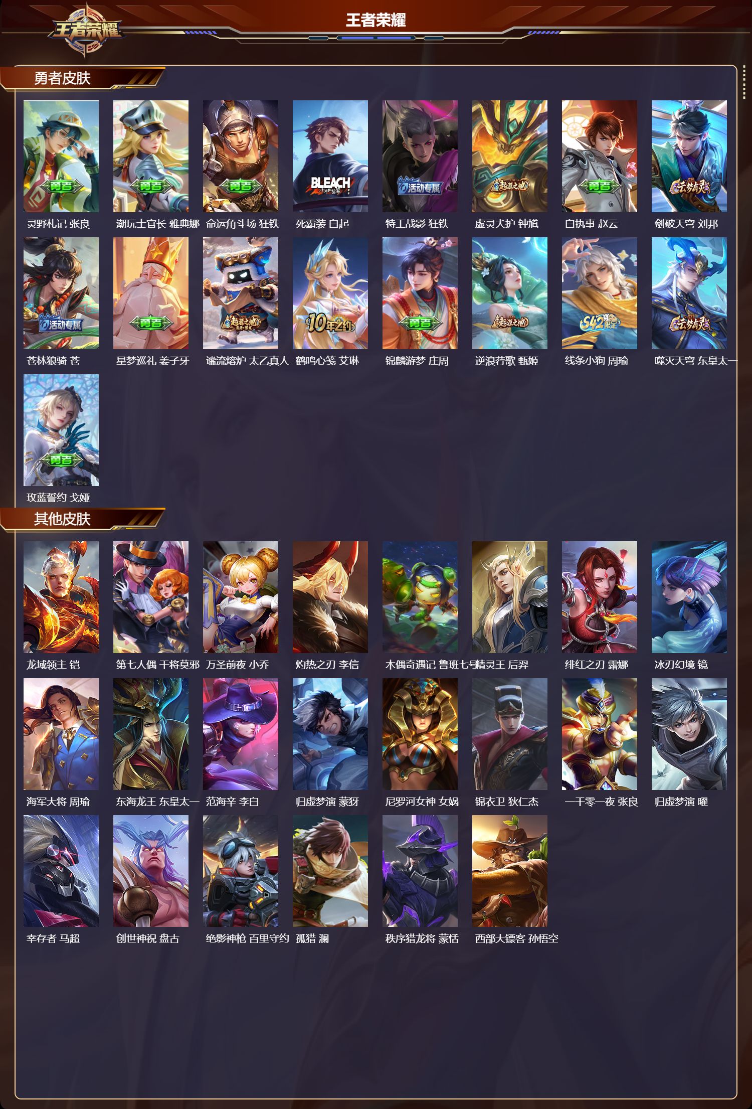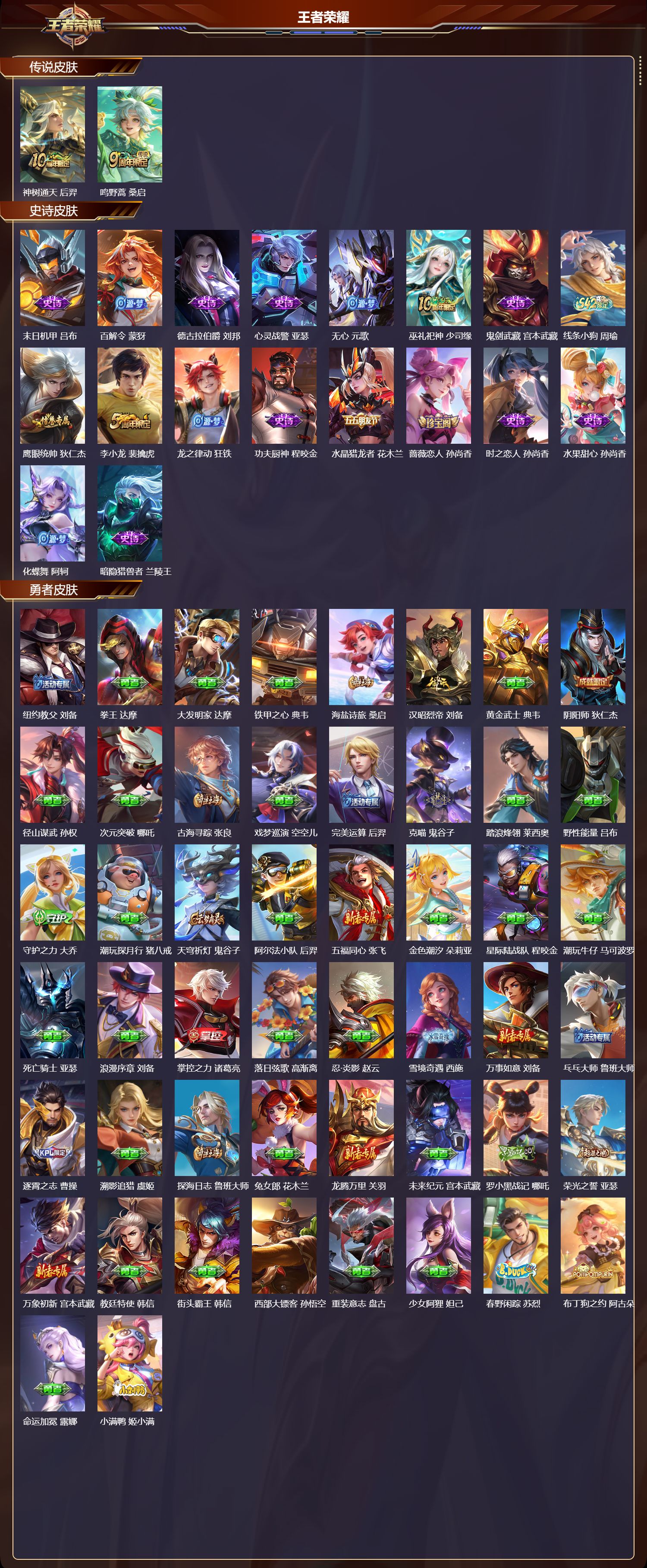 【67,勇者皮肤】,纽约教父,刘备,拳王,达摩,大发明家,达摩,铁甲之心,典韦,海盐诗旅,桑启,汉昭烈帝,刘备,黄金武士,典韦,阴阳师,狄仁杰,径山谋武,孙权,次元突破,哪吒,古海寻踪,张良,戏梦巡演,空空儿,完美运算,后羿,克喵,鬼谷子,踏浪烽翎,莱西奥,野性能量,吕布,守护之力,大乔,潮玩探月行,猪八戒,天穹祈灯,鬼谷子,阿尔法小队,后羿,五福同心,张飞,金色潮汐,朵莉亚,星际陆战队,程咬金,潮玩牛仔,马可波罗,死亡骑士,亚瑟,浪漫序章,刘备,掌控之力,诸葛亮,落日弦歌,高渐离,忍·炎影,赵云,雪境奇遇,西施,万事如意,刘备,乓乓大师,鲁班大师,逐霄之志,曹操,溯影追猎,虞姬,探海日志,鲁班大师,兔女郎,花木兰,龙腾万里,关羽,未来纪元,宫本武藏,罗小黑战记,哪吒,荣光之誓,亚瑟,万象初新,宫本武藏,教廷特使,韩信,街头霸王,韩信,西部大镖客,孙悟空,重装意志,盘古,少女阿狸,妲己,春野闲踪,苏烈,布丁狗之约,阿古朵,命运加冕,露娜,小满鸭,姬小满,灵野札记,张良,潮玩士官长,雅典娜,命运角斗场,狂铁,死霸装,白起,特工战影,狂铁,虚灵犬护,钟馗,白执事,赵云,剑破天穹,刘邦,苍林狼骑,苍,星梦巡礼,姜子牙,谧流熔炉,太乙真人,鹤鸣心笺,艾琳,锦麟游梦,庄周,逆浪荇歌,甄姬,线条小狗,周瑜,噬灭天穹,东皇太一,玫蓝誓约,戈娅,