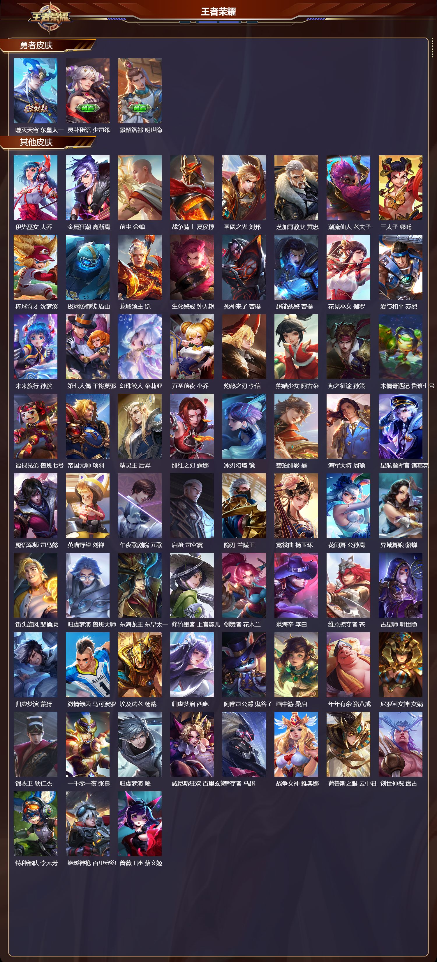 【81,其他皮肤】伊势巫女,大乔,金属狂潮,高渐离,前尘,金蝉,战争骑士,夏侯惇,圣殿之光,刘邦,芝加哥教父,黄忠,潮流仙人,老夫子,三太子,哪吒,棒球奇才,沈梦溪,极冰防御线,盾山,龙域领主,铠,生化警戒,钟无艳,死神来了,曹操,超能战警,曹操,花见巫女,伽罗,爱与和平,苏烈,未来旅行,孙膑,第七人偶,干将莫邪,幻珠鲛人,朵莉亚,万圣前夜,小乔,灼热之刃,李信,熊喵少女,阿古朵,海之征途,孙策,木偶奇遇记,鲁班七号,福禄兄弟,鲁班七号,帝国元帅,项羽,精灵王,后羿,绯红之刃,露娜,冰刃幻境,镜,碧珀绯影,暃,海军大将,周瑜,星航指挥官,诸葛亮,魇语军师,司马懿,英喵野望,刘禅,午夜歌剧院,元歌,启蛰,司空震,隐刃,兰陵王,霓裳曲,杨玉环,花间舞,公孙离,异域舞娘,貂蝉,街头旋风,裴擒虎,归虚梦演,鲁班大师,东海龙王,东皇太一,修竹墨客,上官婉儿,剑舞者,花木兰,范海辛,李白,维京掠夺者,苍,占星师,明世隐,归虚梦演,蒙犽,激情绿茵,马可波罗,埃及法老,杨戬,归虚梦演,西施,阿摩司公爵,鬼谷子,画中游,桑启,年年有余,猪八戒,尼罗河女神,女娲,锦衣卫,狄仁杰,一千零一夜,张良,归虚梦演,曜,威尼斯狂欢,百里玄策,幸存者,马超,战争女神,雅典娜,荷鲁斯之眼,云中君,创世神祝,盘古,特种部队,李元芳,绝影神枪,百里守约,蔷薇王座,蔡文姬,森,瑶,孤猎,澜,加勒比小姐,虞姬,踏雪寻梅,弈星,秩序猎龙将,蒙恬,精准探案法,米莱狄,精灵公主,王昭君,赤焰之缨,云缨,露花倒影,嫦娥,地府判官,钟馗,美梦成真,梦奇,天启骑士,关羽,圆桌骑士,太乙真人,西部大镖客,孙悟空,