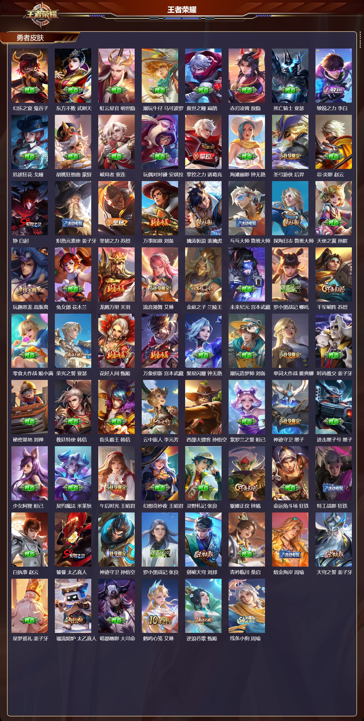 【124,勇者皮肤】时空谍影,海诺,玲珑珍味,西施,圆桌骑士,盾山,爱心护理,阿轲,星际陆战队,达摩,沙漠行僧,达摩,大漠名商,沈梦溪,纽约教父,刘备,拳王,达摩,大发明家,达摩,丁香结,小乔,功夫炙烤,廉颇,铁甲之心,典韦,沉稳之力,孙尚香,幻夜卜梦,芈月,海盐诗旅,桑启,幻泉雾影,海月,醍醐杖,老夫子,朔望之晖,女娲,归虚梦演,孙膑,汉昭烈帝,刘备,白色死神,白起,黄金武士,典韦,王牌新星,海月,阴阳师,狄仁杰,径山谋武,孙权,次元突破,哪吒,古海寻踪,张良,功夫老勺,老夫子,西部大镖客,牛魔,鲨炮海盗猫,沈梦溪,虎啸剑宗,刘邦,海滩派对,项羽,克喵,鬼谷子,制霸全明星,牛魔,踏浪烽翎,莱西奥,演武夺筹,程咬金,红桃皇后,芈月,野性能量,吕布,哥特玫瑰,露娜,守护之力,大乔,无双福将,程咬金,百相守梦,影,原初探秘者,鬼谷子,潮玩探月行,猪八戒,天穹祈灯,鬼谷子,化身博士,扁鹊,阿尔法小队,后羿,五福同心,张飞,夜都怪侠,白起,星际陆战队,程咬金,幻乐之宴,鬼谷子,东方不败,武则天,虹云星官,明世隐,潮玩牛仔,马可波罗,救世之瞳,扁鹊,赤刃凌霄,敖隐,死亡骑士,亚瑟,敏锐之力,李白,危途狂花,戈娅,胡桃狂想曲,蒙犽,破局者,亚连,玩偶对对碰,安琪拉,掌控之力,诸葛亮,海滩丽影,钟无艳,圣弓游侠,后羿,忍·炎影,赵云,狰,白起,炽热元素使,姜子牙,坚韧之力,苏烈,万事如意,刘备,擒涛扼浪,裴擒虎,乓乓大师,鲁班大师,探海日志,鲁班大师,天使之翼,孙膑,玩趣恶龙,高渐离,兔女郎,花木兰,龙腾万里,关羽,流音漫舞,艾琳,金庭之子,兰陵王,未来纪元,宫本武藏,罗小黑战记,哪吒,千军破阵,苏烈,零食大作战,姬小满,荣光之誓,亚瑟,花好人间,甄姬,万象初新,宫本武藏,聚星闪耀,钟无艳,潮玩造梦师,刘备,单词大作战,雅典娜,时尚教父,姜子牙,秘密基地,刘禅,教廷特使,韩信,街头霸王,韩信,云中旅人,李元芳,西部大镖客,孙悟空,紫罗兰之誓,妲己,神迹守卫,墨子,进击墨子号,墨子,少女阿狸,妲己,契约魔法,米莱狄,午后时光,王昭君,幻想奇妙夜,王昭君,灵野札记,张良,驱傩正仪,钟馗,命运角斗场,狂铁,特工战影,狂铁,白执事,赵云,饕餮,太乙真人,神迹守卫,孙悟空,罗小黑战记,张良,剑破天穹,刘邦,青衿临川,桑启,熔金海岸,周瑜,天穹之誓,姜子牙,星梦巡礼,姜子牙,谧流熔炉,太乙真人,暗都幽影,大司命,鹤鸣心笺,艾琳,逆浪荇歌,甄姬,线条小狗,周瑜,噬灭天穹,东皇太一,灵卦秘语,少司缘,景韶洛都,明世隐,