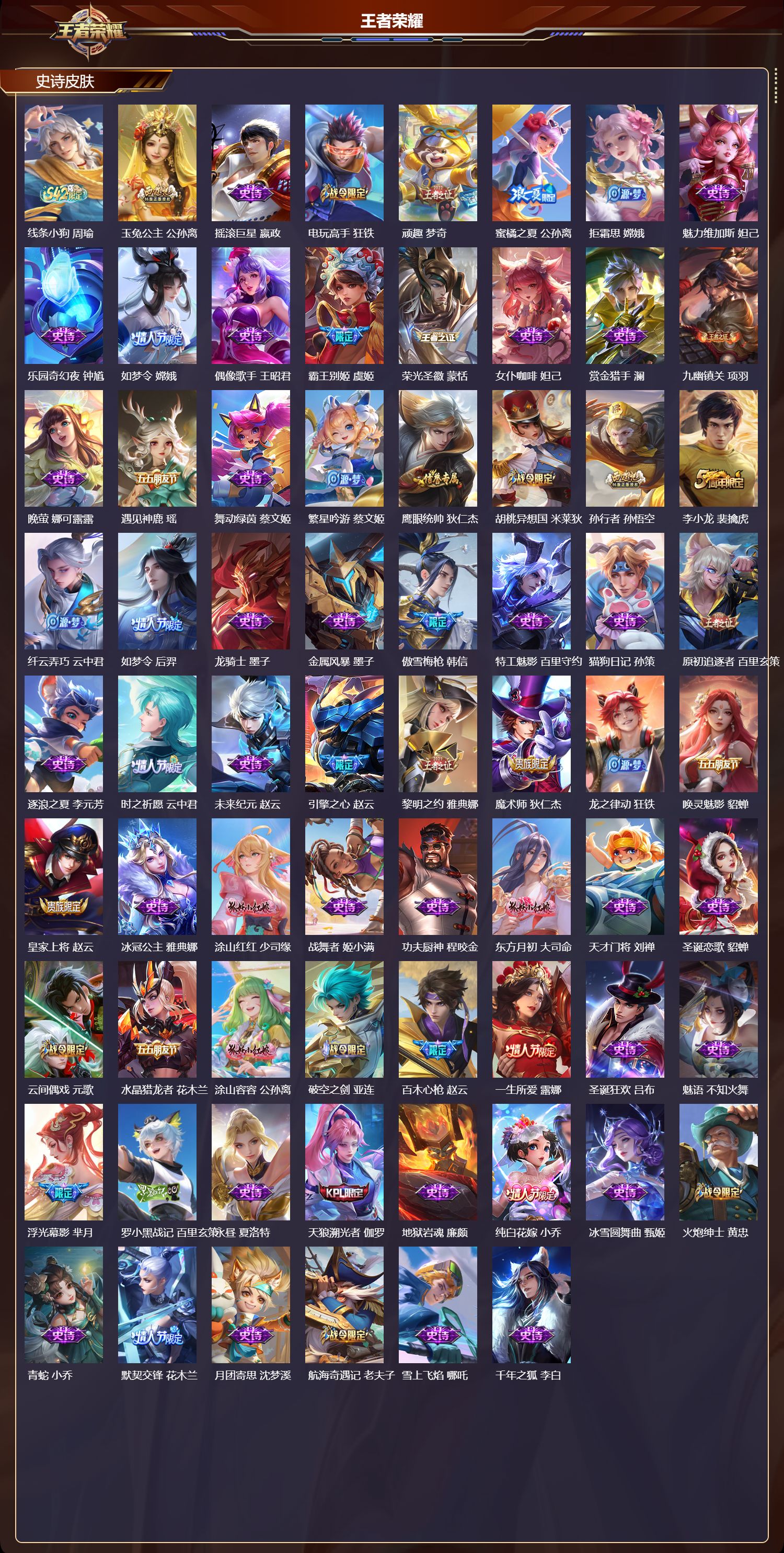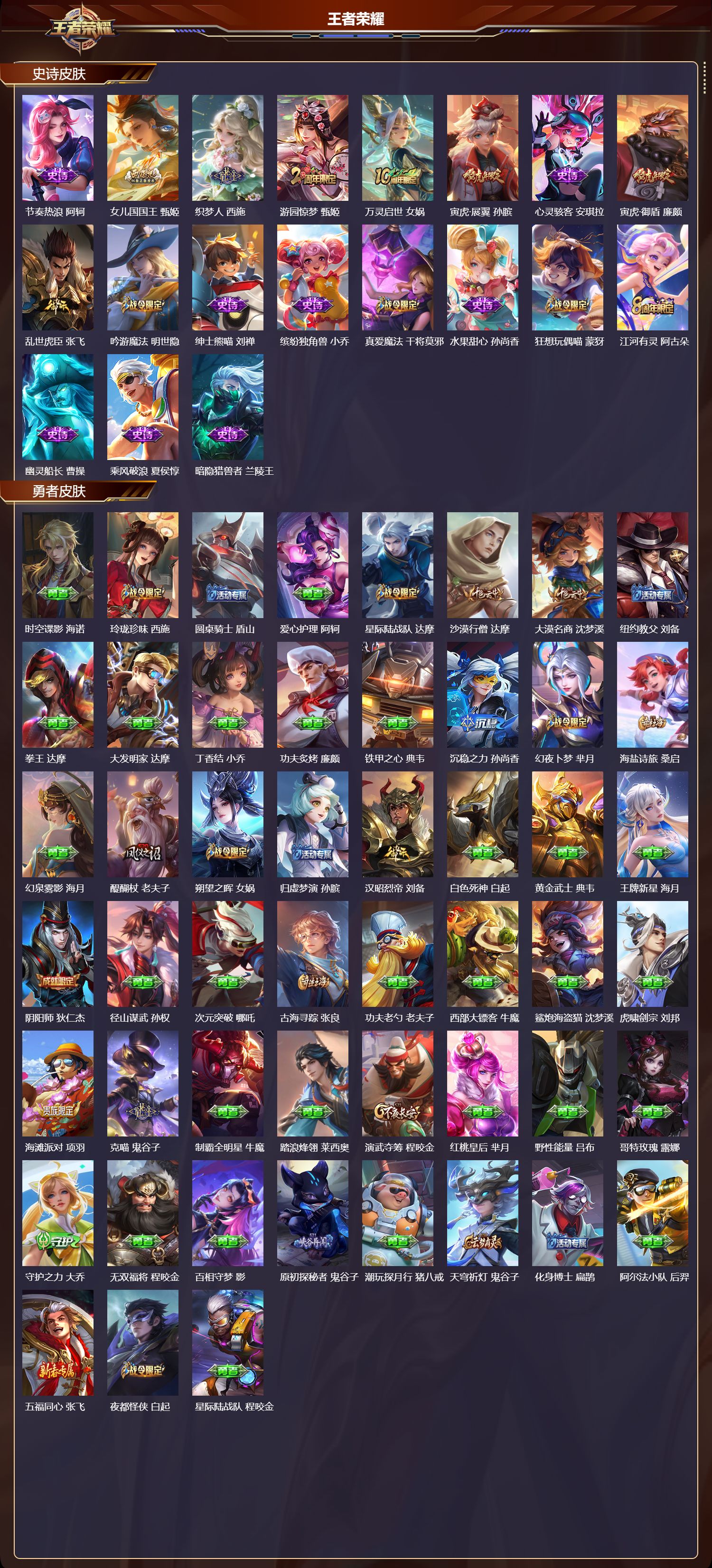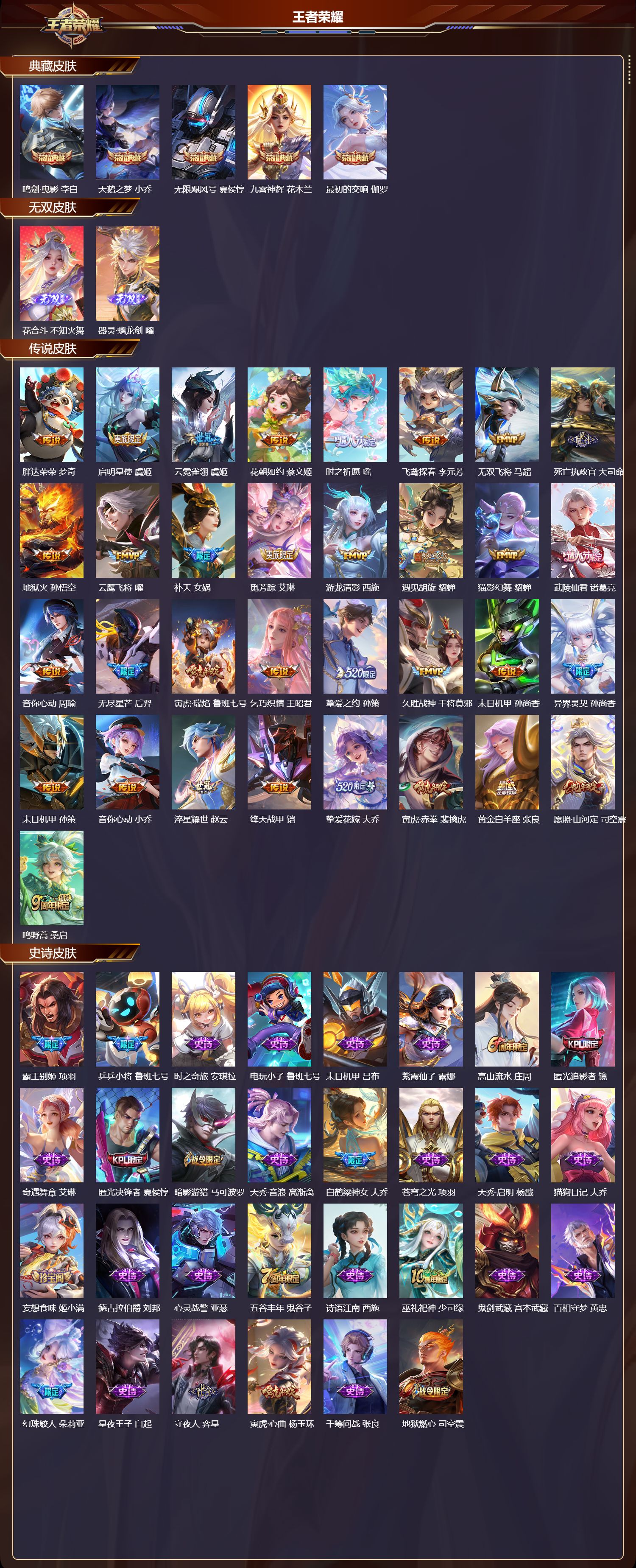 【119,史诗皮肤】霸王别姬,项羽,乒乒小将,鲁班七号,时之奇旅,安琪拉,电玩小子,鲁班七号,末日机甲,吕布,紫霞仙子,露娜,高山流水,庄周,匿光追影者,镜,奇遇舞章,艾琳,匿光决锋者,夏侯惇,暗影游猎,马可波罗,天秀·音浪,高渐离,白鹤梁神女,大乔,苍穹之光,项羽,天秀·启明,杨戬,猫狗日记,大乔,妄想食味,姬小满,德古拉伯爵,刘邦,心灵战警,亚瑟,五谷丰年,鬼谷子,诗语江南,西施,巫礼祀神,少司缘,鬼剑武藏,宫本武藏,百相守梦,黄忠,幻珠鲛人,朵莉亚,星夜王子,白起,守夜人,弈星,寅虎·心曲,杨玉环,千筹问战,张良,地狱燃心,司空震,线条小狗,周瑜,玉兔公主,公孙离,摇滚巨星,嬴政,电玩高手,狂铁,顽趣,梦奇,蜜橘之夏,公孙离,拒霜思,嫦娥,魅力维加斯,妲己,乐园奇幻夜,钟馗,如梦令,嫦娥,偶像歌手,王昭君,霸王别姬,虞姬,荣光圣徽,蒙恬,女仆咖啡,妲己,赏金猎手,澜,九幽镇关,项羽,晚萤,娜可露露,遇见神鹿,瑶,舞动绿茵,蔡文姬,繁星吟游,蔡文姬,鹰眼统帅,狄仁杰,胡桃异想国,米莱狄,孙行者,孙悟空,李小龙,裴擒虎,纤云弄巧,云中君,如梦令,后羿,龙骑士,墨子,金属风暴,墨子,傲雪梅枪,韩信,特工魅影,百里守约,猫狗日记,孙策,原初追逐者,百里玄策,逐浪之夏,李元芳,时之祈愿,云中君,未来纪元,赵云,引擎之心,赵云,黎明之约,雅典娜,魔术师,狄仁杰,龙之律动,狂铁,唤灵魅影,貂蝉,皇家上将,赵云,冰冠公主,雅典娜,涂山红红,少司缘,战舞者,姬小满,功夫厨神,程咬金,东方月初,大司命,天才门将,刘禅,圣诞恋歌,貂蝉,云间偶戏,元歌,水晶猎龙者,花木兰,涂山容容,公孙离,破空之剑,亚连,百木心枪,赵云,一生所爱,露娜,圣诞狂欢,吕布,魅语,不知火舞,浮光幕影,芈月,罗小黑战记,百里玄策,永昼,夏洛特,天狼溯光者,伽罗,地狱岩魂,廉颇,纯白花嫁,小乔,冰雪圆舞曲,甄姬,火炮绅士,黄忠,青蛇,小乔,默契交锋,花木兰,月团寄思,沈梦溪,航海奇遇记,老夫子,雪上飞焰,哪吒,千年之狐,李白,节奏热浪,阿轲,女儿国国王,甄姬,织梦人,西施,游园惊梦,甄姬,万灵启世,女娲,寅虎·展翼,孙膑,心灵骇客,安琪拉,寅虎·御盾,廉颇,乱世虎臣,张飞,吟游魔法,明世隐,绅士熊喵,刘禅,缤纷独角兽,小乔,真爱魔法,干将莫邪,水果甜心,孙尚香,狂想玩偶喵,蒙犽,江河有灵,阿古朵,幽灵船长,曹操,乘风破浪,夏侯惇,暗隐猎兽者,兰陵王,