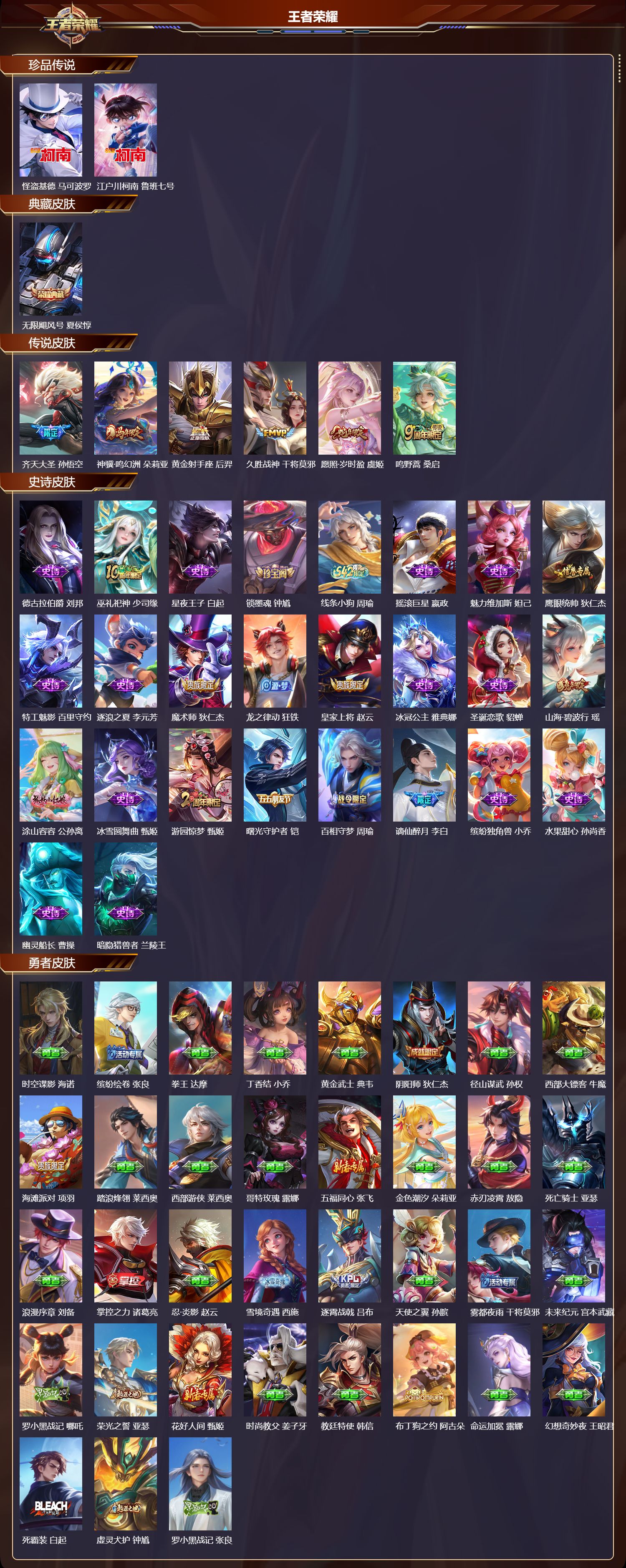【47,勇者皮肤】时空谍影,海诺,缤纷绘卷,张良,拳王,达摩,丁香结,小乔,黄金武士,典韦,阴阳师,狄仁杰,径山谋武,孙权,西部大镖客,牛魔,海滩派对,项羽,踏浪烽翎,莱西奥,西部游侠,莱西奥,哥特玫瑰,露娜,五福同心,张飞,金色潮汐,朵莉亚,赤刃凌霄,敖隐,死亡骑士,亚瑟,浪漫序章,刘备,掌控之力,诸葛亮,忍·炎影,赵云,雪境奇遇,西施,逐霄战戟,吕布,天使之翼,孙膑,雾都夜雨,干将莫邪,未来纪元,宫本武藏,罗小黑战记,哪吒,荣光之誓,亚瑟,花好人间,甄姬,时尚教父,姜子牙,教廷特使,韩信,布丁狗之约,阿古朵,命运加冕,露娜,幻想奇妙夜,王昭君,死霸装,白起,虚灵犬护,钟馗,罗小黑战记,张良,铁骨偃魂,典韦,苍林狼骑,苍,魅影绮裳,影,谧流熔炉,太乙真人,暗都幽影,大司命,鹤鸣心笺,艾琳,逆浪荇歌,甄姬,百相守梦,孙策,海之女神,海月,线条小狗,周瑜,噬灭天穹,东皇太一,景韶洛都,明世隐,