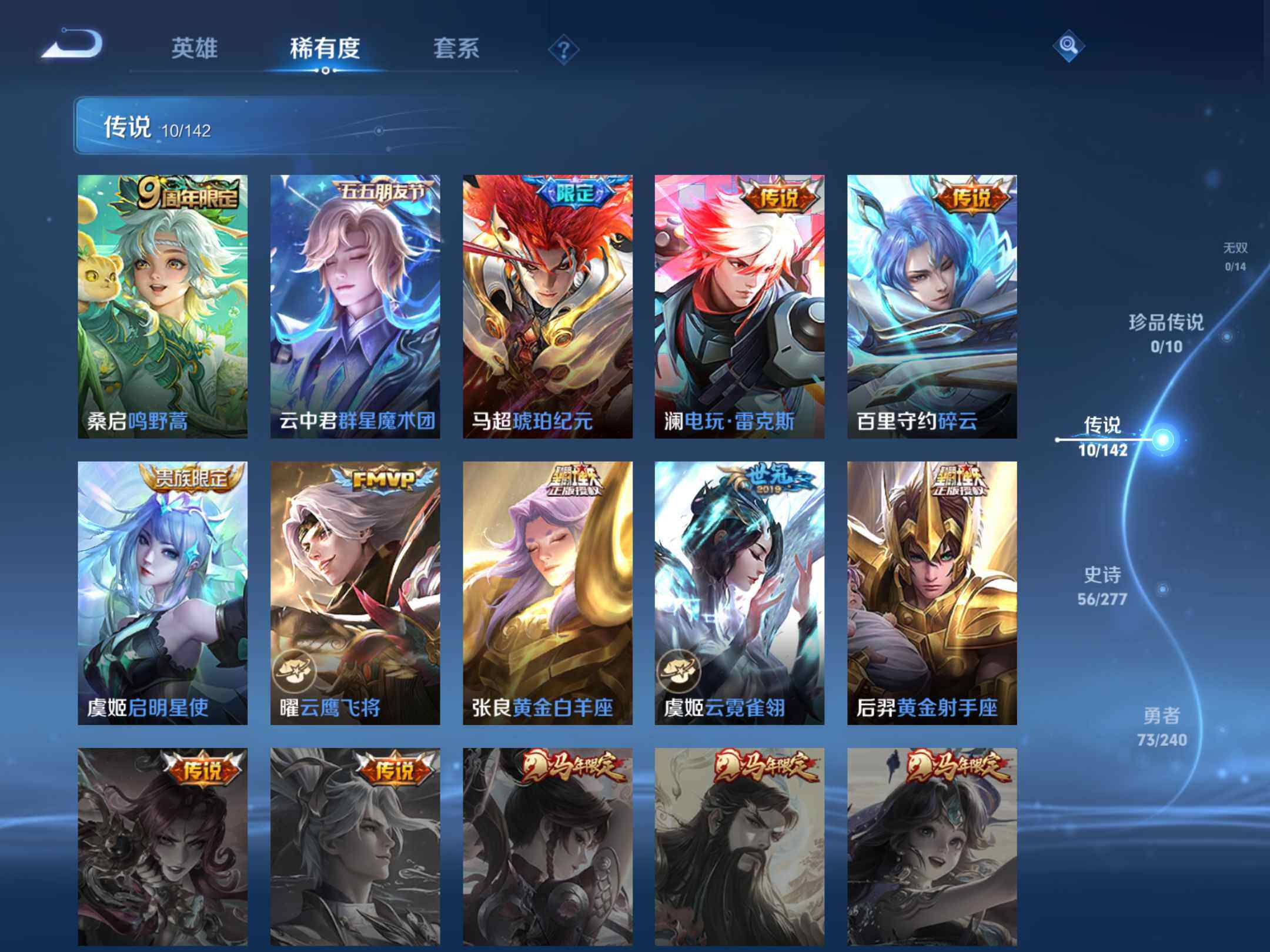 【传说皮肤】:桑启鸣野蒿,云中君群星魔术团,马超琥珀纪元,澜电玩雷克斯,百里守约碎云,虞姬启明星使,曜云鹰飞将,张良黄金白羊座,虞姬云霓雀翎,后羿黄金射手座