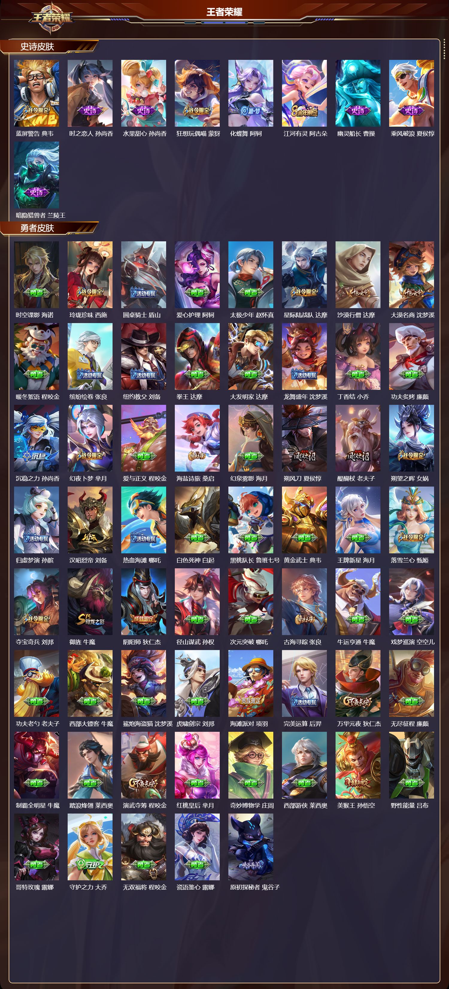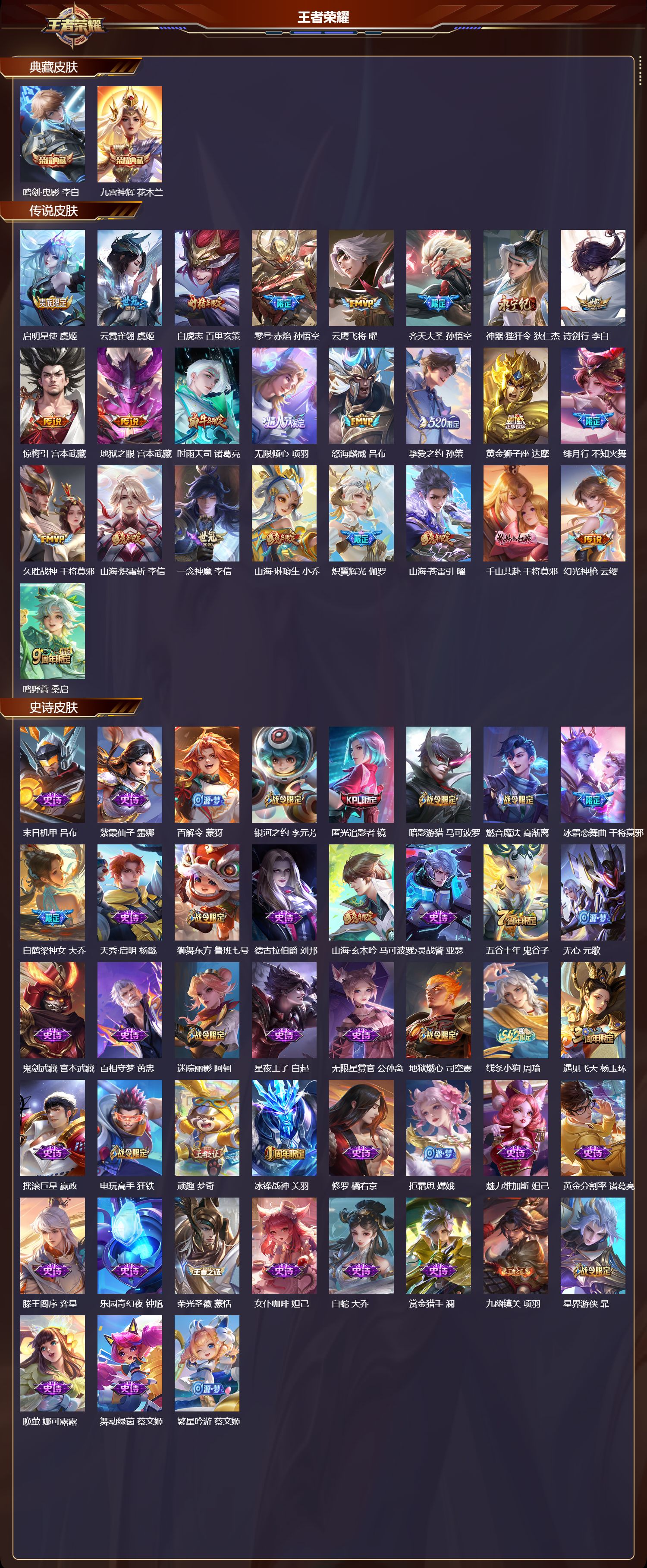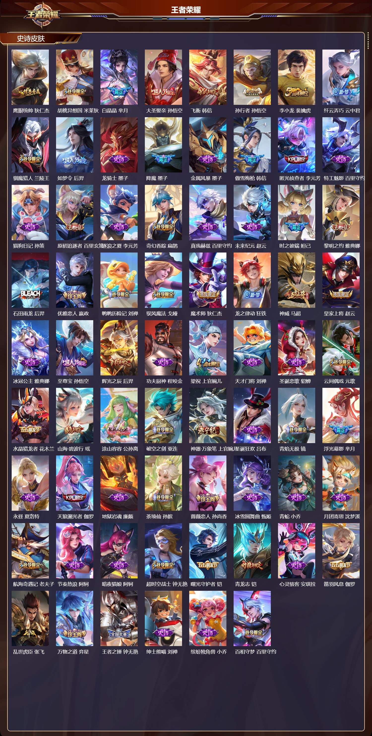 【122,史诗皮肤】末日机甲,吕布,紫霞仙子,露娜,百解令,蒙犽,银河之约,李元芳,匿光追影者,镜,暗影游猎,马可波罗,燃音魔法,高渐离,冰霜恋舞曲,干将莫邪,白鹤梁神女,大乔,天秀·启明,杨戬,狮舞东方,鲁班七号,德古拉伯爵,刘邦,山海·玄木吟,马可波罗,心灵战警,亚瑟,五谷丰年,鬼谷子,无心,元歌,鬼剑武藏,宫本武藏,百相守梦,黄忠,迷踪丽影,阿轲,星夜王子,白起,无限星赏官,公孙离,地狱燃心,司空震,线条小狗,周瑜,遇见飞天,杨玉环,摇滚巨星,嬴政,电玩高手,狂铁,顽趣,梦奇,冰锋战神,关羽,修罗,橘右京,拒霜思,嫦娥,魅力维加斯,妲己,黄金分割率,诸葛亮,滕王阁序,弈星,乐园奇幻夜,钟馗,荣光圣徽,蒙恬,女仆咖啡,妲己,白蛇,大乔,赏金猎手,澜,九幽镇关,项羽,星界游侠,暃,晚萤,娜可露露,舞动绿茵,蔡文姬,繁星吟游,蔡文姬,鹰眼统帅,狄仁杰,胡桃异想国,米莱狄,白晶晶,芈月,大圣娶亲,孙悟空,飞衡,韩信,孙行者,孙悟空,李小龙,裴擒虎,纤云弄巧,云中君,驯魔猎人,兰陵王,如梦令,后羿,龙骑士,墨子,降魔,墨子,金属风暴,墨子,傲雪梅枪,韩信,匿光侦查者,李元芳,特工魅影,百里守约,猫狗日记,孙策,原初追逐者,百里玄策,逐浪之夏,李元芳,奇幻香踪,扁鹊,真我赫兹,百里守约,未来纪元,赵云,时之彼端,妲己,黎明之约,雅典娜,石田雨龙,后羿,优雅恋人,嬴政,鸭鸭历险记,刘禅,驭风魔法,戈娅,魔术师,狄仁杰,龙之律动,狂铁,神威,马超,皇家上将,赵云,冰冠公主,雅典娜,至尊宝,孙悟空,辉光之辰,后羿,功夫厨神,程咬金,梁祝,上官婉儿,天才门将,刘禅,圣诞恋歌,貂蝉,云间偶戏,元歌,水晶猎龙者,花木兰,山海·碧波行,瑶,涂山容容,公孙离,破空之剑,亚连,神器·万象笔,上官婉儿,圣诞狂欢,吕布,青焰无极,镜,浮光幕影,芈月,永昼,夏洛特,天狼溯光者,伽罗,地狱岩魂,廉颇,茶境仙,孙膑,蔷薇恋人,孙尚香,冰雪圆舞曲,甄姬,青蛇,小乔,月团寄思,沈梦溪,航海奇遇记,老夫子,节奏热浪,阿轲,暗夜猫娘,阿轲,超时空战士,钟无艳,曙光守护者,铠,青龙志,铠,心灵骇客,安琪拉,箭羽风息,伽罗,乱世虎臣,张飞,万物之道,弈星,王者之锤,钟无艳,绅士熊喵,刘禅,缤纷独角兽,小乔,百相守梦,百里守约,蓝屏警告,典韦,时之恋人,孙尚香,水果甜心,孙尚香,狂想玩偶喵,蒙犽,化蝶舞,阿轲,江河有灵,阿古朵,幽灵船长,曹操,乘风破浪,夏侯惇,暗隐猎兽者,兰陵王,