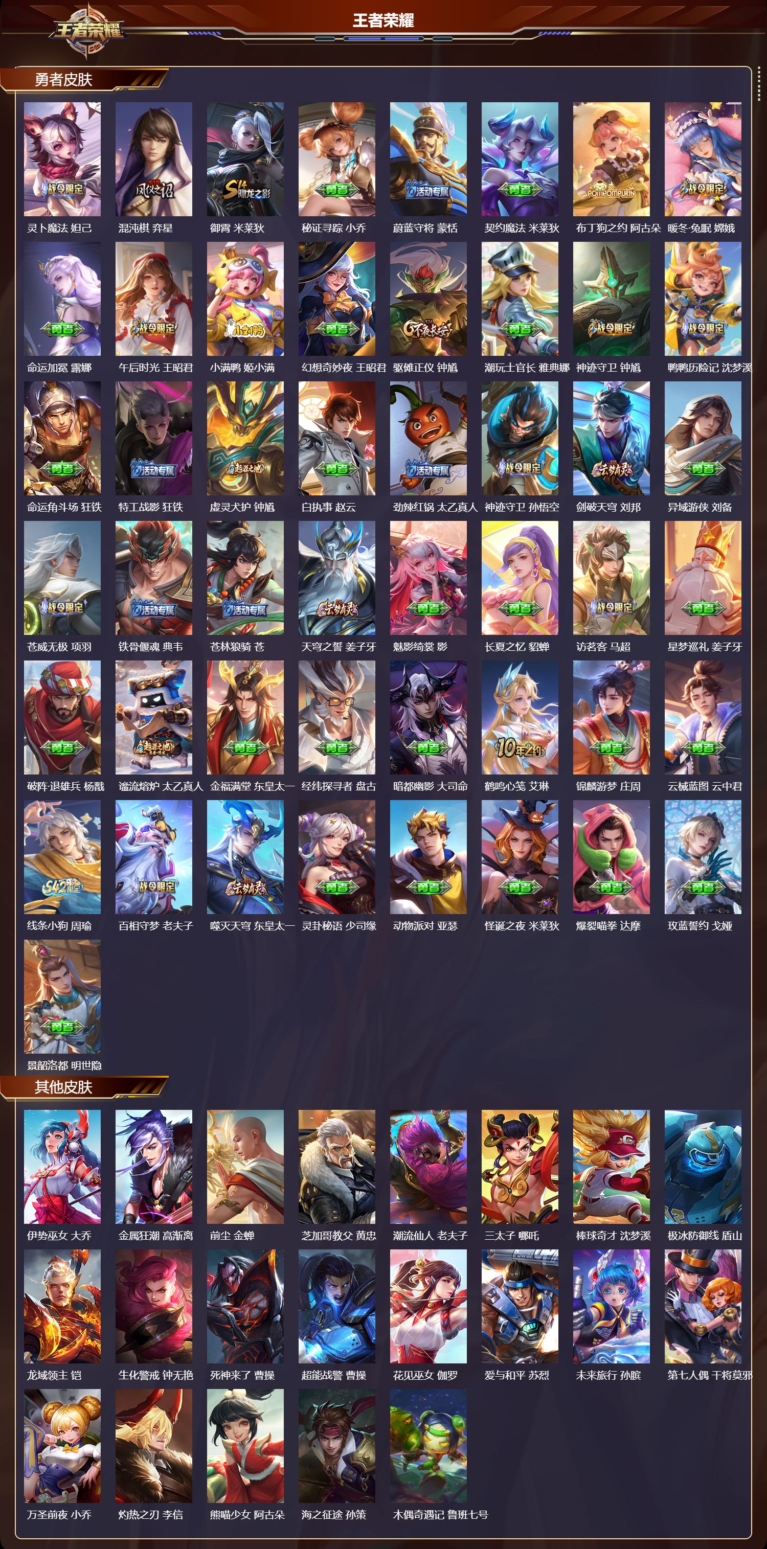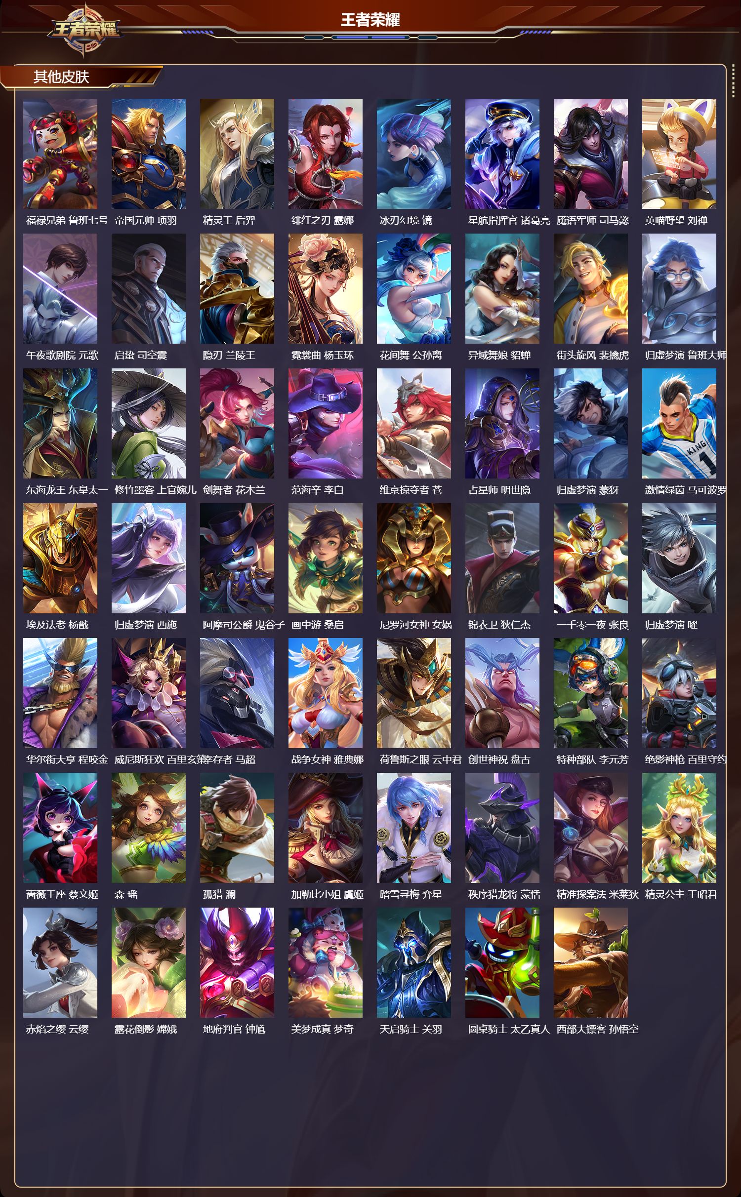 【76,其他皮肤】伊势巫女,大乔,金属狂潮,高渐离,前尘,金蝉,芝加哥教父,黄忠,潮流仙人,老夫子,三太子,哪吒,棒球奇才,沈梦溪,极冰防御线,盾山,龙域领主,铠,生化警戒,钟无艳,死神来了,曹操,超能战警,曹操,花见巫女,伽罗,爱与和平,苏烈,未来旅行,孙膑,第七人偶,干将莫邪,万圣前夜,小乔,灼热之刃,李信,熊喵少女,阿古朵,海之征途,孙策,木偶奇遇记,鲁班七号,福禄兄弟,鲁班七号,帝国元帅,项羽,精灵王,后羿,绯红之刃,露娜,冰刃幻境,镜,星航指挥官,诸葛亮,魇语军师,司马懿,英喵野望,刘禅,午夜歌剧院,元歌,启蛰,司空震,隐刃,兰陵王,霓裳曲,杨玉环,花间舞,公孙离,异域舞娘,貂蝉,街头旋风,裴擒虎,归虚梦演,鲁班大师,东海龙王,东皇太一,修竹墨客,上官婉儿,剑舞者,花木兰,范海辛,李白,维京掠夺者,苍,占星师,明世隐,归虚梦演,蒙犽,激情绿茵,马可波罗,埃及法老,杨戬,归虚梦演,西施,阿摩司公爵,鬼谷子,画中游,桑启,尼罗河女神,女娲,锦衣卫,狄仁杰,一千零一夜,张良,归虚梦演,曜,华尔街大亨,程咬金,威尼斯狂欢,百里玄策,幸存者,马超,战争女神,雅典娜,荷鲁斯之眼,云中君,创世神祝,盘古,特种部队,李元芳,绝影神枪,百里守约,蔷薇王座,蔡文姬,森,瑶,孤猎,澜,加勒比小姐,虞姬,踏雪寻梅,弈星,秩序猎龙将,蒙恬,精准探案法,米莱狄,精灵公主,王昭君,赤焰之缨,云缨,露花倒影,嫦娥,地府判官,钟馗,美梦成真,梦奇,天启骑士,关羽,圆桌骑士,太乙真人,西部大镖客,孙悟空,