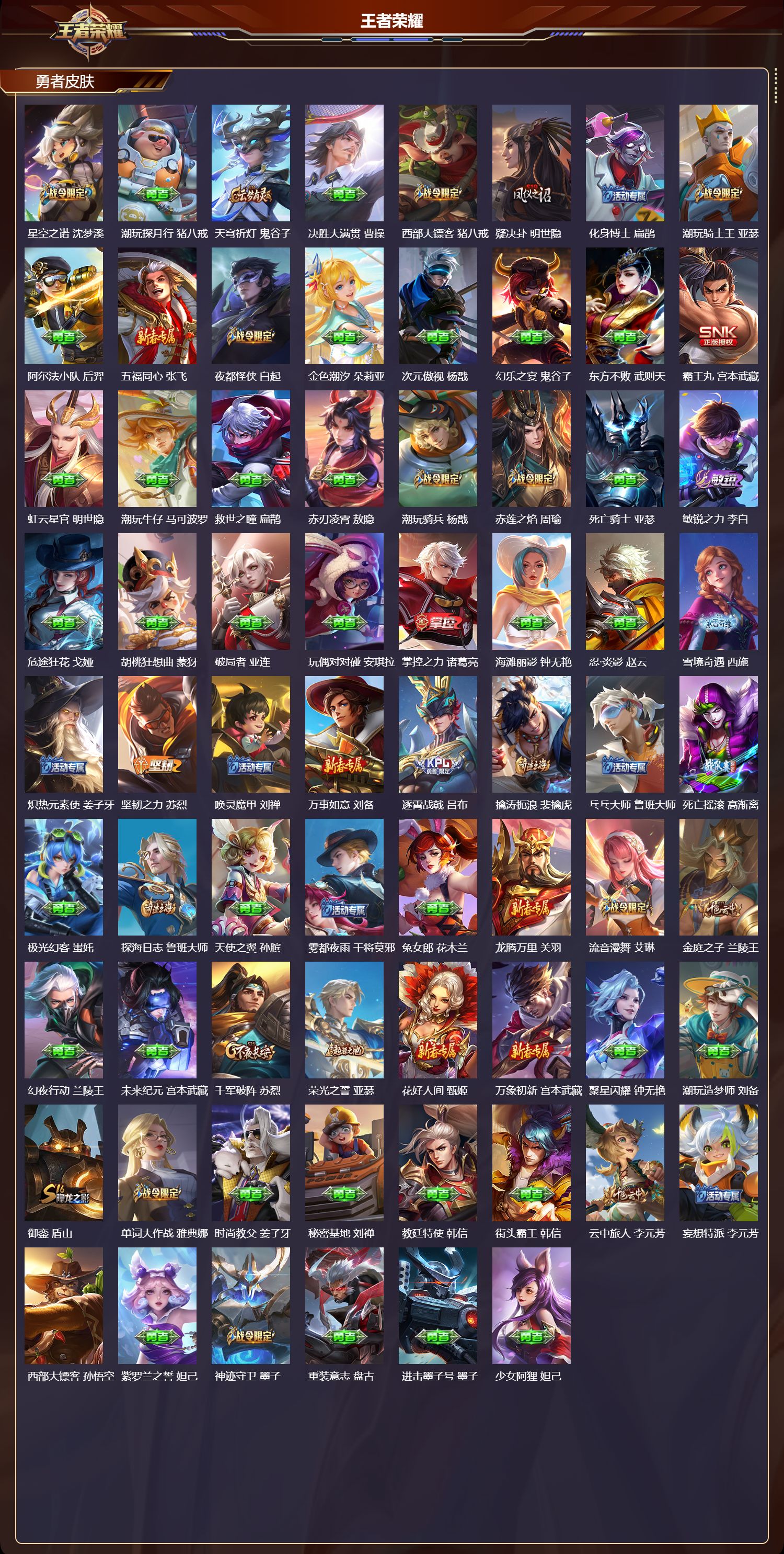 【180,勇者皮肤】时空谍影,海诺,玲珑珍味,西施,圆桌骑士,盾山,爱心护理,阿轲,太极少年,赵怀真,星际陆战队,达摩,沙漠行僧,达摩,大漠名商,沈梦溪,暖冬絮语,程咬金,缤纷绘卷,张良,纽约教父,刘备,拳王,达摩,大发明家,达摩,龙舞盛年,沈梦溪,丁香结,小乔,功夫炙烤,廉颇,沉稳之力,孙尚香,幻夜卜梦,芈月,爱与正义,程咬金,海盐诗旅,桑启,幻泉雾影,海月,朔风刀,夏侯惇,醍醐杖,老夫子,朔望之晖,女娲,归虚梦演,孙膑,汉昭烈帝,刘备,热血海滩,哪吒,白色死神,白起,黑桃队长,鲁班七号,黄金武士,典韦,王牌新星,海月,落雪兰心,甄姬,夺宝奇兵,刘邦,御旌,牛魔,阴阳师,狄仁杰,径山谋武,孙权,次元突破,哪吒,古海寻踪,张良,牛运亨通,牛魔,戏梦巡演,空空儿,功夫老勺,老夫子,西部大镖客,牛魔,鲨炮海盗猫,沈梦溪,虎啸剑宗,刘邦,海滩派对,项羽,完美运算,后羿,万华元夜,狄仁杰,无尽征程,廉颇,制霸全明星,牛魔,踏浪烽翎,莱西奥,演武夺筹,程咬金,红桃皇后,芈月,奇妙博物学,庄周,西部游侠,莱西奥,美猴王,孙悟空,野性能量,吕布,哥特玫瑰,露娜,守护之力,大乔,无双福将,程咬金,瓷语鉴心,露娜,原初探秘者,鬼谷子,星空之诺,沈梦溪,潮玩探月行,猪八戒,天穹祈灯,鬼谷子,决胜大满贯,曹操,西部大镖客,猪八戒,疑决卦,明世隐,化身博士,扁鹊,潮玩骑士王,亚瑟,阿尔法小队,后羿,五福同心,张飞,夜都怪侠,白起,金色潮汐,朵莉亚,次元傲视,杨戬,幻乐之宴,鬼谷子,东方不败,武则天,霸王丸,宫本武藏,虹云星官,明世隐,潮玩牛仔,马可波罗,救世之瞳,扁鹊,赤刃凌霄,敖隐,潮玩骑兵,杨戬,赤莲之焰,周瑜,死亡骑士,亚瑟,敏锐之力,李白,危途狂花,戈娅,胡桃狂想曲,蒙犽,破局者,亚连,玩偶对对碰,安琪拉,掌控之力,诸葛亮,海滩丽影,钟无艳,忍·炎影,赵云,雪境奇遇,西施,炽热元素使,姜子牙,坚韧之力,苏烈,唤灵魔甲,刘禅,万事如意,刘备,逐霄战戟,吕布,擒涛扼浪,裴擒虎,乓乓大师,鲁班大师,死亡摇滚,高渐离,极光幻客,蚩奼,探海日志,鲁班大师,天使之翼,孙膑,雾都夜雨,干将莫邪,兔女郎,花木兰,龙腾万里,关羽,流音漫舞,艾琳,金庭之子,兰陵王,幻夜行动,兰陵王,未来纪元,宫本武藏,千军破阵,苏烈,荣光之誓,亚瑟,花好人间,甄姬,万象初新,宫本武藏,聚星闪耀,钟无艳,潮玩造梦师,刘备,御銮,盾山,单词大作战,雅典娜,时尚教父,姜子牙,秘密基地,刘禅,教廷特使,韩信,街头霸王,韩信,云中旅人,李元芳,妄想特派,李元芳,西部大镖客,孙悟空,紫罗兰之誓,妲己,神迹守卫,墨子,重装意志,盘古,进击墨子号,墨子,少女阿狸,妲己,灵卜魔法,妲己,混沌棋,弈星,御霄,米莱狄,秘证寻踪,小乔,蔚蓝守将,蒙恬,契约魔法,米莱狄,布丁狗之约,阿古朵,暖冬·兔眠,嫦娥,命运加冕,露娜,午后时光,王昭君,小满鸭,姬小满,幻想奇妙夜,王昭君,驱傩正仪,钟馗,潮玩士官长,雅典娜,神迹守卫,钟馗,鸭鸭历险记,沈梦溪,命运角斗场,狂铁,特工战影,狂铁,虚灵犬护,钟馗,白执事,赵云,劲辣红锅,太乙真人,神迹守卫,孙悟空,剑破天穹,刘邦,异域游侠,刘备,苍威无极,项羽,铁骨偃魂,典韦,苍林狼骑,苍,天穹之誓,姜子牙,魅影绮裳,影,长夏之忆,貂蝉,访茗客,马超,星梦巡礼,姜子牙,破阵·退雄兵,杨戬,谧流熔炉,太乙真人,金福满堂,东皇太一,经纬探寻者,盘古,暗都幽影,大司命,鹤鸣心笺,艾琳,锦麟游梦,庄周,云械蓝图,云中君,线条小狗,周瑜,百相守梦,老夫子,噬灭天穹,东皇太一,灵卦秘语,少司缘,动物派对,亚瑟,怪诞之夜,米莱狄,爆裂喵拳,达摩,玫蓝誓约,戈娅,景韶洛都,明世隐,