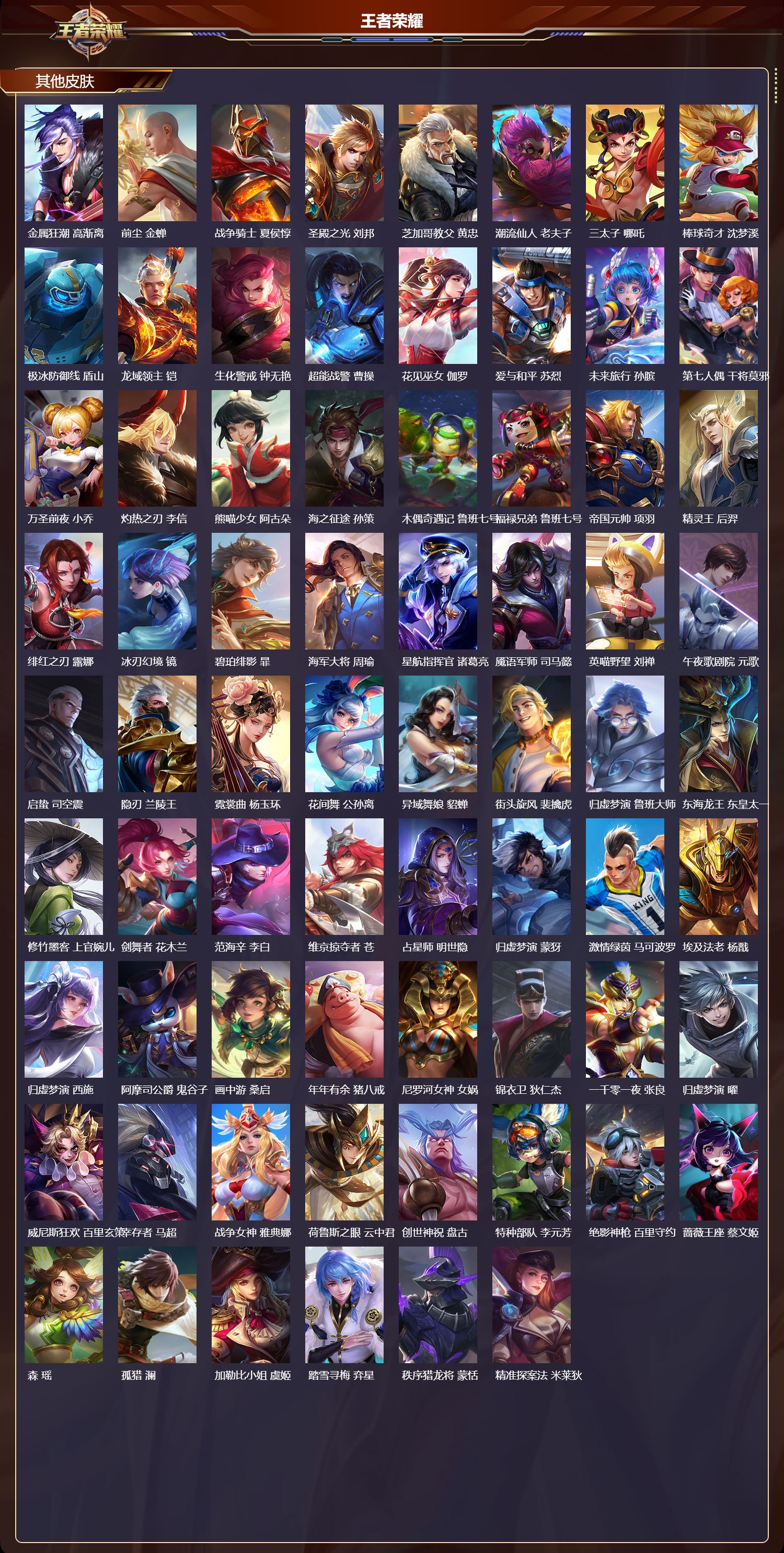 【79,其他皮肤】伊势巫女,大乔,金属狂潮,高渐离,前尘,金蝉,战争骑士,夏侯惇,圣殿之光,刘邦,芝加哥教父,黄忠,潮流仙人,老夫子,三太子,哪吒,棒球奇才,沈梦溪,极冰防御线,盾山,龙域领主,铠,生化警戒,钟无艳,超能战警,曹操,花见巫女,伽罗,爱与和平,苏烈,未来旅行,孙膑,第七人偶,干将莫邪,万圣前夜,小乔,灼热之刃,李信,熊喵少女,阿古朵,海之征途,孙策,木偶奇遇记,鲁班七号,福禄兄弟,鲁班七号,帝国元帅,项羽,精灵王,后羿,绯红之刃,露娜,冰刃幻境,镜,碧珀绯影,暃,海军大将,周瑜,星航指挥官,诸葛亮,魇语军师,司马懿,英喵野望,刘禅,午夜歌剧院,元歌,启蛰,司空震,隐刃,兰陵王,霓裳曲,杨玉环,花间舞,公孙离,异域舞娘,貂蝉,街头旋风,裴擒虎,归虚梦演,鲁班大师,东海龙王,东皇太一,修竹墨客,上官婉儿,剑舞者,花木兰,范海辛,李白,维京掠夺者,苍,占星师,明世隐,归虚梦演,蒙犽,激情绿茵,马可波罗,埃及法老,杨戬,归虚梦演,西施,阿摩司公爵,鬼谷子,画中游,桑启,年年有余,猪八戒,尼罗河女神,女娲,锦衣卫,狄仁杰,一千零一夜,张良,归虚梦演,曜,威尼斯狂欢,百里玄策,幸存者,马超,战争女神,雅典娜,荷鲁斯之眼,云中君,创世神祝,盘古,特种部队,李元芳,绝影神枪,百里守约,蔷薇王座,蔡文姬,森,瑶,孤猎,澜,加勒比小姐,虞姬,踏雪寻梅,弈星,秩序猎龙将,蒙恬,精准探案法,米莱狄,精灵公主,王昭君,赤焰之缨,云缨,露花倒影,嫦娥,地府判官,钟馗,美梦成真,梦奇,天启骑士,关羽,圆桌骑士,太乙真人,西部大镖客,孙悟空,