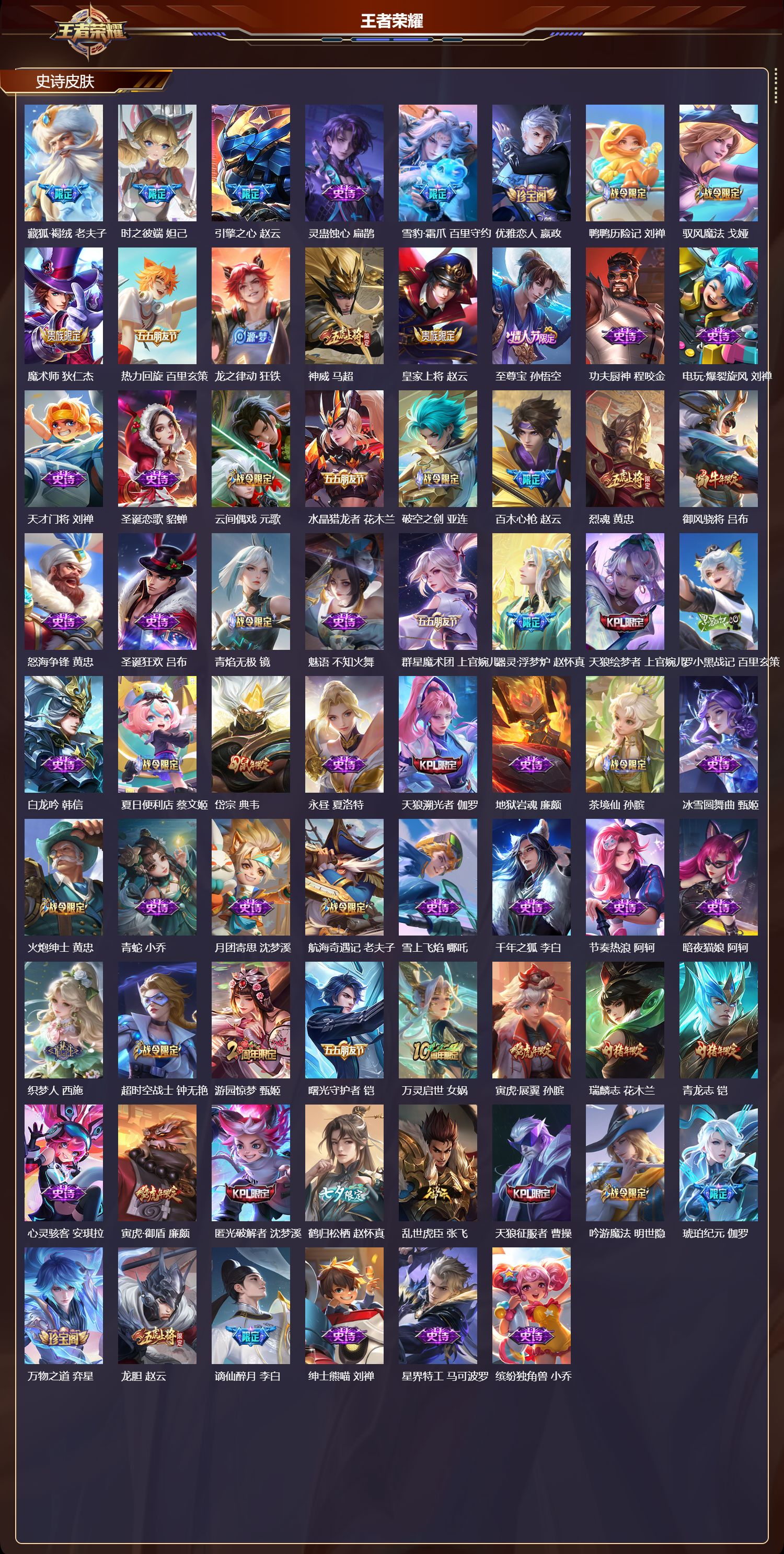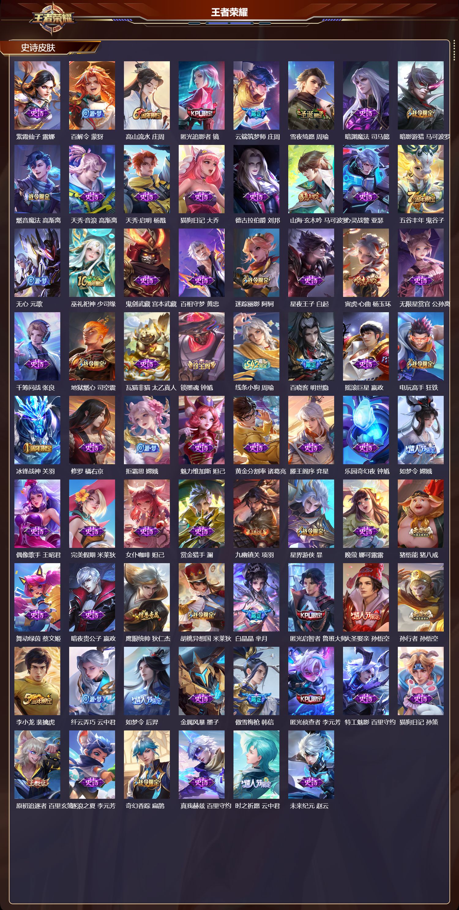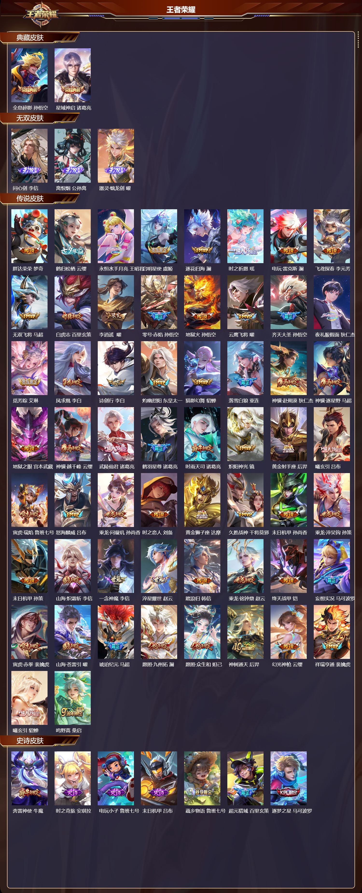 【160,史诗皮肤】奔雷神使,牛魔,时之奇旅,安琪拉,电玩小子,鲁班七号,末日机甲,吕布,蔬乡物语,鲁班七号,超元猎域,百里玄策,逐梦之星,马可波罗,紫霞仙子,露娜,百解令,蒙犽,高山流水,庄周,匿光追影者,镜,云端筑梦师,庄周,雪夜绮愿,周瑜,暗渊魔法,司马懿,暗影游猎,马可波罗,燃音魔法,高渐离,天秀·音浪,高渐离,天秀·启明,杨戬,猫狗日记,大乔,德古拉伯爵,刘邦,山海·玄木吟,马可波罗,心灵战警,亚瑟,五谷丰年,鬼谷子,无心,元歌,巫礼祀神,少司缘,鬼剑武藏,宫本武藏,百相守梦,黄忠,迷踪丽影,阿轲,星夜王子,白起,寅虎·心曲,杨玉环,无限星赏官,公孙离,千筹问战,张良,地狱燃心,司空震,瓦猫非猫,太乙真人,锁墨魂,钟馗,线条小狗,周瑜,百晓客,明世隐,摇滚巨星,嬴政,电玩高手,狂铁,冰锋战神,关羽,修罗,橘右京,拒霜思,嫦娥,魅力维加斯,妲己,黄金分割率,诸葛亮,滕王阁序,弈星,乐园奇幻夜,钟馗,如梦令,嫦娥,偶像歌手,王昭君,完美假期,米莱狄,女仆咖啡,妲己,赏金猎手,澜,九幽镇关,项羽,星界游侠,暃,晚萤,娜可露露,猪悟能,猪八戒,舞动绿茵,蔡文姬,暗夜贵公子,嬴政,鹰眼统帅,狄仁杰,胡桃异想国,米莱狄,白晶晶,芈月,匿光启智者,鲁班大师,大圣娶亲,孙悟空,孙行者,孙悟空,李小龙,裴擒虎,纤云弄巧,云中君,如梦令,后羿,金属风暴,墨子,傲雪梅枪,韩信,匿光侦查者,李元芳,特工魅影,百里守约,猫狗日记,孙策,原初追逐者,百里玄策,逐浪之夏,李元芳,奇幻香踪,扁鹊,真我赫兹,百里守约,时之祈愿,云中君,未来纪元,赵云,藏狐·褐绒,老夫子,时之彼端,妲己,引擎之心,赵云,灵蛊蚀心,扁鹊,雪豹·霜爪,百里守约,优雅恋人,嬴政,鸭鸭历险记,刘禅,驭风魔法,戈娅,魔术师,狄仁杰,热力回旋,百里玄策,龙之律动,狂铁,神威,马超,皇家上将,赵云,至尊宝,孙悟空,功夫厨神,程咬金,电玩·爆裂旋风,刘禅,天才门将,刘禅,圣诞恋歌,貂蝉,云间偶戏,元歌,水晶猎龙者,花木兰,破空之剑,亚连,百木心枪,赵云,烈魂,黄忠,御风骁将,吕布,怒海争锋,黄忠,圣诞狂欢,吕布,青焰无极,镜,魅语,不知火舞,群星魔术团,上官婉儿,器灵·浮梦炉,赵怀真,天狼绘梦者,上官婉儿,罗小黑战记,百里玄策,白龙吟,韩信,夏日便利店,蔡文姬,岱宗,典韦,永昼,夏洛特,天狼溯光者,伽罗,地狱岩魂,廉颇,茶境仙,孙膑,冰雪圆舞曲,甄姬,火炮绅士,黄忠,青蛇,小乔,月团寄思,沈梦溪,航海奇遇记,老夫子,雪上飞焰,哪吒,千年之狐,李白,节奏热浪,阿轲,暗夜猫娘,阿轲,织梦人,西施,超时空战士,钟无艳,游园惊梦,甄姬,曙光守护者,铠,万灵启世,女娲,寅虎·展翼,孙膑,瑞麟志,花木兰,青龙志,铠,心灵骇客,安琪拉,寅虎·御盾,廉颇,匿光破解者,沈梦溪,鹤归松栖,赵怀真,乱世虎臣,张飞,天狼征服者,曹操,吟游魔法,明世隐,琥珀纪元,伽罗,万物之道,弈星,龙胆,赵云,谪仙醉月,李白,绅士熊喵,刘禅,星界特工,马可波罗,缤纷独角兽,小乔,百相守梦,百里守约,线条小狗,小乔,天狼狩猎者,裴擒虎,真爱魔法,干将莫邪,时之恋人,孙尚香,水果甜心,孙尚香,狂想玩偶喵,蒙犽,化蝶舞,阿轲,江河有灵,阿古朵,狼魂孤将,苍,幽灵船长,曹操,乘风破浪,夏侯惇,暗隐猎兽者,兰陵王,
