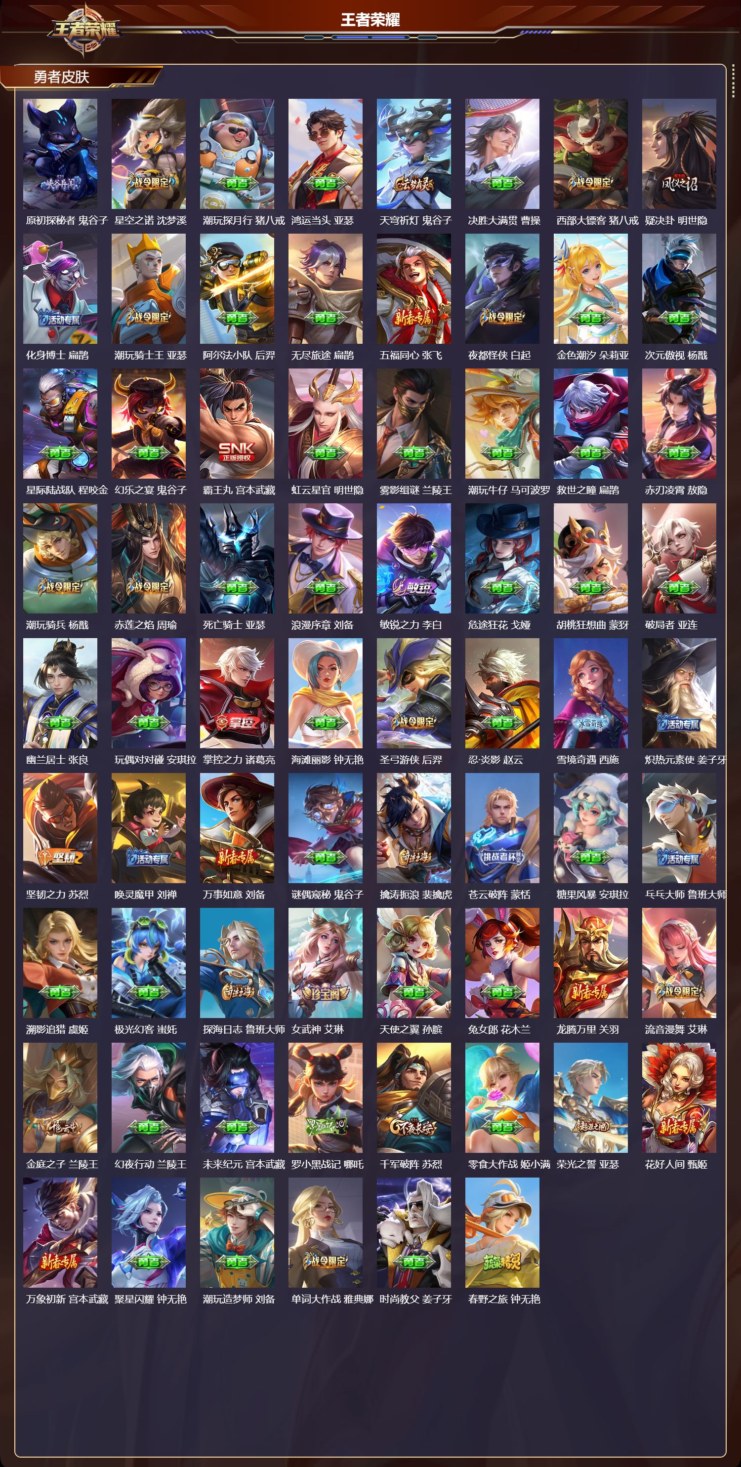 【196,勇者皮肤】时空谍影,海诺,玲珑珍味,西施,圆桌骑士,盾山,爱心护理,阿轲,太极少年,赵怀真,星际陆战队,达摩,沙漠行僧,达摩,大漠名商,沈梦溪,暖冬絮语,程咬金,缤纷绘卷,张良,纽约教父,刘备,拳王,达摩,大发明家,达摩,龙舞盛年,沈梦溪,乐园追猎者,白起,丁香结,小乔,功夫炙烤,廉颇,沉稳之力,孙尚香,幻夜卜梦,芈月,海盐诗旅,桑启,幻泉雾影,海月,醍醐杖,老夫子,归虚梦演,孙膑,汉昭烈帝,刘备,热血海滩,哪吒,白色死神,白起,黑桃队长,鲁班七号,黄金武士,典韦,王牌新星,海月,落雪兰心,甄姬,阴阳师,狄仁杰,径山谋武,孙权,次元突破,哪吒,古海寻踪,张良,牛运亨通,牛魔,科学大爆炸,项羽,戏梦巡演,空空儿,功夫老勺,老夫子,西部大镖客,牛魔,鲨炮海盗猫,沈梦溪,鲤鱼之梦,庄周,虎啸剑宗,刘邦,海滩派对,项羽,完美运算,后羿,万华元夜,狄仁杰,克喵,鬼谷子,踏浪烽翎,莱西奥,演武夺筹,程咬金,红桃皇后,芈月,奇妙博物学,庄周,西部游侠,莱西奥,美猴王,孙悟空,野性能量,吕布,哥特玫瑰,露娜,守护之力,大乔,无双福将,程咬金,瓷语鉴心,露娜,原初探秘者,鬼谷子,星空之诺,沈梦溪,潮玩探月行,猪八戒,鸿运当头,亚瑟,天穹祈灯,鬼谷子,决胜大满贯,曹操,西部大镖客,猪八戒,疑决卦,明世隐,化身博士,扁鹊,潮玩骑士王,亚瑟,阿尔法小队,后羿,无尽旅途,扁鹊,五福同心,张飞,夜都怪侠,白起,金色潮汐,朵莉亚,次元傲视,杨戬,星际陆战队,程咬金,幻乐之宴,鬼谷子,霸王丸,宫本武藏,虹云星官,明世隐,雾影缉谜,兰陵王,潮玩牛仔,马可波罗,救世之瞳,扁鹊,赤刃凌霄,敖隐,潮玩骑兵,杨戬,赤莲之焰,周瑜,死亡骑士,亚瑟,浪漫序章,刘备,敏锐之力,李白,危途狂花,戈娅,胡桃狂想曲,蒙犽,破局者,亚连,幽兰居士,张良,玩偶对对碰,安琪拉,掌控之力,诸葛亮,海滩丽影,钟无艳,圣弓游侠,后羿,忍·炎影,赵云,雪境奇遇,西施,炽热元素使,姜子牙,坚韧之力,苏烈,唤灵魔甲,刘禅,万事如意,刘备,谜偶窥秘,鬼谷子,擒涛扼浪,裴擒虎,苍云破阵,蒙恬,糖果风暴,安琪拉,乓乓大师,鲁班大师,溯影追猎,虞姬,极光幻客,蚩奼,探海日志,鲁班大师,女武神,艾琳,天使之翼,孙膑,兔女郎,花木兰,龙腾万里,关羽,流音漫舞,艾琳,金庭之子,兰陵王,幻夜行动,兰陵王,未来纪元,宫本武藏,罗小黑战记,哪吒,千军破阵,苏烈,零食大作战,姬小满,荣光之誓,亚瑟,花好人间,甄姬,万象初新,宫本武藏,聚星闪耀,钟无艳,潮玩造梦师,刘备,单词大作战,雅典娜,时尚教父,姜子牙,春野之旅,钟无艳,秘密基地,刘禅,教廷特使,韩信,街头霸王,韩信,云中旅人,李元芳,妄想特派,李元芳,西部大镖客,孙悟空,紫罗兰之誓,妲己,神迹守卫,墨子,重装意志,盘古,进击墨子号,墨子,蔬乡物语,李元芳,少女阿狸,妲己,灵卜魔法,妲己,混沌棋,弈星,秘证寻踪,小乔,蔚蓝守将,蒙恬,春野闲踪,苏烈,契约魔法,米莱狄,布丁狗之约,阿古朵,暖冬·兔眠,嫦娥,命运加冕,露娜,午后时光,王昭君,小满鸭,姬小满,幻想奇妙夜,王昭君,灵野札记,张良,驱傩正仪,钟馗,潮玩士官长,雅典娜,神迹守卫,钟馗,鸭鸭历险记,沈梦溪,命运角斗场,狂铁,死霸装,白起,特工战影,狂铁,虚灵犬护,钟馗,班班快跑,鲁班七号,漠中幻影,嫦娥,白执事,赵云,劲辣红锅,太乙真人,神迹守卫,孙悟空,罗小黑战记,张良,剑破天穹,刘邦,异域游侠,刘备,苍威无极,项羽,铁骨偃魂,典韦,熔金海岸,周瑜,苍林狼骑,苍,天穹之誓,姜子牙,魅影绮裳,影,长夏之忆,貂蝉,访茗客,马超,星梦巡礼,姜子牙,谧流熔炉,太乙真人,金福满堂,东皇太一,群星魔术团,程咬金,经纬探寻者,盘古,暗都幽影,大司命,夏日便利店,虞姬,鹤鸣心笺,艾琳,锦麟游梦,庄周,云械蓝图,云中君,逆浪荇歌,甄姬,线条小狗,周瑜,线条小狗,桑启,百相守梦,老夫子,噬灭天穹,东皇太一,灵卦秘语,少司缘,动物派对,亚瑟,敬我三分,盘古,玫蓝誓约,戈娅,景韶洛都,明世隐,