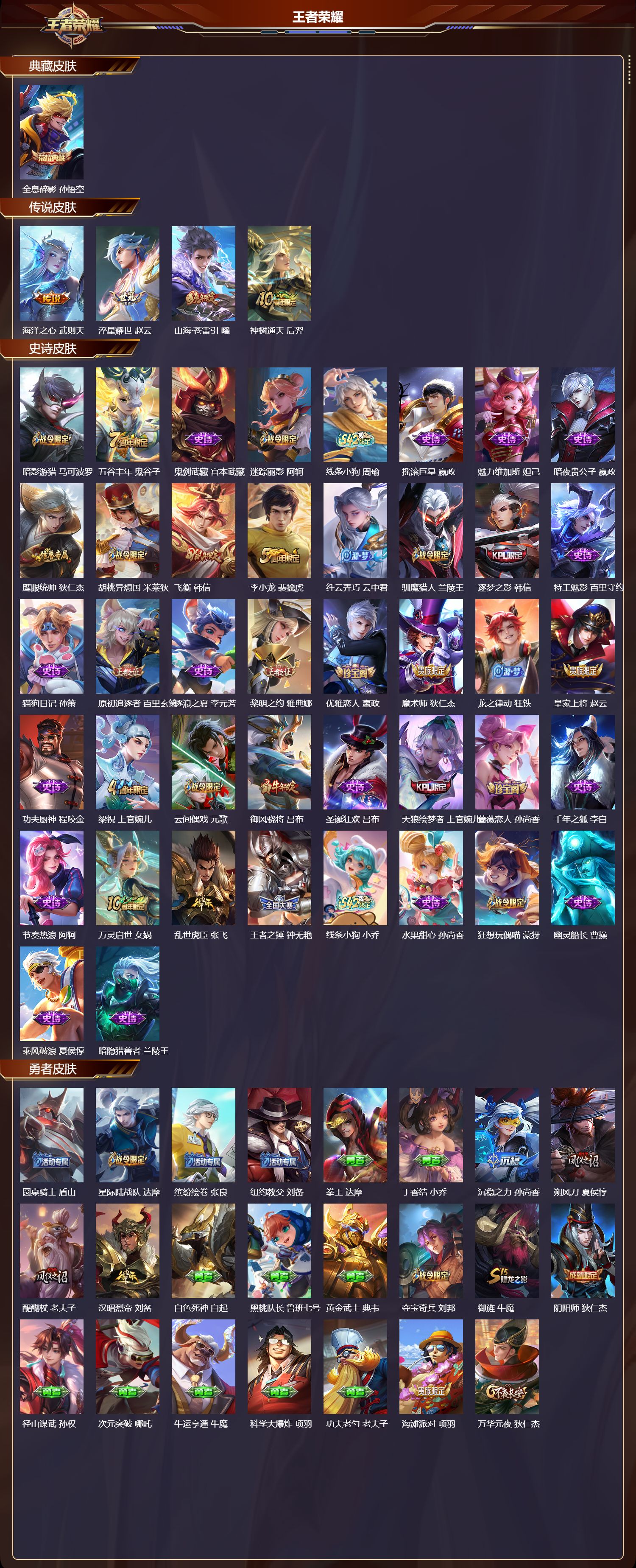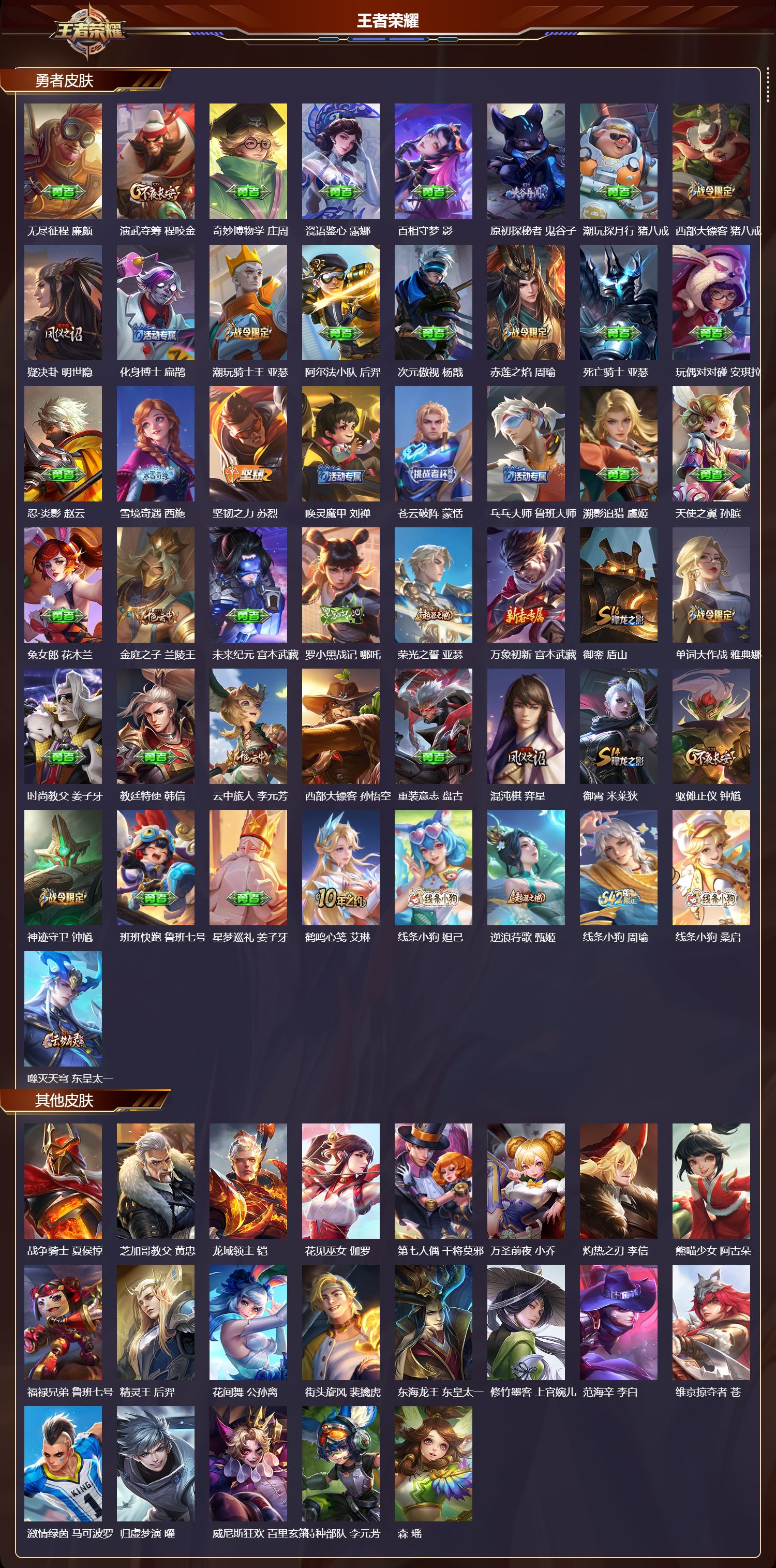【72,勇者皮肤】圆桌骑士,盾山,星际陆战队,达摩,缤纷绘卷,张良,纽约教父,刘备,拳王,达摩,丁香结,小乔,沉稳之力,孙尚香,朔风刀,夏侯惇,醍醐杖,老夫子,汉昭烈帝,刘备,白色死神,白起,黑桃队长,鲁班七号,黄金武士,典韦,夺宝奇兵,刘邦,御旌,牛魔,阴阳师,狄仁杰,径山谋武,孙权,次元突破,哪吒,牛运亨通,牛魔,科学大爆炸,项羽,功夫老勺,老夫子,海滩派对,项羽,万华元夜,狄仁杰,无尽征程,廉颇,演武夺筹,程咬金,奇妙博物学,庄周,瓷语鉴心,露娜,百相守梦,影,原初探秘者,鬼谷子,潮玩探月行,猪八戒,西部大镖客,猪八戒,疑决卦,明世隐,化身博士,扁鹊,潮玩骑士王,亚瑟,阿尔法小队,后羿,次元傲视,杨戬,赤莲之焰,周瑜,死亡骑士,亚瑟,玩偶对对碰,安琪拉,忍·炎影,赵云,雪境奇遇,西施,坚韧之力,苏烈,唤灵魔甲,刘禅,苍云破阵,蒙恬,乓乓大师,鲁班大师,溯影追猎,虞姬,天使之翼,孙膑,兔女郎,花木兰,金庭之子,兰陵王,未来纪元,宫本武藏,罗小黑战记,哪吒,荣光之誓,亚瑟,万象初新,宫本武藏,御銮,盾山,单词大作战,雅典娜,时尚教父,姜子牙,教廷特使,韩信,云中旅人,李元芳,西部大镖客,孙悟空,重装意志,盘古,混沌棋,弈星,御霄,米莱狄,驱傩正仪,钟馗,神迹守卫,钟馗,班班快跑,鲁班七号,星梦巡礼,姜子牙,鹤鸣心笺,艾琳,线条小狗,妲己,逆浪荇歌,甄姬,线条小狗,周瑜,线条小狗,桑启,噬灭天穹,东皇太一,