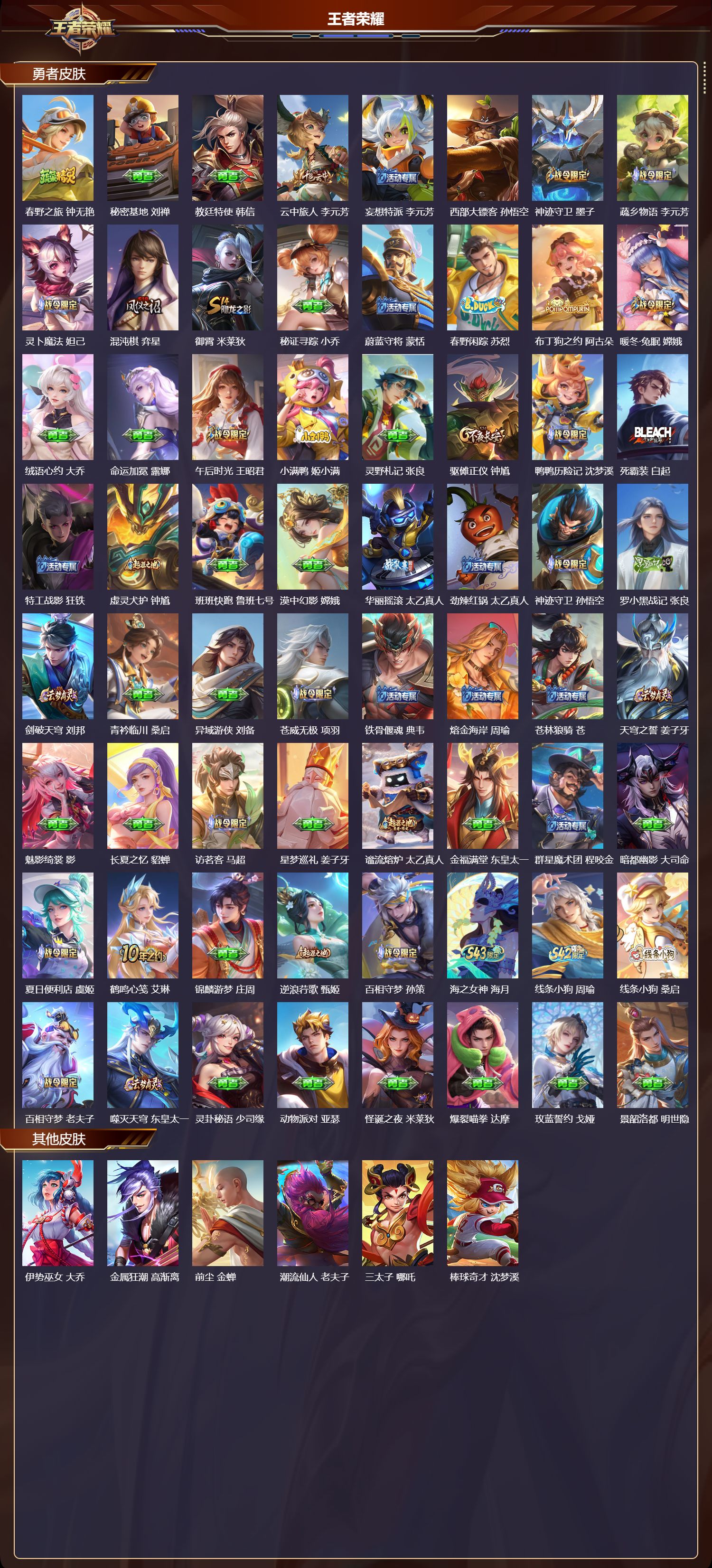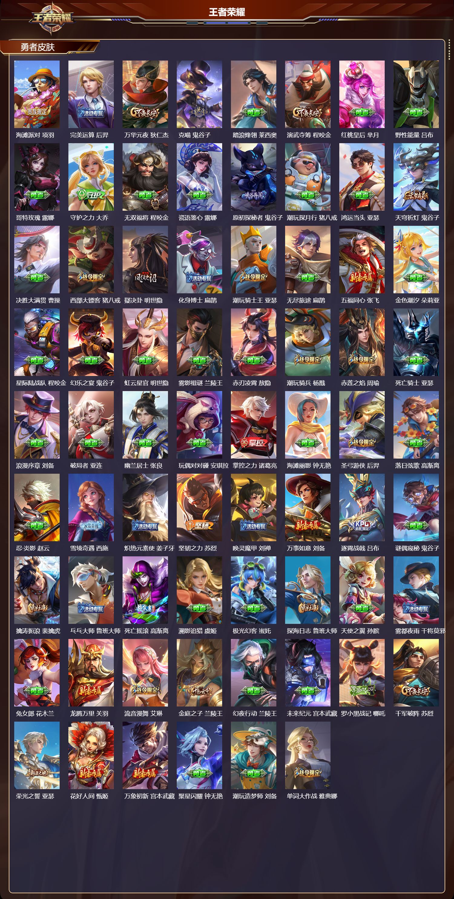 【172,勇者皮肤】时空谍影,海诺,玲珑珍味,西施,圆桌骑士,盾山,爱心护理,阿轲,太极少年,赵怀真,沙漠行僧,达摩,大漠名商,沈梦溪,暖冬絮语,程咬金,缤纷绘卷,张良,纽约教父,刘备,拳王,达摩,大发明家,达摩,龙舞盛年,沈梦溪,乐园追猎者,白起,丁香结,小乔,功夫炙烤,廉颇,铁甲之心,典韦,幻夜卜梦,芈月,爱与正义,程咬金,海盐诗旅,桑启,幻泉雾影,海月,朔风刀,夏侯惇,醍醐杖,老夫子,归虚梦演,孙膑,热血海滩,哪吒,白色死神,白起,黑桃队长,鲁班七号,黄金武士,典韦,落雪兰心,甄姬,夺宝奇兵,刘邦,御旌,牛魔,阴阳师,狄仁杰,径山谋武,孙权,次元突破,哪吒,古海寻踪,张良,戏梦巡演,空空儿,功夫老勺,老夫子,鲨炮海盗猫,沈梦溪,海滩派对,项羽,完美运算,后羿,万华元夜,狄仁杰,克喵,鬼谷子,踏浪烽翎,莱西奥,演武夺筹,程咬金,红桃皇后,芈月,野性能量,吕布,哥特玫瑰,露娜,守护之力,大乔,无双福将,程咬金,瓷语鉴心,露娜,原初探秘者,鬼谷子,潮玩探月行,猪八戒,鸿运当头,亚瑟,天穹祈灯,鬼谷子,决胜大满贯,曹操,西部大镖客,猪八戒,疑决卦,明世隐,化身博士,扁鹊,潮玩骑士王,亚瑟,无尽旅途,扁鹊,五福同心,张飞,金色潮汐,朵莉亚,星际陆战队,程咬金,幻乐之宴,鬼谷子,虹云星官,明世隐,雾影缉谜,兰陵王,赤刃凌霄,敖隐,潮玩骑兵,杨戬,赤莲之焰,周瑜,死亡骑士,亚瑟,浪漫序章,刘备,破局者,亚连,幽兰居士,张良,玩偶对对碰,安琪拉,掌控之力,诸葛亮,海滩丽影,钟无艳,圣弓游侠,后羿,落日弦歌,高渐离,忍·炎影,赵云,雪境奇遇,西施,炽热元素使,姜子牙,坚韧之力,苏烈,唤灵魔甲,刘禅,万事如意,刘备,逐霄战戟,吕布,谜偶窥秘,鬼谷子,擒涛扼浪,裴擒虎,乓乓大师,鲁班大师,死亡摇滚,高渐离,溯影追猎,虞姬,极光幻客,蚩奼,探海日志,鲁班大师,天使之翼,孙膑,雾都夜雨,干将莫邪,兔女郎,花木兰,龙腾万里,关羽,流音漫舞,艾琳,金庭之子,兰陵王,幻夜行动,兰陵王,未来纪元,宫本武藏,罗小黑战记,哪吒,千军破阵,苏烈,荣光之誓,亚瑟,花好人间,甄姬,万象初新,宫本武藏,聚星闪耀,钟无艳,潮玩造梦师,刘备,单词大作战,雅典娜,春野之旅,钟无艳,秘密基地,刘禅,教廷特使,韩信,云中旅人,李元芳,妄想特派,李元芳,西部大镖客,孙悟空,神迹守卫,墨子,蔬乡物语,李元芳,灵卜魔法,妲己,混沌棋,弈星,御霄,米莱狄,秘证寻踪,小乔,蔚蓝守将,蒙恬,春野闲踪,苏烈,布丁狗之约,阿古朵,暖冬·兔眠,嫦娥,绒语心约,大乔,命运加冕,露娜,午后时光,王昭君,小满鸭,姬小满,灵野札记,张良,驱傩正仪,钟馗,鸭鸭历险记,沈梦溪,死霸装,白起,特工战影,狂铁,虚灵犬护,钟馗,班班快跑,鲁班七号,漠中幻影,嫦娥,华丽摇滚,太乙真人,劲辣红锅,太乙真人,神迹守卫,孙悟空,罗小黑战记,张良,剑破天穹,刘邦,青衿临川,桑启,异域游侠,刘备,苍威无极,项羽,铁骨偃魂,典韦,熔金海岸,周瑜,苍林狼骑,苍,天穹之誓,姜子牙,魅影绮裳,影,长夏之忆,貂蝉,访茗客,马超,星梦巡礼,姜子牙,谧流熔炉,太乙真人,金福满堂,东皇太一,群星魔术团,程咬金,暗都幽影,大司命,夏日便利店,虞姬,鹤鸣心笺,艾琳,锦麟游梦,庄周,逆浪荇歌,甄姬,百相守梦,孙策,海之女神,海月,线条小狗,周瑜,线条小狗,桑启,百相守梦,老夫子,噬灭天穹,东皇太一,灵卦秘语,少司缘,动物派对,亚瑟,怪诞之夜,米莱狄,爆裂喵拳,达摩,玫蓝誓约,戈娅,景韶洛都,明世隐,