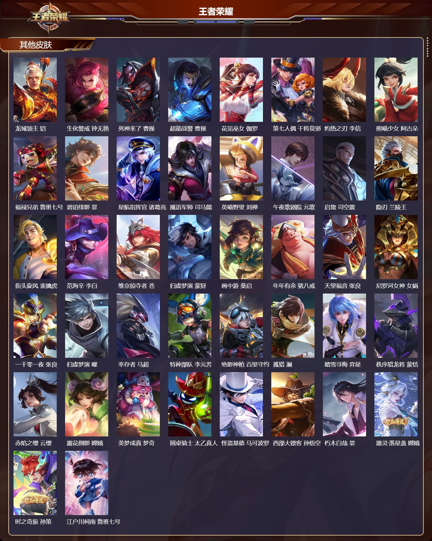 【48,其他皮肤】伊势巫女,大乔,金属狂潮,高渐离,前尘,金蝉,潮流仙人,老夫子,三太子,哪吒,棒球奇才,沈梦溪,龙域领主,铠,生化警戒,钟无艳,死神来了,曹操,超能战警,曹操,花见巫女,伽罗,第七人偶,干将莫邪,灼热之刃,李信,熊喵少女,阿古朵,福禄兄弟,鲁班七号,碧珀绯影,暃,星航指挥官,诸葛亮,魇语军师,司马懿,英喵野望,刘禅,午夜歌剧院,元歌,启蛰,司空震,隐刃,兰陵王,街头旋风,裴擒虎,范海辛,李白,维京掠夺者,苍,归虚梦演,蒙犽,画中游,桑启,年年有余,猪八戒,天堂福音,张良,尼罗河女神,女娲,一千零一夜,张良,归虚梦演,曜,幸存者,马超,特种部队,李元芳,绝影神枪,百里守约,孤猎,澜,踏雪寻梅,弈星,秩序猎龙将,蒙恬,赤焰之缨,云缨,露花倒影,嫦娥,美梦成真,梦奇,圆桌骑士,太乙真人,怪盗基德,马可波罗,西部大镖客,孙悟空,朽木白哉,暃,器灵·落星盏,嫦娥,时之奇旅,孙策,江户川柯南,鲁班七号,