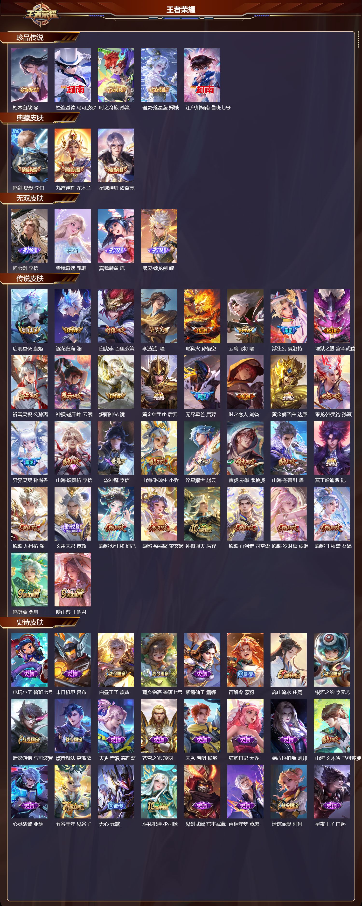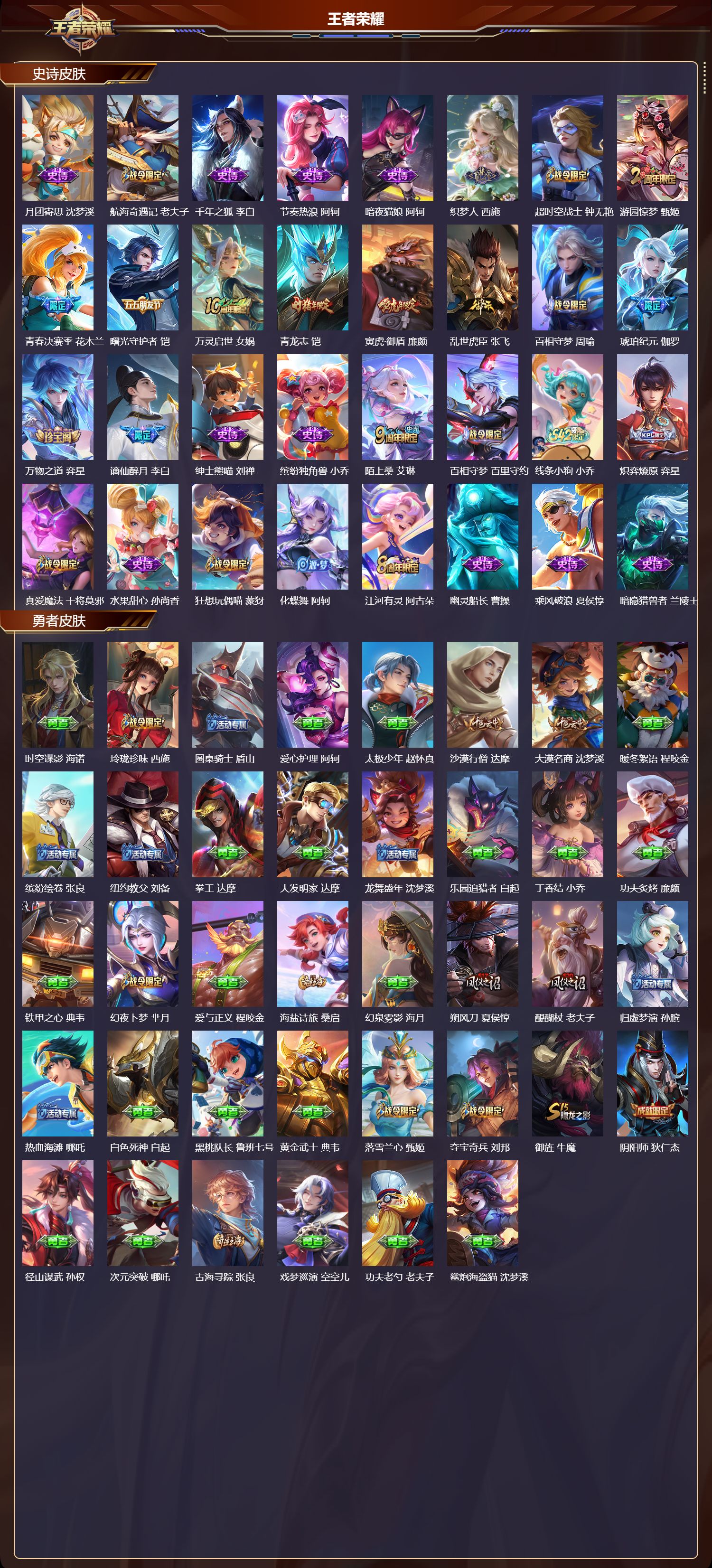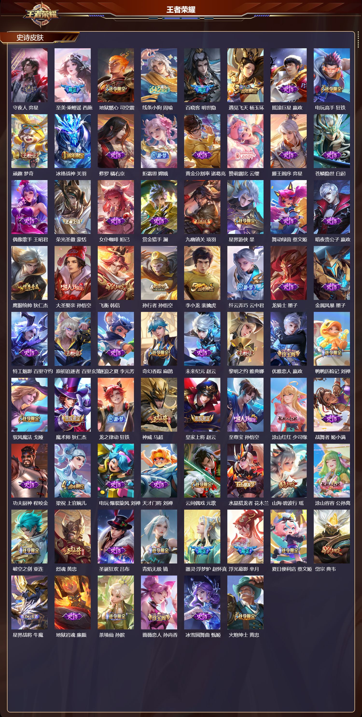 【126,史诗皮肤】电玩小子,鲁班七号,末日机甲,吕布,白昼王子,嬴政,蔬乡物语,鲁班七号,紫霞仙子,露娜,百解令,蒙犽,高山流水,庄周,银河之约,李元芳,暗影游猎,马可波罗,燃音魔法,高渐离,天秀·音浪,高渐离,苍穹之光,项羽,天秀·启明,杨戬,猫狗日记,大乔,德古拉伯爵,刘邦,山海·玄木吟,马可波罗,心灵战警,亚瑟,五谷丰年,鬼谷子,无心,元歌,巫礼祀神,少司缘,鬼剑武藏,宫本武藏,百相守梦,黄忠,迷踪丽影,阿轲,星夜王子,白起,守夜人,弈星,至美·乘鲤谣,西施,地狱燃心,司空震,线条小狗,周瑜,百晓客,明世隐,遇见飞天,杨玉环,摇滚巨星,嬴政,电玩高手,狂铁,顽趣,梦奇,冰锋战神,关羽,修罗,橘右京,拒霜思,嫦娥,黄金分割率,诸葛亮,赞萌露比,云缨,滕王阁序,弈星,苍鳞隐世,白起,偶像歌手,王昭君,荣光圣徽,蒙恬,女仆咖啡,妲己,赏金猎手,澜,九幽镇关,项羽,星界游侠,暃,舞动绿茵,蔡文姬,暗夜贵公子,嬴政,鹰眼统帅,狄仁杰,大圣娶亲,孙悟空,飞衡,韩信,孙行者,孙悟空,李小龙,裴擒虎,纤云弄巧,云中君,龙骑士,墨子,金属风暴,墨子,特工魅影,百里守约,原初追逐者,百里玄策,逐浪之夏,李元芳,奇幻香踪,扁鹊,未来纪元,赵云,黎明之约,雅典娜,优雅恋人,嬴政,鸭鸭历险记,刘禅,驭风魔法,戈娅,魔术师,狄仁杰,龙之律动,狂铁,神威,马超,皇家上将,赵云,至尊宝,孙悟空,涂山红红,少司缘,战舞者,姬小满,功夫厨神,程咬金,梁祝,上官婉儿,电玩·爆裂旋风,刘禅,天才门将,刘禅,云间偶戏,元歌,水晶猎龙者,花木兰,山海·碧波行,瑶,涂山容容,公孙离,破空之剑,亚连,烈魂,黄忠,圣诞狂欢,吕布,青焰无极,镜,器灵·浮梦炉,赵怀真,浮光幕影,芈月,夏日便利店,蔡文姬,岱宗,典韦,星界战将,牛魔,地狱岩魂,廉颇,茶境仙,孙膑,蔷薇恋人,孙尚香,冰雪圆舞曲,甄姬,火炮绅士,黄忠,月团寄思,沈梦溪,航海奇遇记,老夫子,千年之狐,李白,节奏热浪,阿轲,暗夜猫娘,阿轲,织梦人,西施,超时空战士,钟无艳,游园惊梦,甄姬,青春决赛季,花木兰,曙光守护者,铠,万灵启世,女娲,青龙志,铠,寅虎·御盾,廉颇,乱世虎臣,张飞,百相守梦,周瑜,琥珀纪元,伽罗,万物之道,弈星,谪仙醉月,李白,绅士熊喵,刘禅,缤纷独角兽,小乔,陌上桑,艾琳,百相守梦,百里守约,线条小狗,小乔,炽弈燎原,弈星,真爱魔法,干将莫邪,水果甜心,孙尚香,狂想玩偶喵,蒙犽,化蝶舞,阿轲,江河有灵,阿古朵,幽灵船长,曹操,乘风破浪,夏侯惇,暗隐猎兽者,兰陵王,