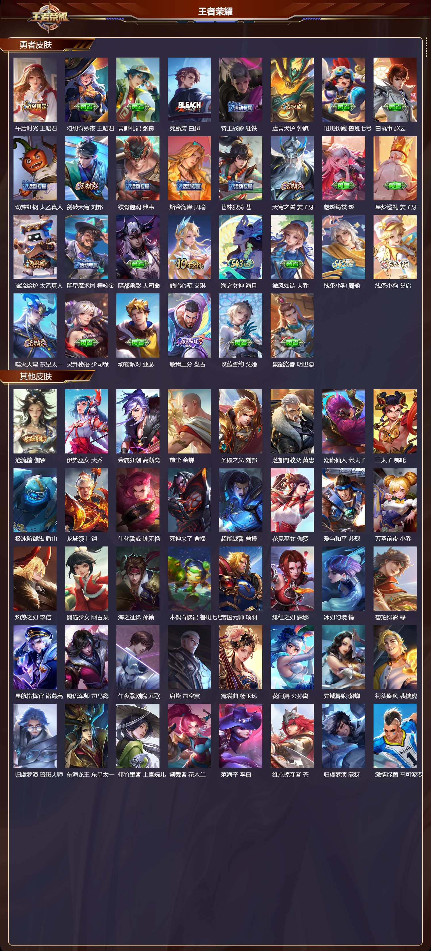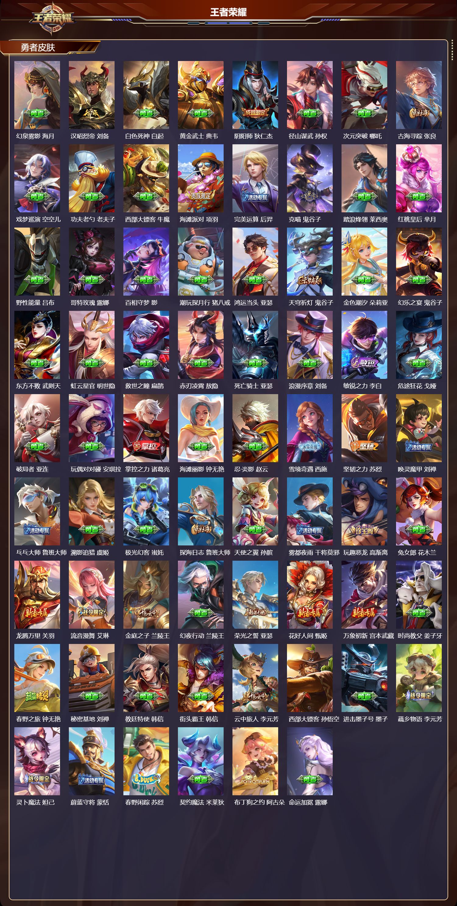 【112,勇者皮肤】时空谍影,海诺,爱心护理,阿轲,沙漠行僧,达摩,大漠名商,沈梦溪,纽约教父,刘备,拳王,达摩,大发明家,达摩,龙舞盛年,沈梦溪,丁香结,小乔,功夫炙烤,廉颇,沉稳之力,孙尚香,海盐诗旅,桑启,幻泉雾影,海月,汉昭烈帝,刘备,白色死神,白起,黄金武士,典韦,阴阳师,狄仁杰,径山谋武,孙权,次元突破,哪吒,古海寻踪,张良,戏梦巡演,空空儿,功夫老勺,老夫子,西部大镖客,牛魔,海滩派对,项羽,完美运算,后羿,克喵,鬼谷子,踏浪烽翎,莱西奥,红桃皇后,芈月,野性能量,吕布,哥特玫瑰,露娜,百相守梦,影,潮玩探月行,猪八戒,鸿运当头,亚瑟,天穹祈灯,鬼谷子,金色潮汐,朵莉亚,幻乐之宴,鬼谷子,东方不败,武则天,虹云星官,明世隐,救世之瞳,扁鹊,赤刃凌霄,敖隐,死亡骑士,亚瑟,浪漫序章,刘备,敏锐之力,李白,危途狂花,戈娅,破局者,亚连,玩偶对对碰,安琪拉,掌控之力,诸葛亮,海滩丽影,钟无艳,忍·炎影,赵云,雪境奇遇,西施,坚韧之力,苏烈,唤灵魔甲,刘禅,乓乓大师,鲁班大师,溯影追猎,虞姬,极光幻客,蚩奼,探海日志,鲁班大师,天使之翼,孙膑,雾都夜雨,干将莫邪,玩趣恶龙,高渐离,兔女郎,花木兰,龙腾万里,关羽,流音漫舞,艾琳,金庭之子,兰陵王,幻夜行动,兰陵王,荣光之誓,亚瑟,花好人间,甄姬,万象初新,宫本武藏,时尚教父,姜子牙,春野之旅,钟无艳,秘密基地,刘禅,教廷特使,韩信,街头霸王,韩信,云中旅人,李元芳,西部大镖客,孙悟空,进击墨子号,墨子,蔬乡物语,李元芳,灵卜魔法,妲己,蔚蓝守将,蒙恬,春野闲踪,苏烈,契约魔法,米莱狄,布丁狗之约,阿古朵,命运加冕,露娜,午后时光,王昭君,幻想奇妙夜,王昭君,灵野札记,张良,死霸装,白起,特工战影,狂铁,虚灵犬护,钟馗,班班快跑,鲁班七号,白执事,赵云,劲辣红锅,太乙真人,剑破天穹,刘邦,铁骨偃魂,典韦,熔金海岸,周瑜,苍林狼骑,苍,天穹之誓,姜子牙,魅影绮裳,影,星梦巡礼,姜子牙,谧流熔炉,太乙真人,群星魔术团,程咬金,暗都幽影,大司命,鹤鸣心笺,艾琳,海之女神,海月,微风如诗,大乔,线条小狗,周瑜,线条小狗,桑启,噬灭天穹,东皇太一,灵卦秘语,少司缘,动物派对,亚瑟,敬我三分,盘古,玫蓝誓约,戈娅,景韶洛都,明世隐,