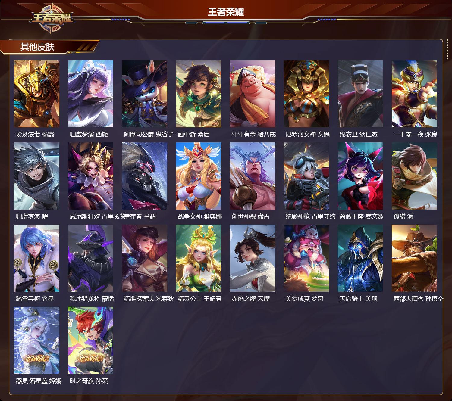 【66,其他皮肤】沧流箭,伽罗,伊势巫女,大乔,金属狂潮,高渐离,前尘,金蝉,圣殿之光,刘邦,芝加哥教父,黄忠,潮流仙人,老夫子,三太子,哪吒,极冰防御线,盾山,龙域领主,铠,生化警戒,钟无艳,死神来了,曹操,超能战警,曹操,花见巫女,伽罗,爱与和平,苏烈,万圣前夜,小乔,灼热之刃,李信,熊喵少女,阿古朵,海之征途,孙策,木偶奇遇记,鲁班七号,帝国元帅,项羽,绯红之刃,露娜,冰刃幻境,镜,碧珀绯影,暃,星航指挥官,诸葛亮,魇语军师,司马懿,午夜歌剧院,元歌,启蛰,司空震,霓裳曲,杨玉环,花间舞,公孙离,异域舞娘,貂蝉,街头旋风,裴擒虎,归虚梦演,鲁班大师,东海龙王,东皇太一,修竹墨客,上官婉儿,剑舞者,花木兰,范海辛,李白,维京掠夺者,苍,归虚梦演,蒙犽,激情绿茵,马可波罗,埃及法老,杨戬,归虚梦演,西施,阿摩司公爵,鬼谷子,画中游,桑启,年年有余,猪八戒,尼罗河女神,女娲,锦衣卫,狄仁杰,一千零一夜,张良,归虚梦演,曜,威尼斯狂欢,百里玄策,幸存者,马超,战争女神,雅典娜,创世神祝,盘古,绝影神枪,百里守约,蔷薇王座,蔡文姬,孤猎,澜,踏雪寻梅,弈星,秩序猎龙将,蒙恬,精准探案法,米莱狄,精灵公主,王昭君,赤焰之缨,云缨,美梦成真,梦奇,天启骑士,关羽,西部大镖客,孙悟空,器灵·落星盏,嫦娥,时之奇旅,孙策,