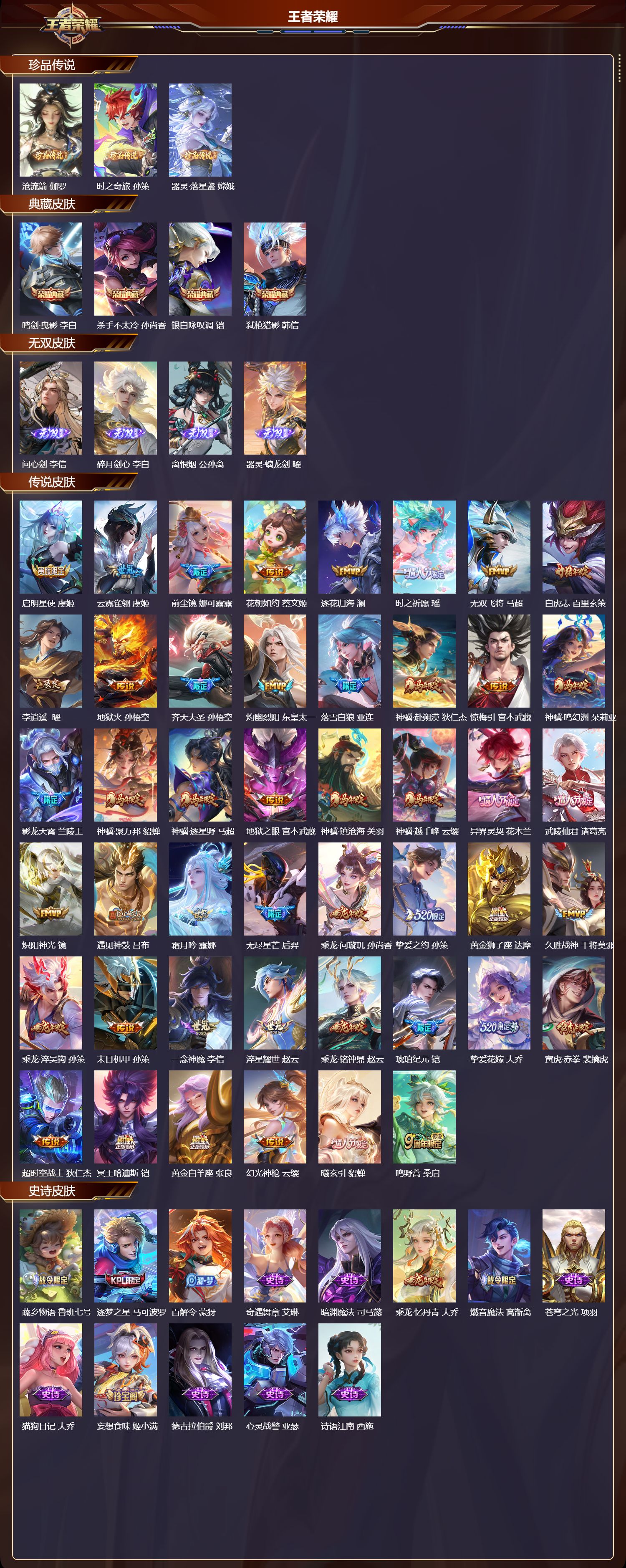 【46,传说皮肤】启明星使,虞姬,云霓雀翎,虞姬,前尘镜,娜可露露,花朝如约,蔡文姬,逐花归海,澜,时之祈愿,瑶,无双飞将,马超,白虎志,百里玄策,李逍遥,,曜,地狱火,孙悟空,齐天大圣,孙悟空,灼幽烈阳,东皇太一,落雪白狼,亚连,神骥·赴朔漠,狄仁杰,惊梅引,宫本武藏,神骥·鸣幻洲,朵莉亚,影龙天霄,兰陵王,神骥·聚万邦,貂蝉,神骥·逐星野,马超,地狱之眼,宫本武藏,神骥·镇沧海,关羽,神骥·越千峰,云缨,异界灵契,花木兰,武陵仙君,诸葛亮,炽阳神光,镜,遇见神鼓,吕布,霜月吟,露娜,无尽星芒,后羿,乘龙·问璇玑,孙尚香,挚爱之约,孙策,黄金狮子座,达摩,久胜战神,干将莫邪,乘龙·淬吴钩,孙策,末日机甲,孙策,一念神魔,李信,淬星耀世,赵云,乘龙·铭钟鼎,赵云,琥珀纪元,铠,挚爱花嫁,大乔,寅虎·赤拳,裴擒虎,超时空战士,狄仁杰,冥王哈迪斯,铠,黄金白羊座,张良,幻光神枪,云缨,曦玄引,貂蝉,鸣野蒿,桑启,